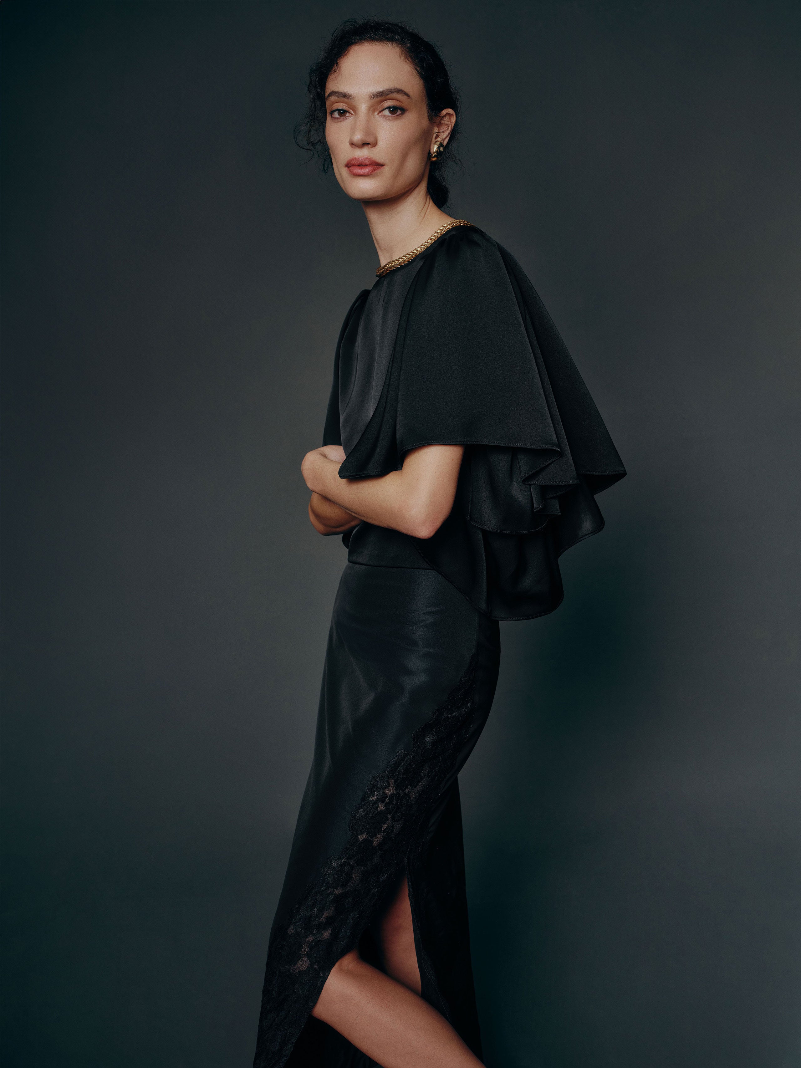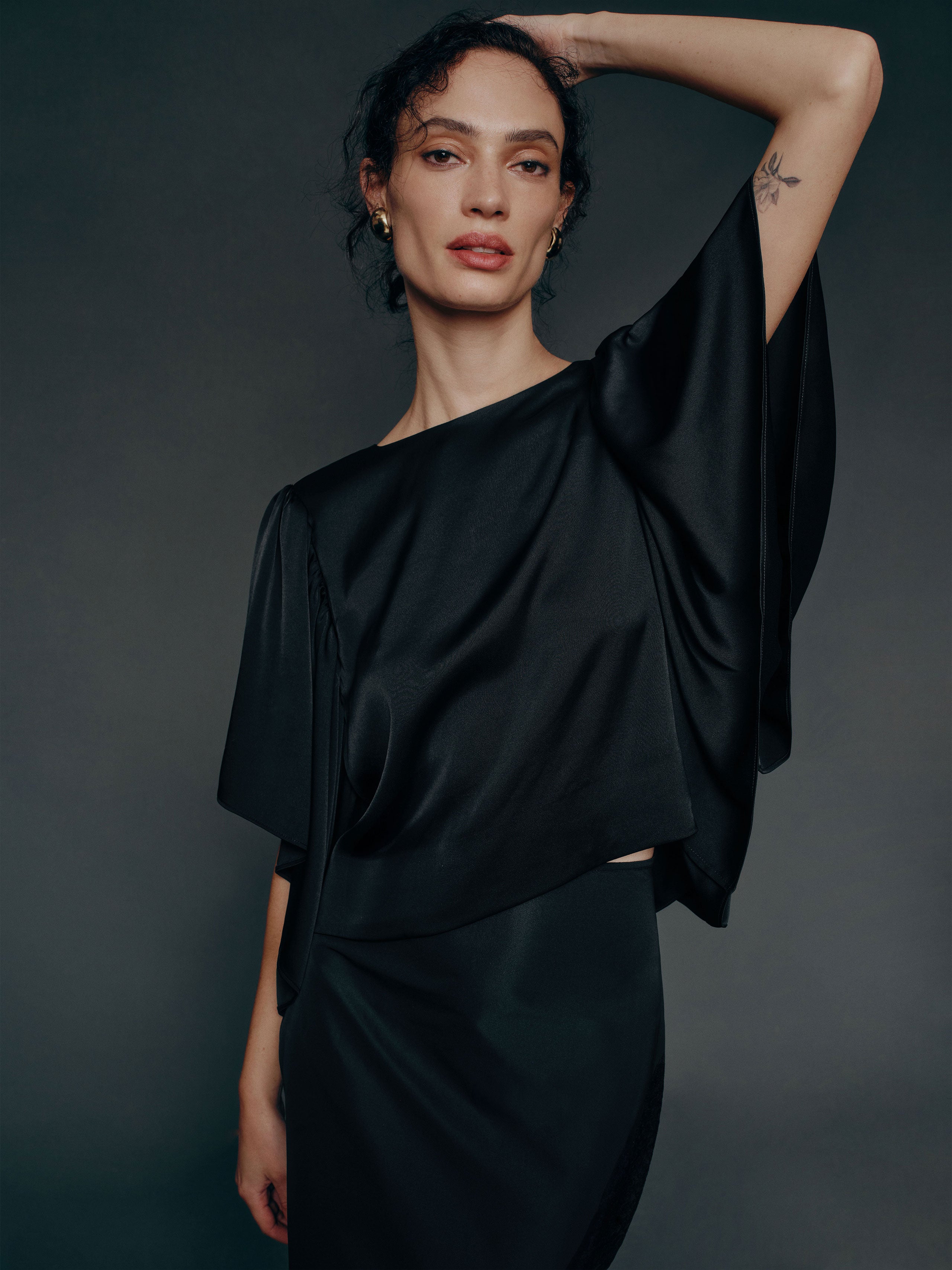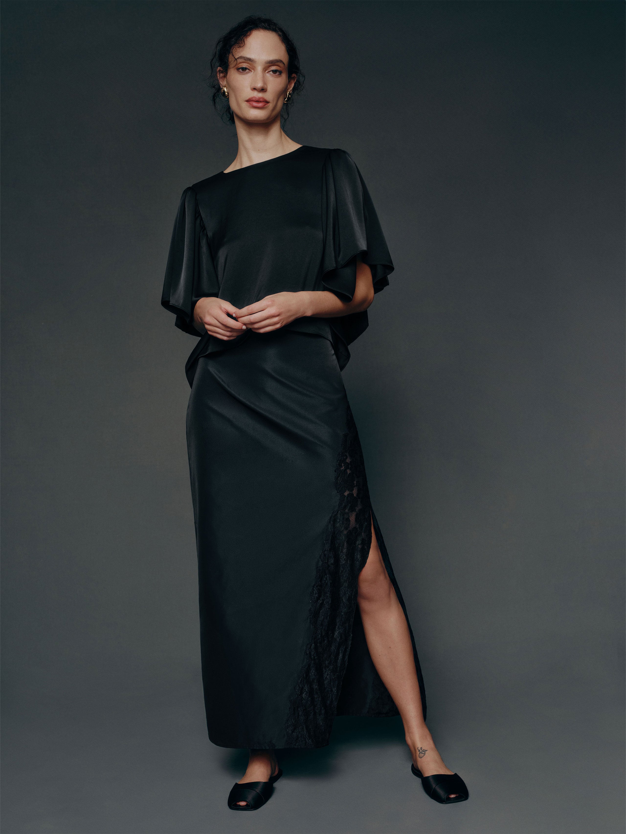 Up top. Shop the Maddox Top from Reformation, a short-sleeve top with a crew neckline and oversized flutter sleeves.