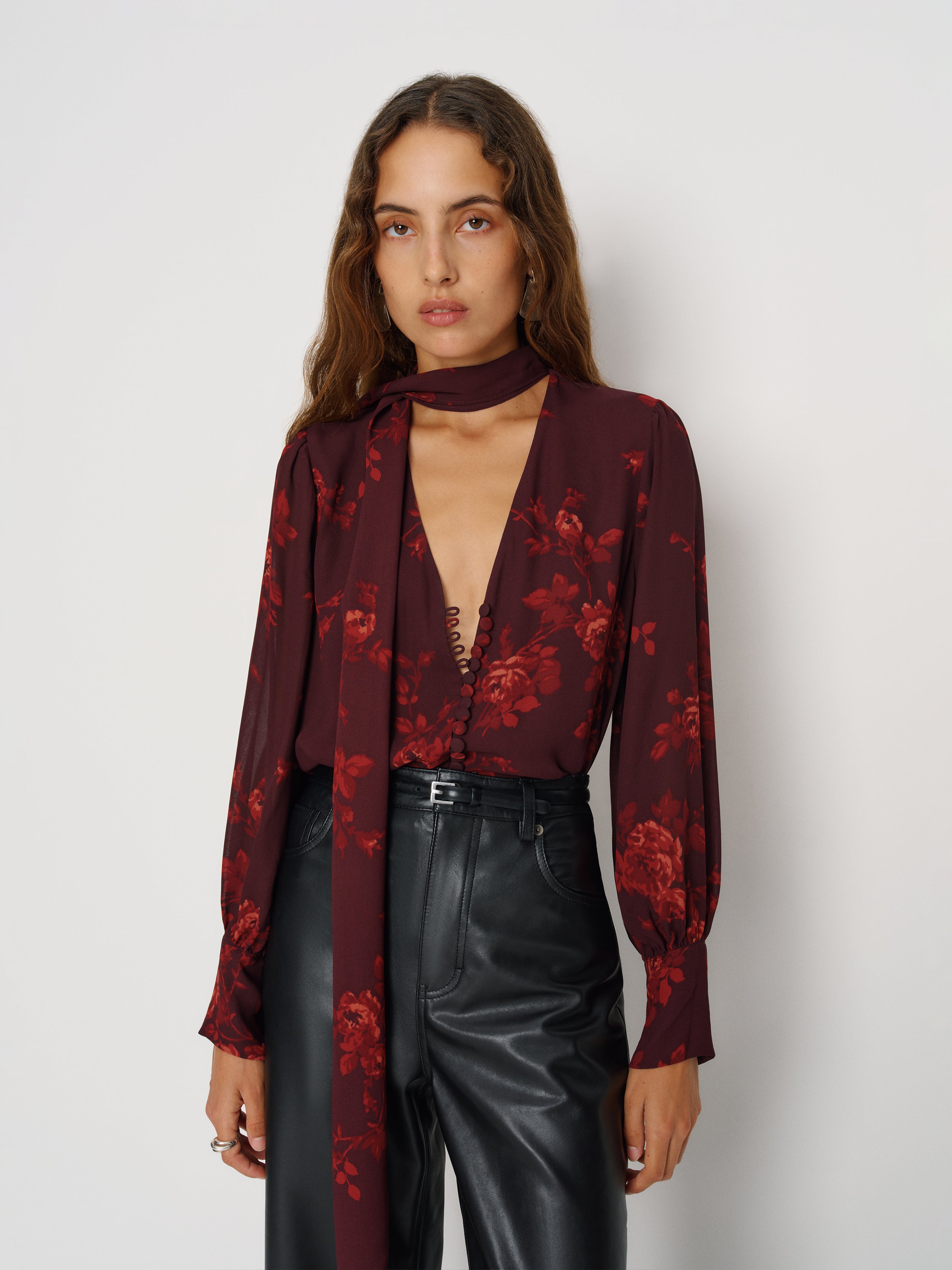 Detail oriented. Shop the Mads Oversized Top from Reformation, a long-sleeved top with a tie neckline and button closure. What good outfits are made of.