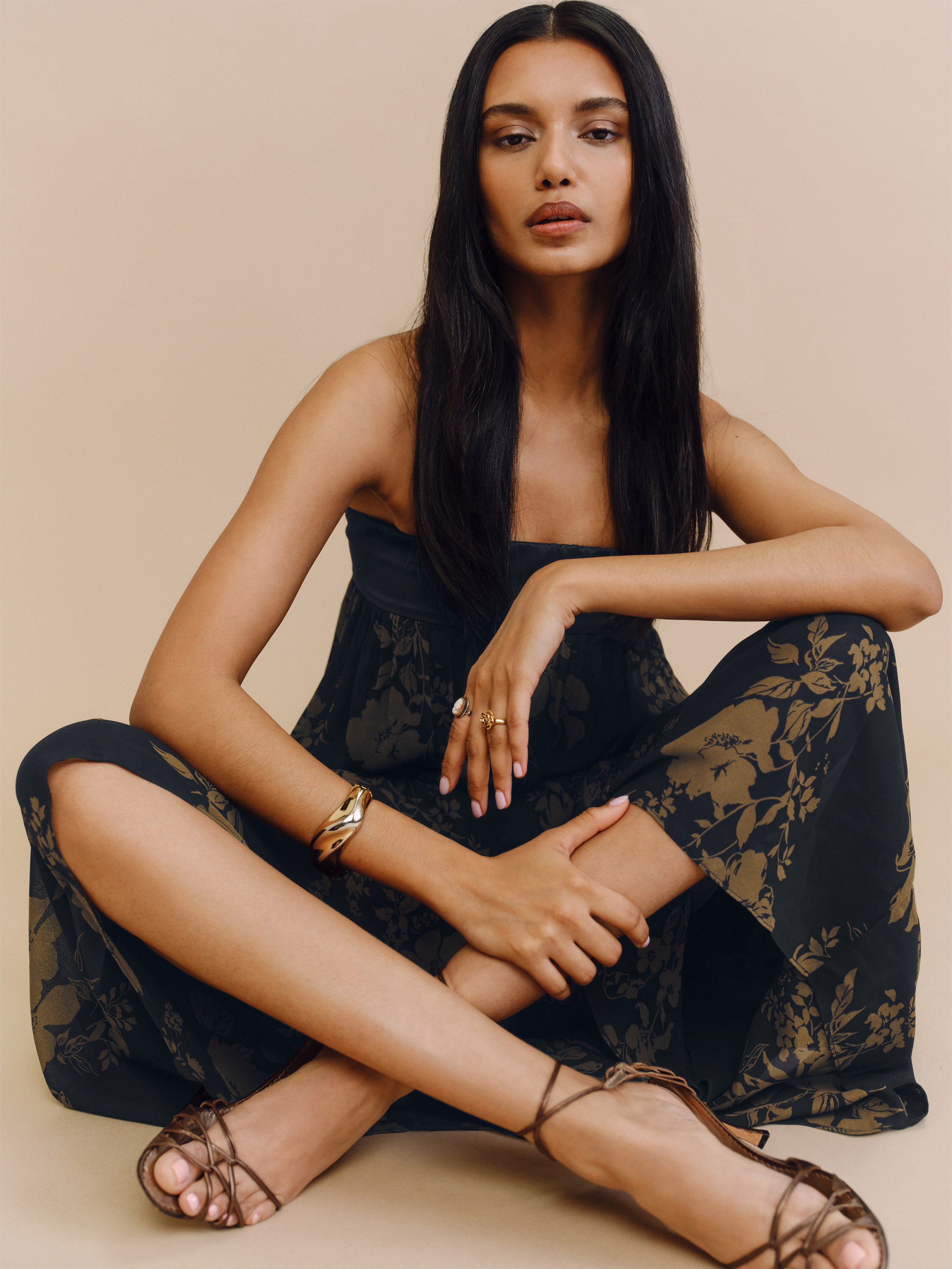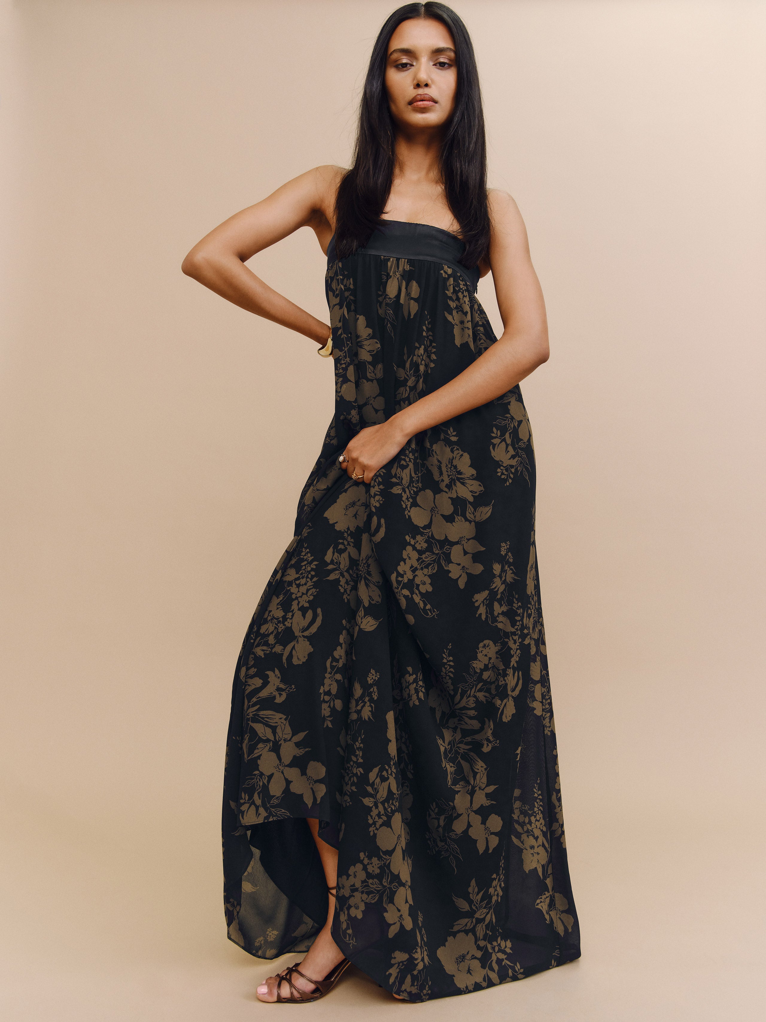You flirt. Shop the Maribelle Dress from Reformation, a strapless maxi dress with pleating. Dress it up...