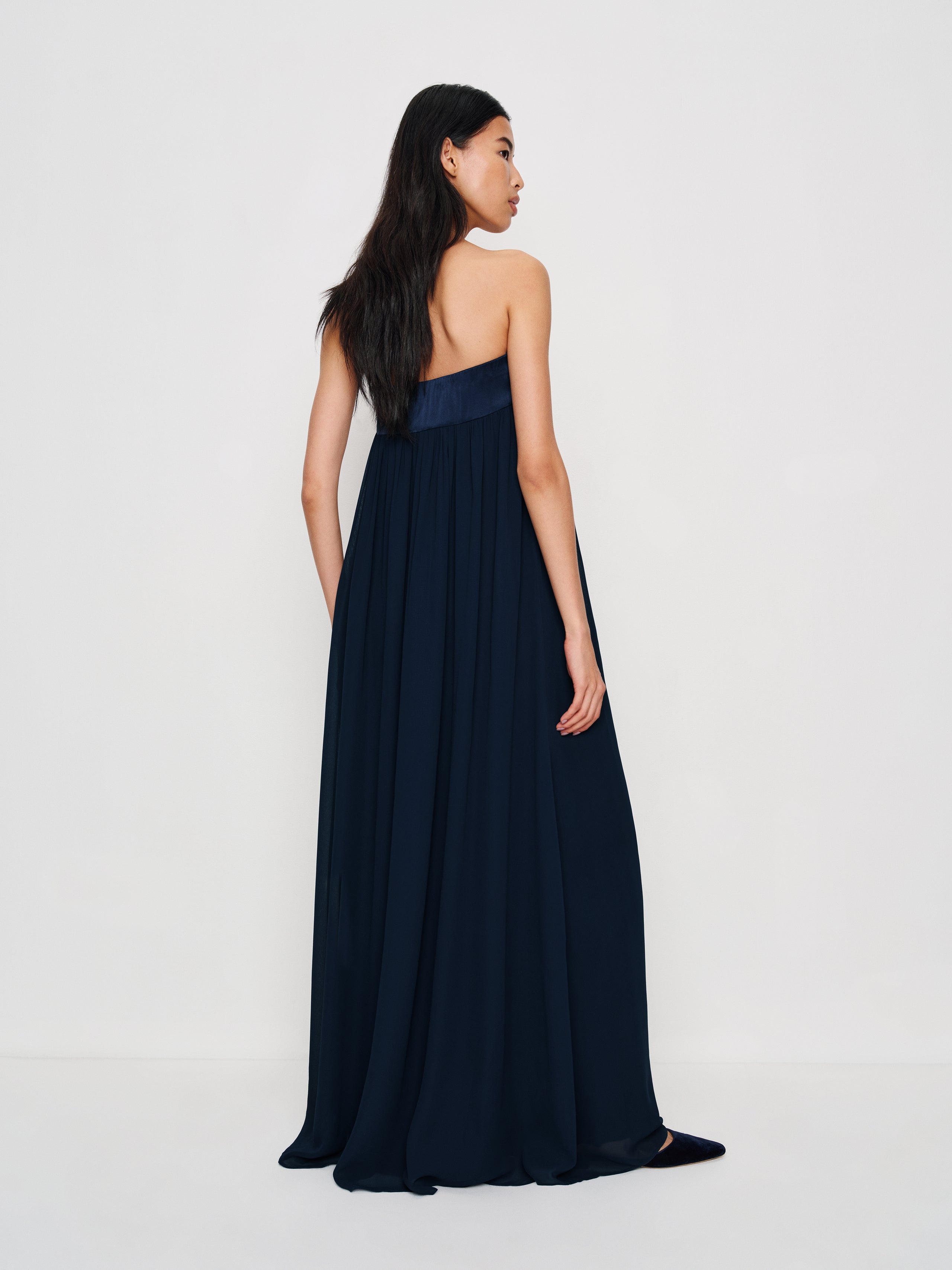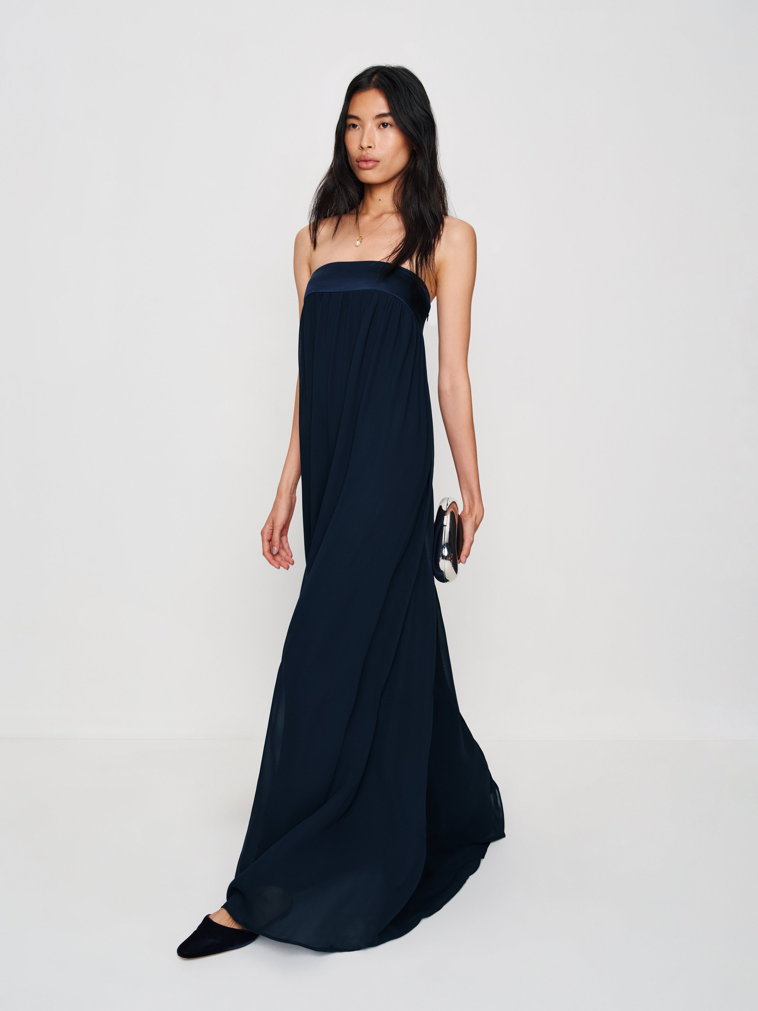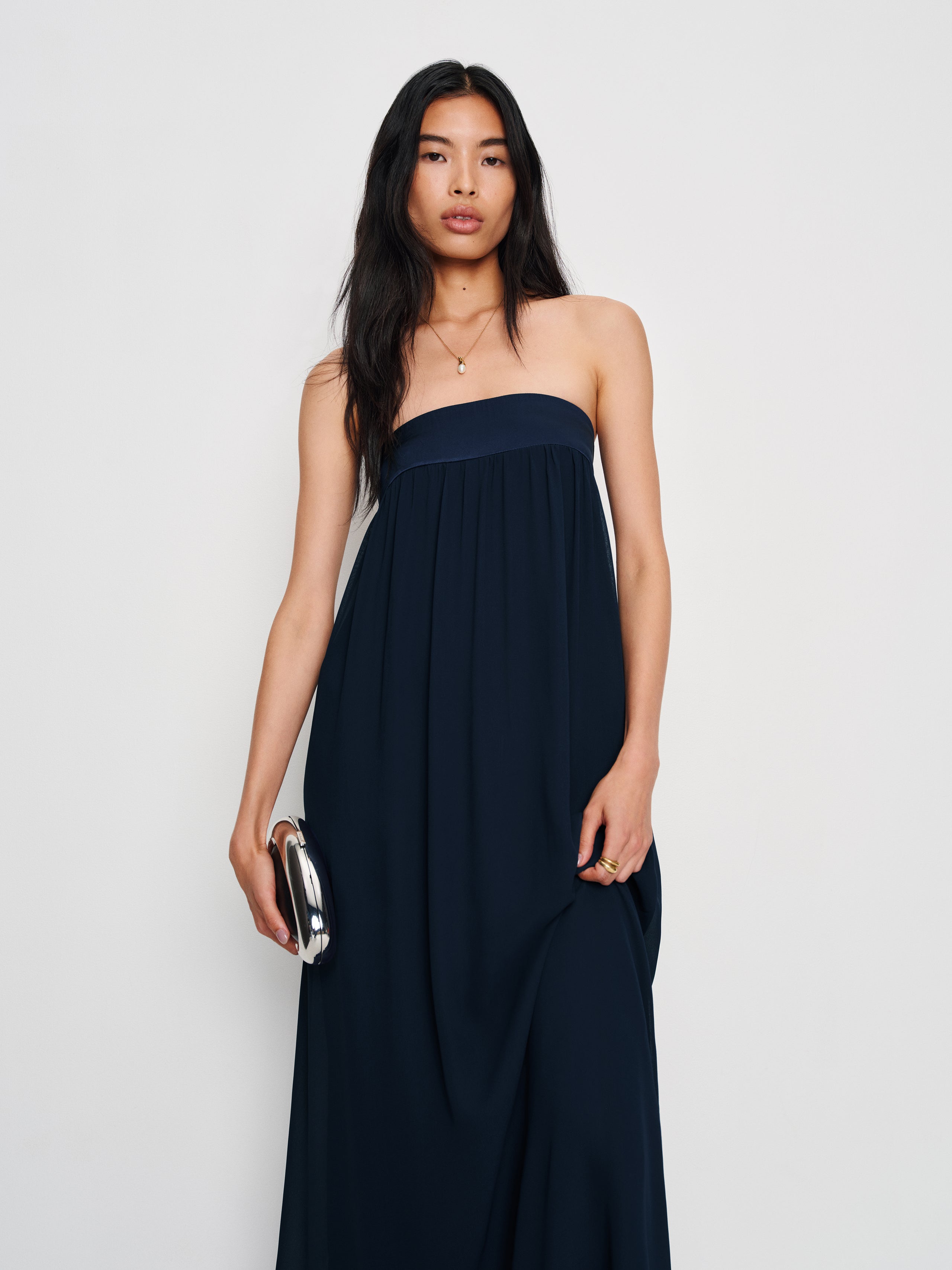 You flirt. Shop the Maribelle Dress from Reformation, a strapless maxi dress with pleating. Dress it up...