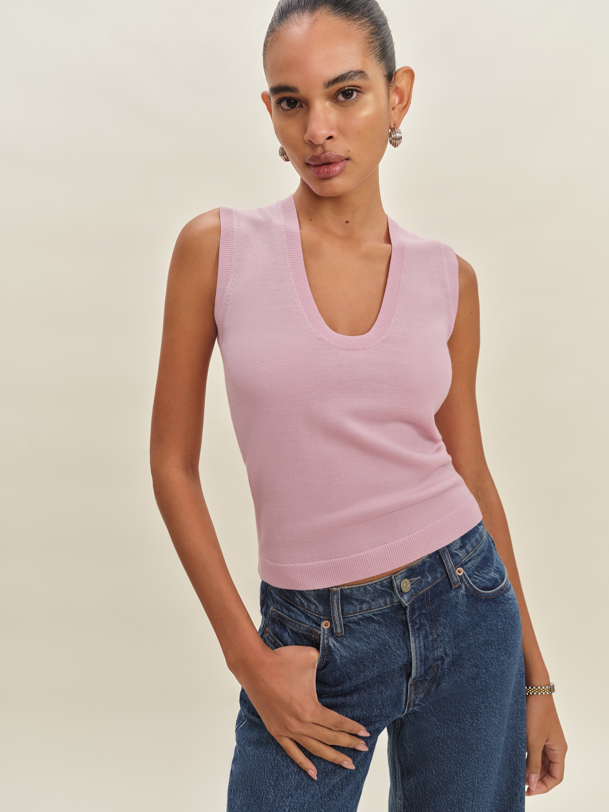 Up top. Shop the Marta Regenerative Merino Sweater Tank from Reformation, a sleeveless sweater tank with a...