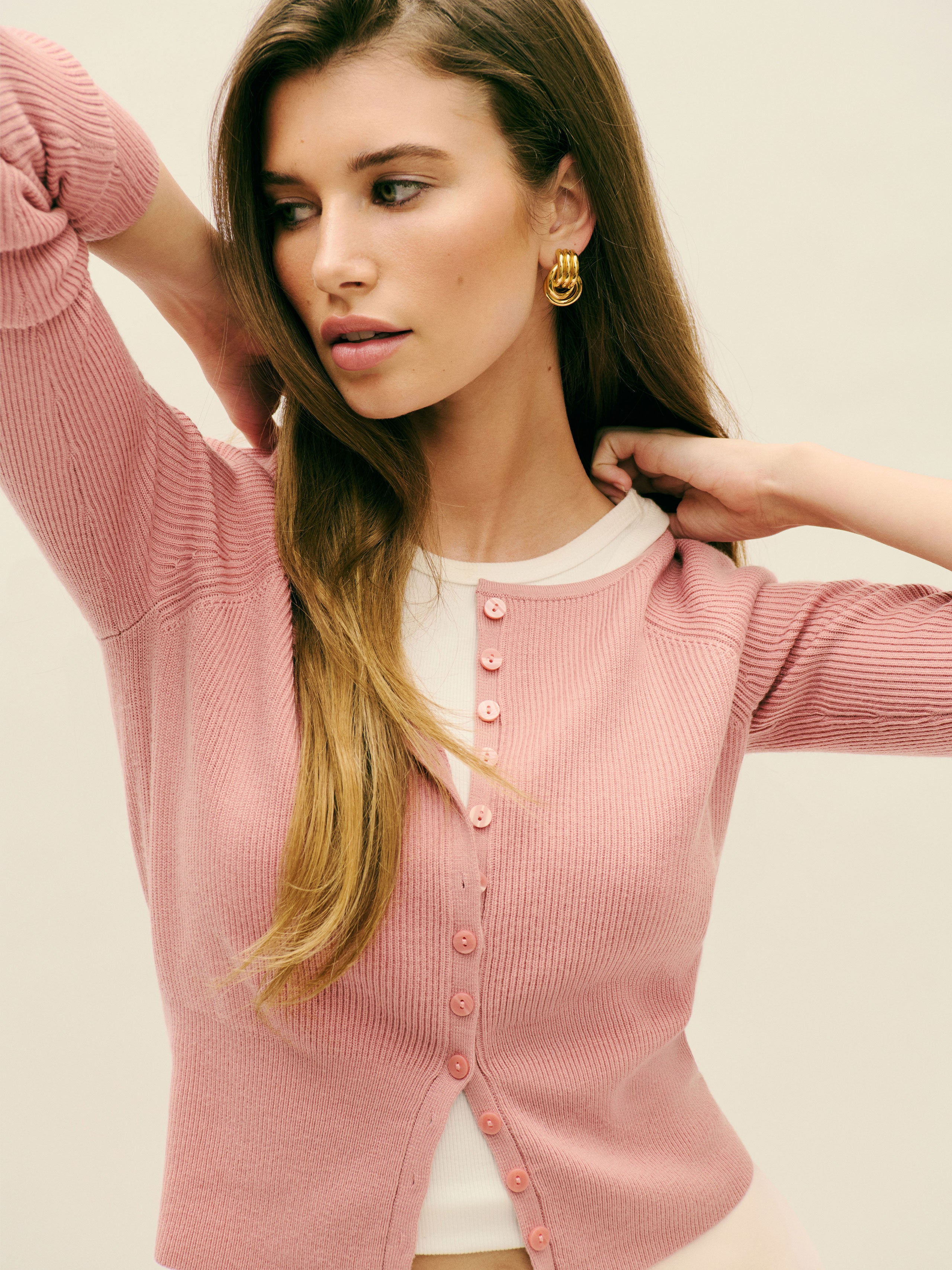 Layer up. Shop the Meadow Regenerative Merino Cardigan from Reformation, a cardigan with ribbing throughout. A styling...