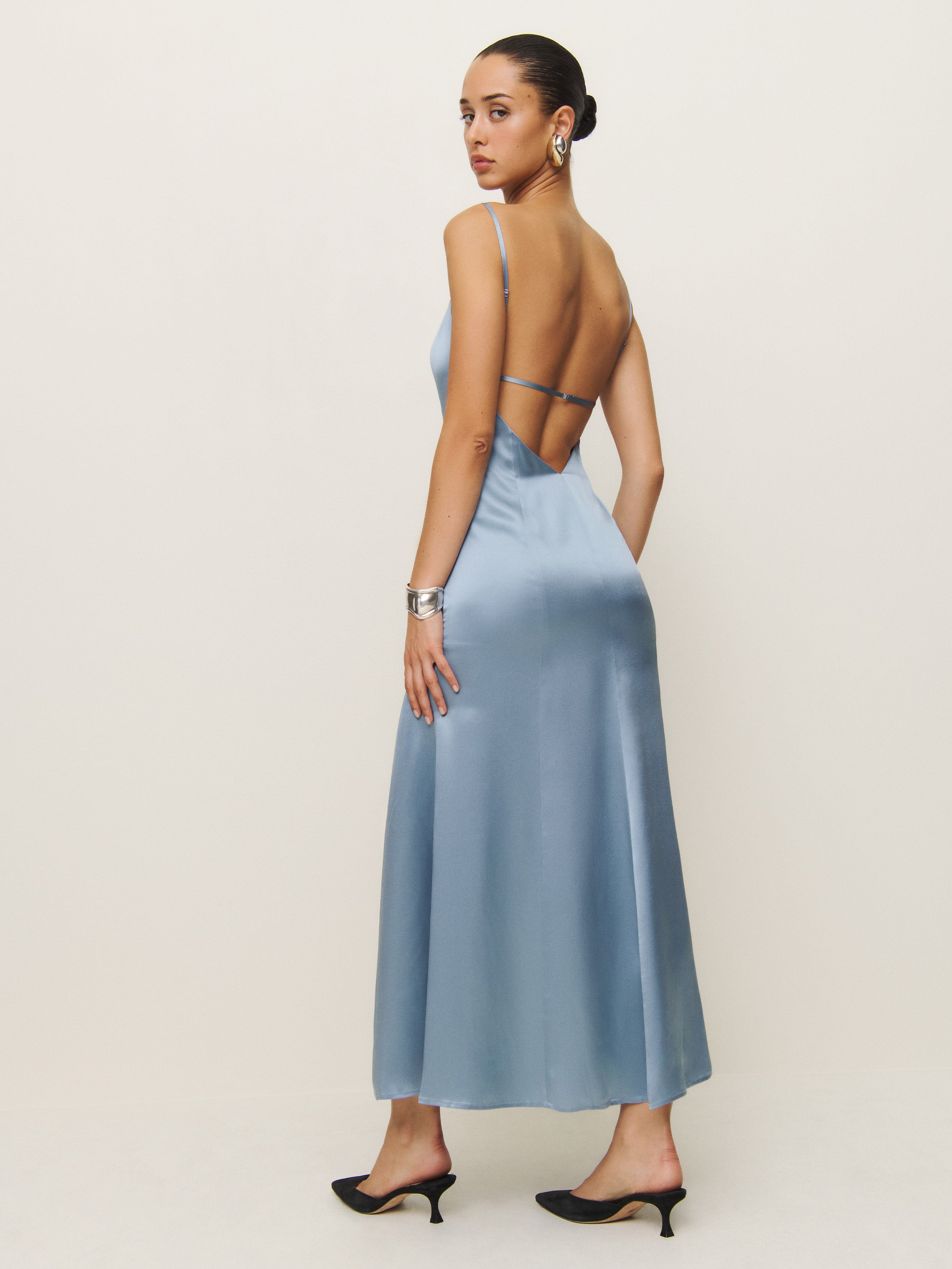 How classic. Shop the Melina Silk Dress from Reformation, a sleeveless full-length dress with a square neckline, open back, and side slit.