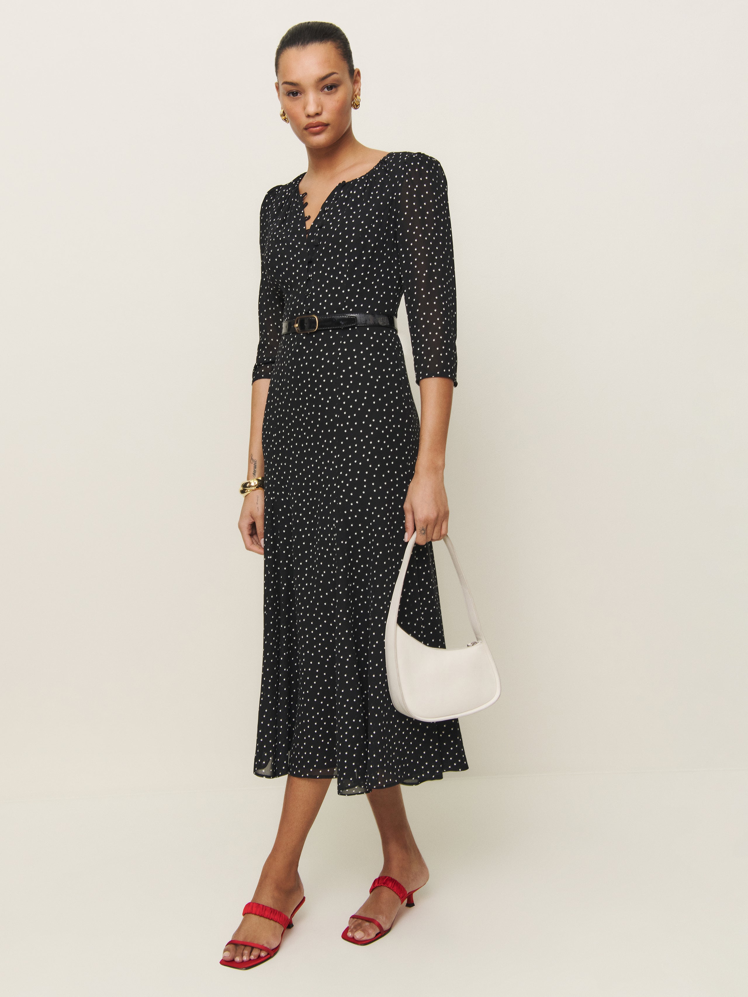 Wear the dress. Shop the Mels Dress from Reformation, a midi dress with 3/4 length sleeves and adjustable buttons at the neckline.