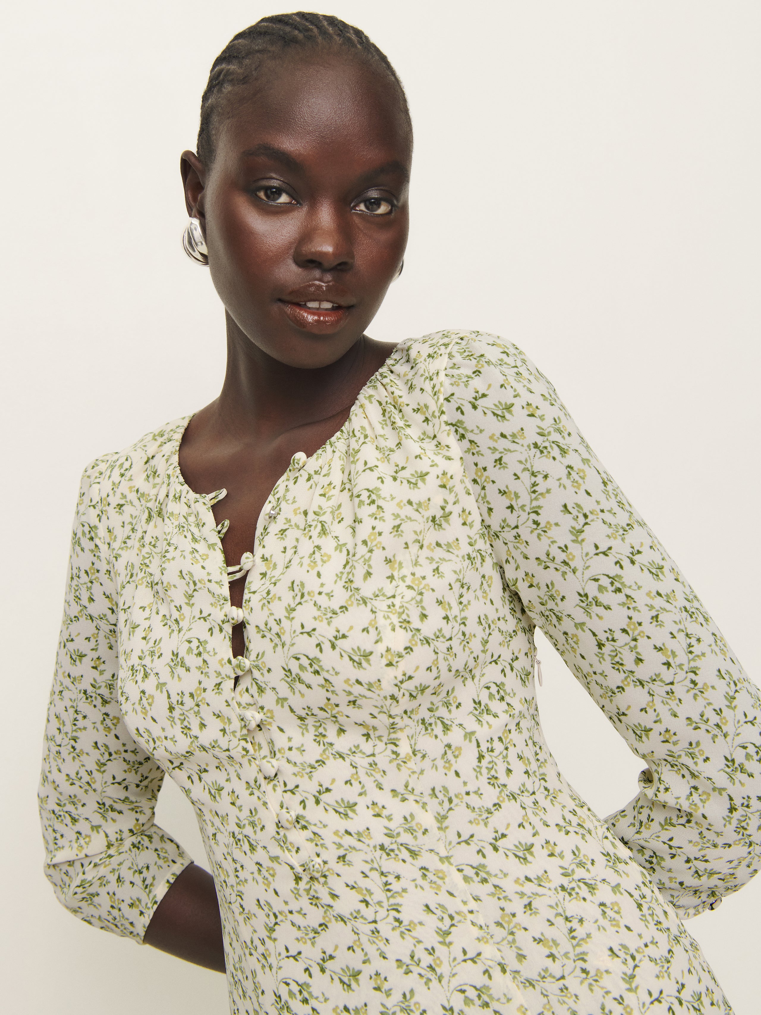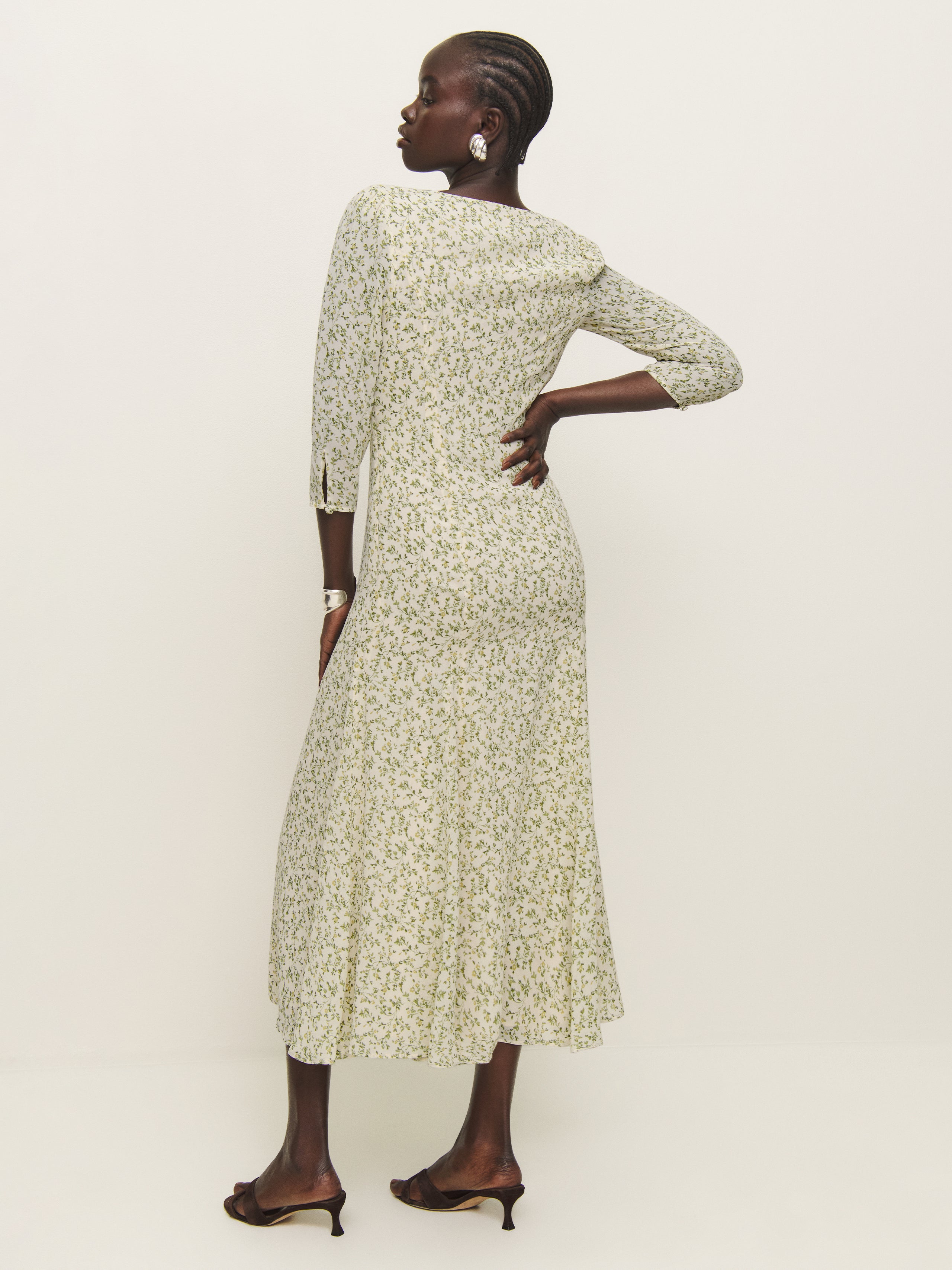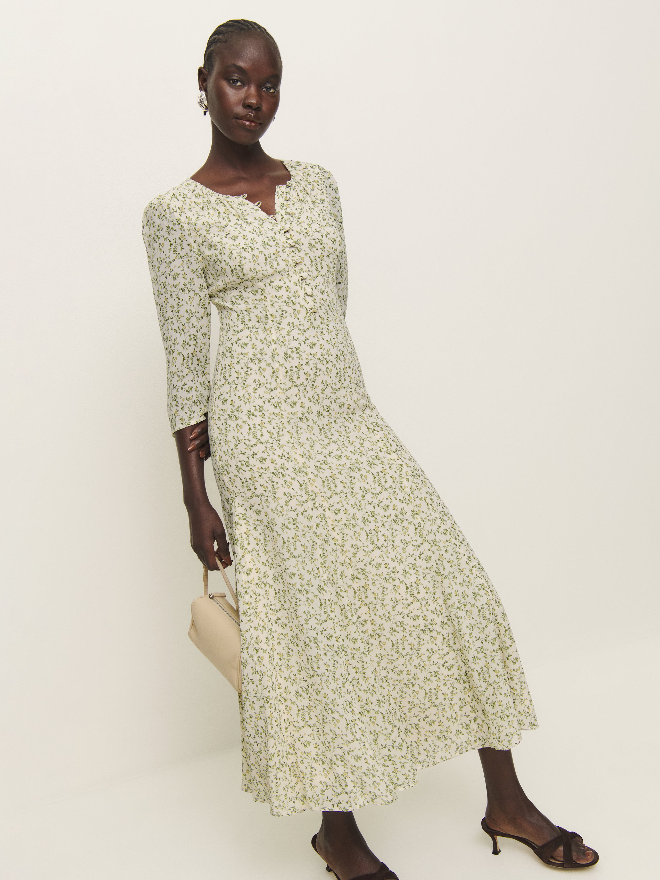 Wear the dress. Shop the Mels Dress from Reformation, a midi dress with 3/4 length sleeves and adjustable buttons at the neckline.