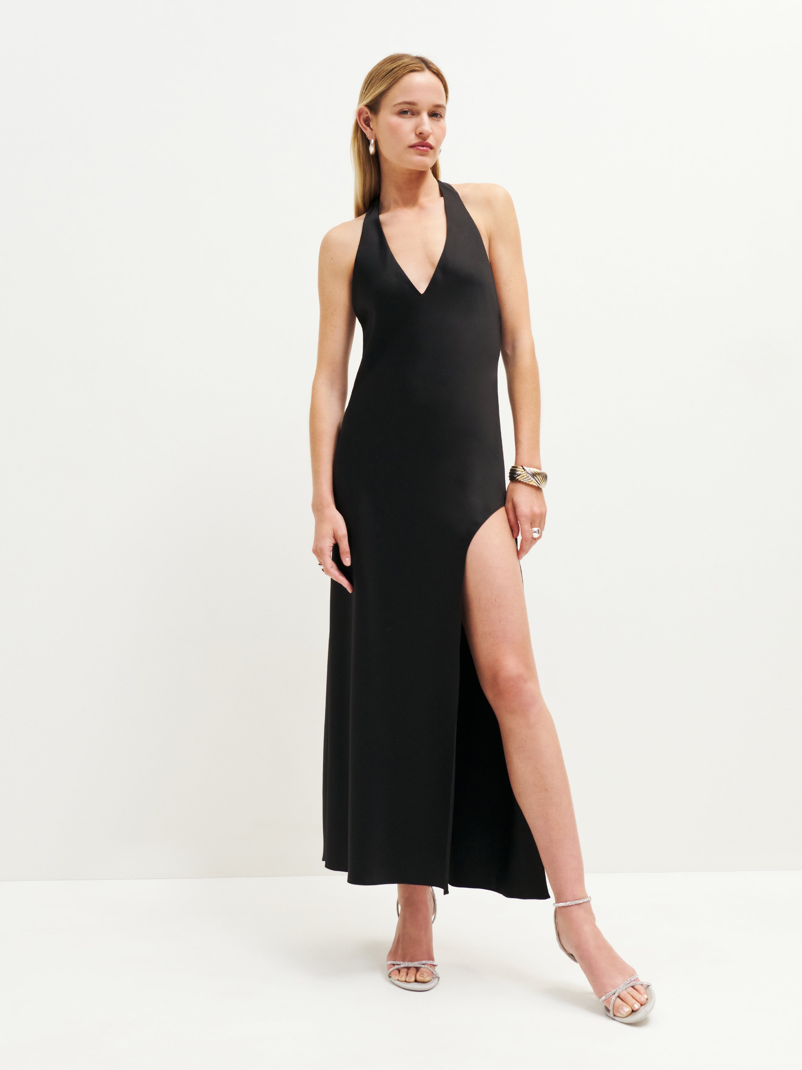 Somebody's fancy. Shop the Meral Satin Dress from Reformation, a sleevless, midi slip dress with an adjustable, halter neckline, open back and high slit.