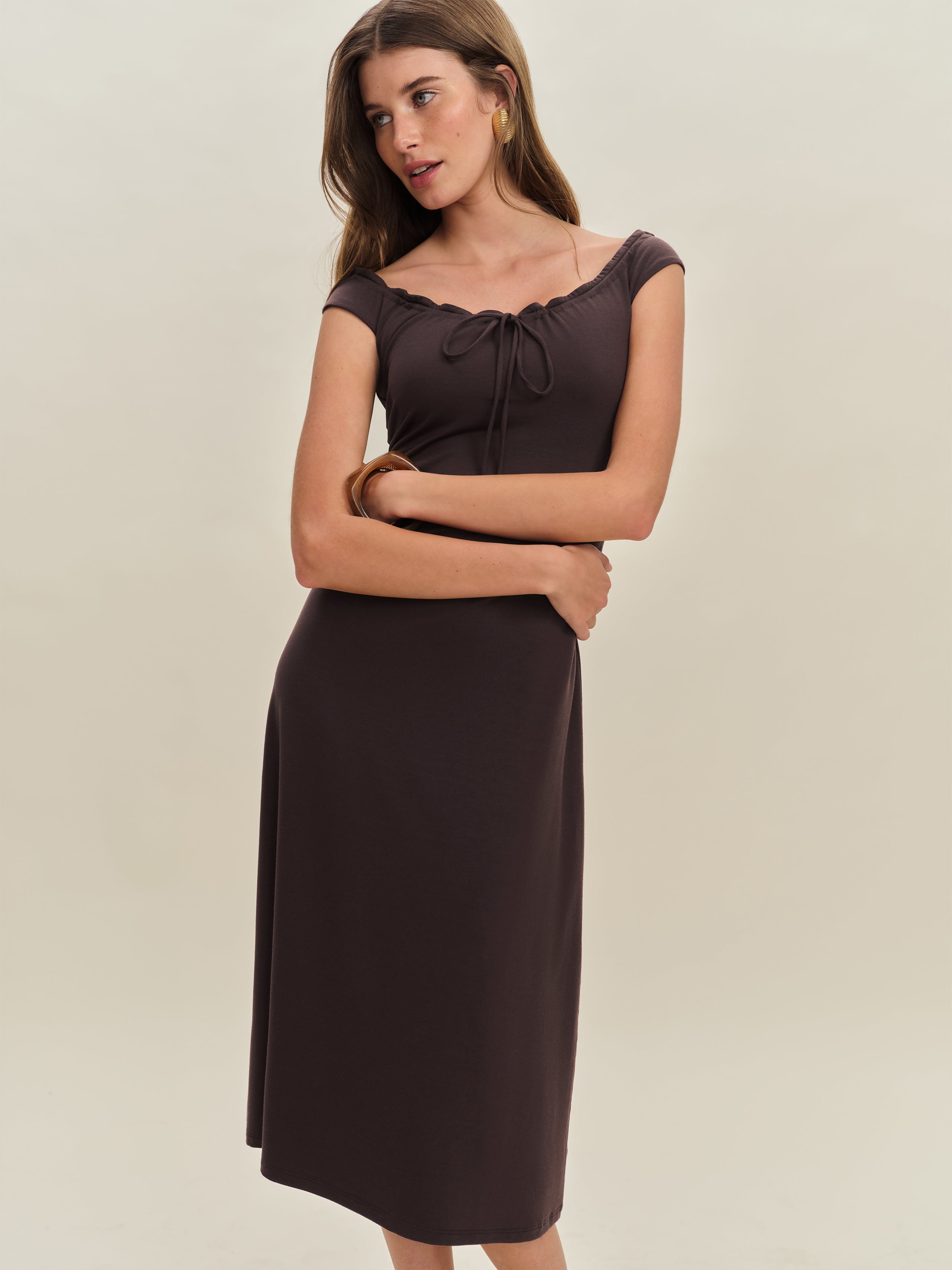 How classic. Shop the Milo Knit Dress from Reformation, an off-the-shoulder midi dress with ruching at the...