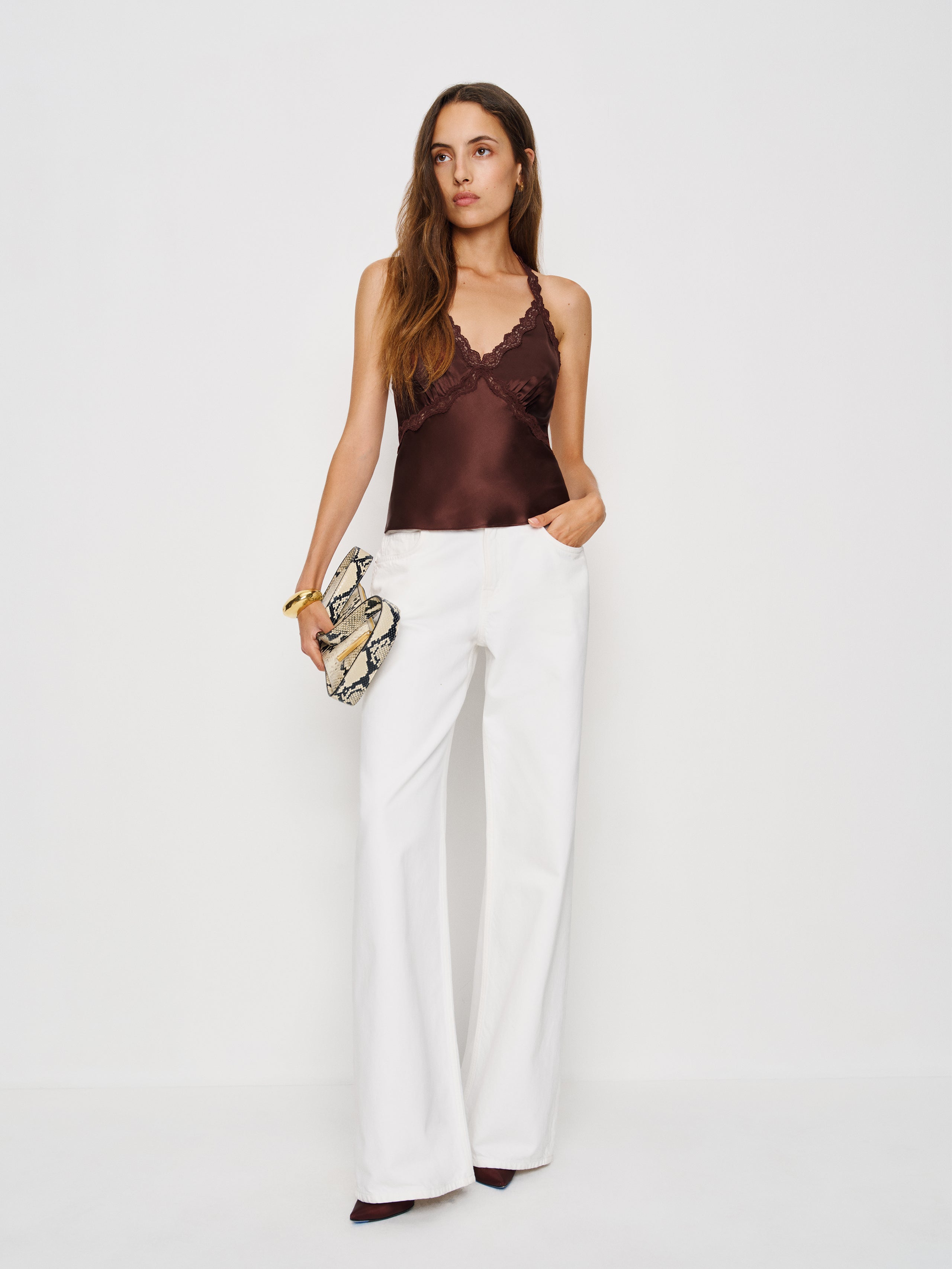 If you have to be fancy soon. Shop the Monica SIlk Top from Reformation, a top with a tie halter neck, lace trim, and an open back.