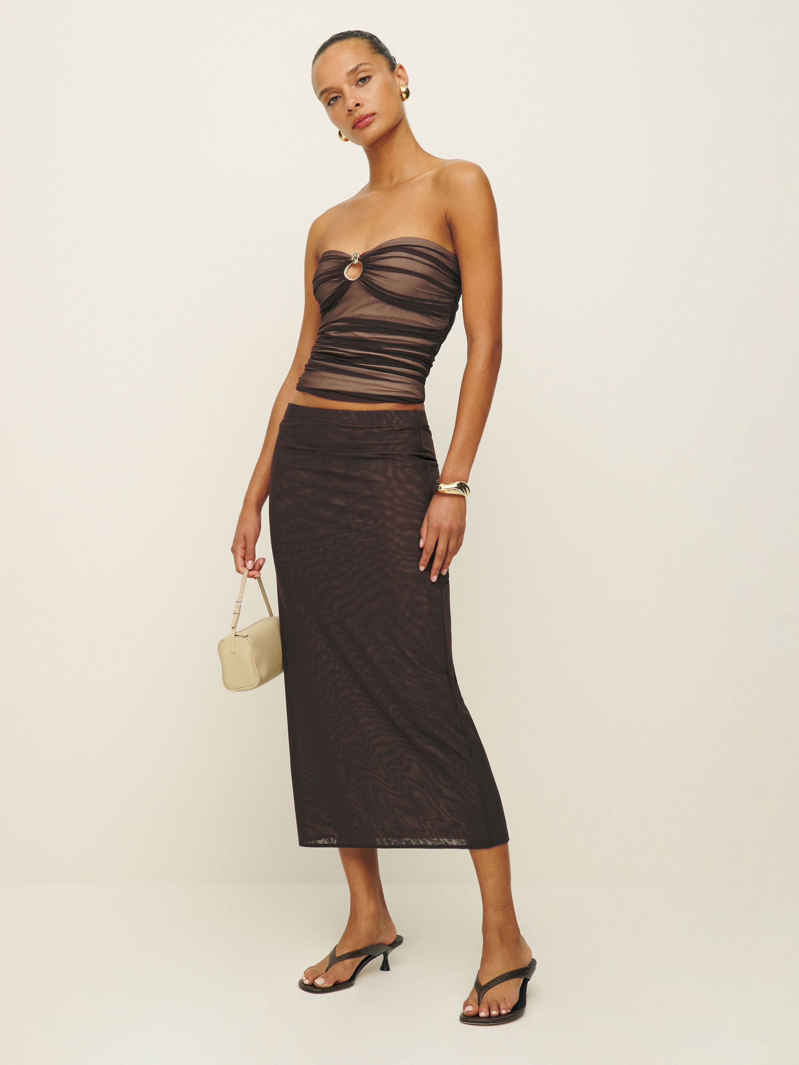 Show some skin. Shop the Myra Knit Top from Reformation, a strapless top with a sweetheart neckline, keyhole cutout, and ruching throughout.