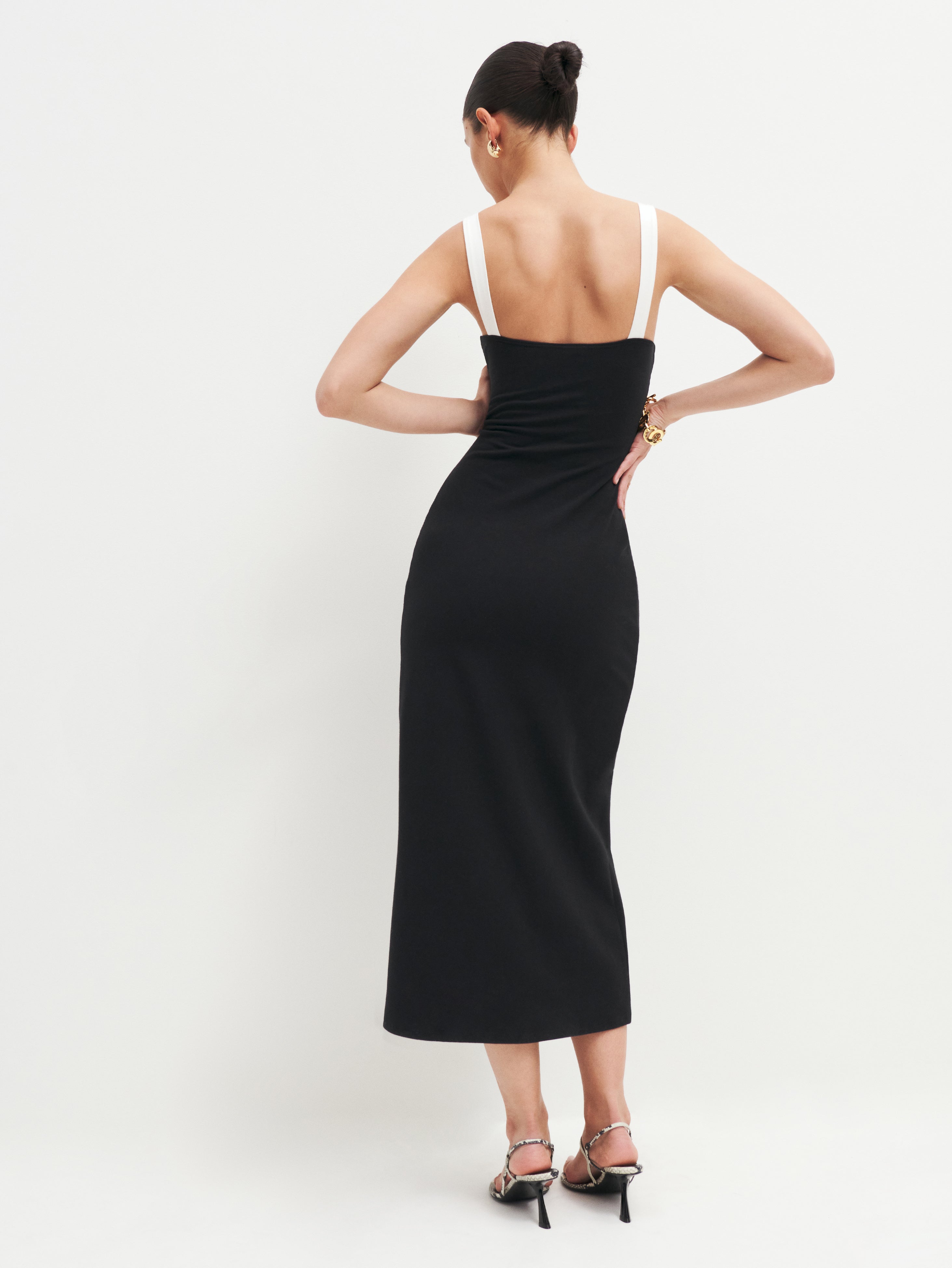All your other dresses are gonna be jealous. Shop the Nelle Knit Dress from Reformation, a midi length, tank dress, with a column skirt and bust detailing.