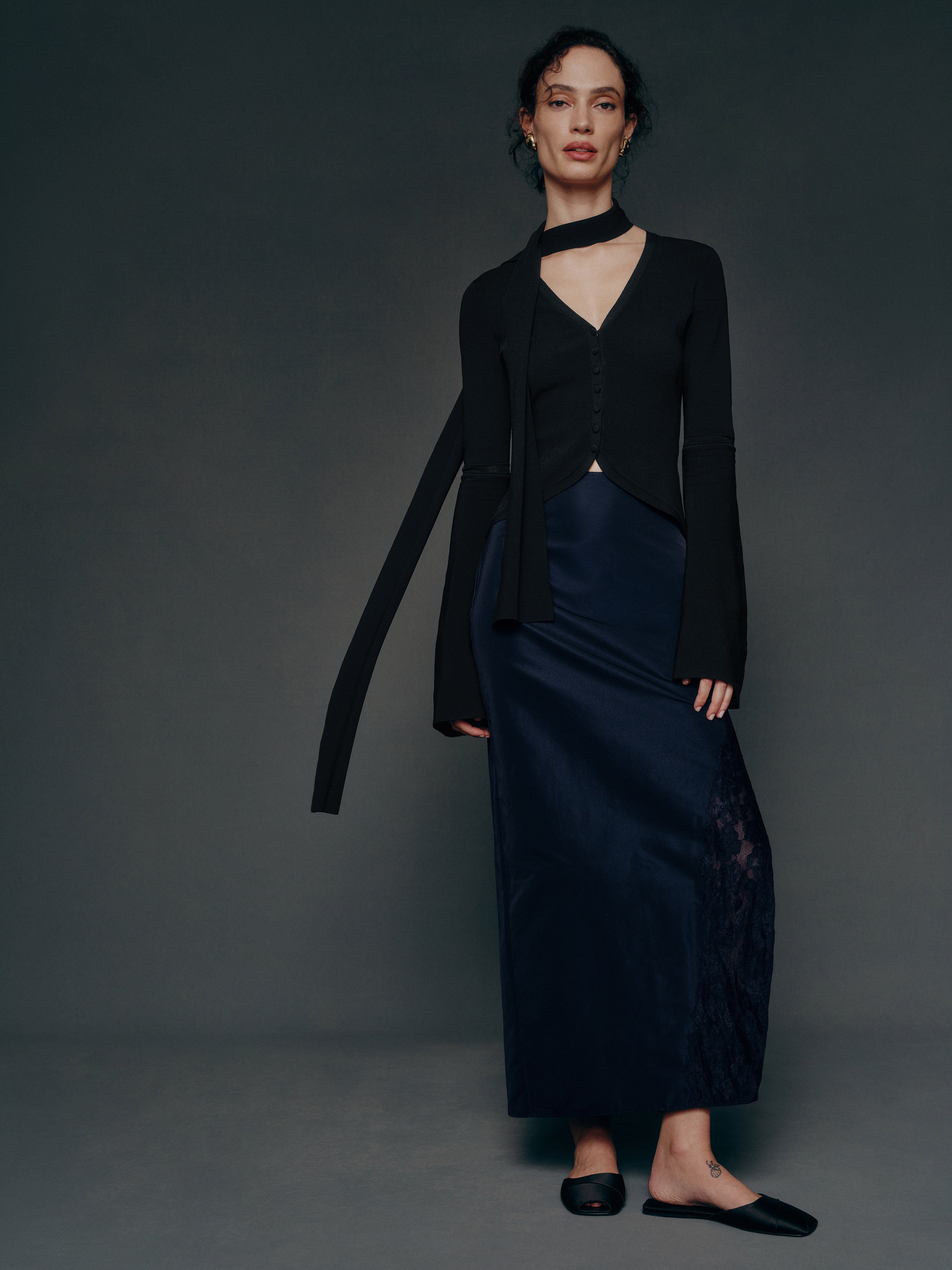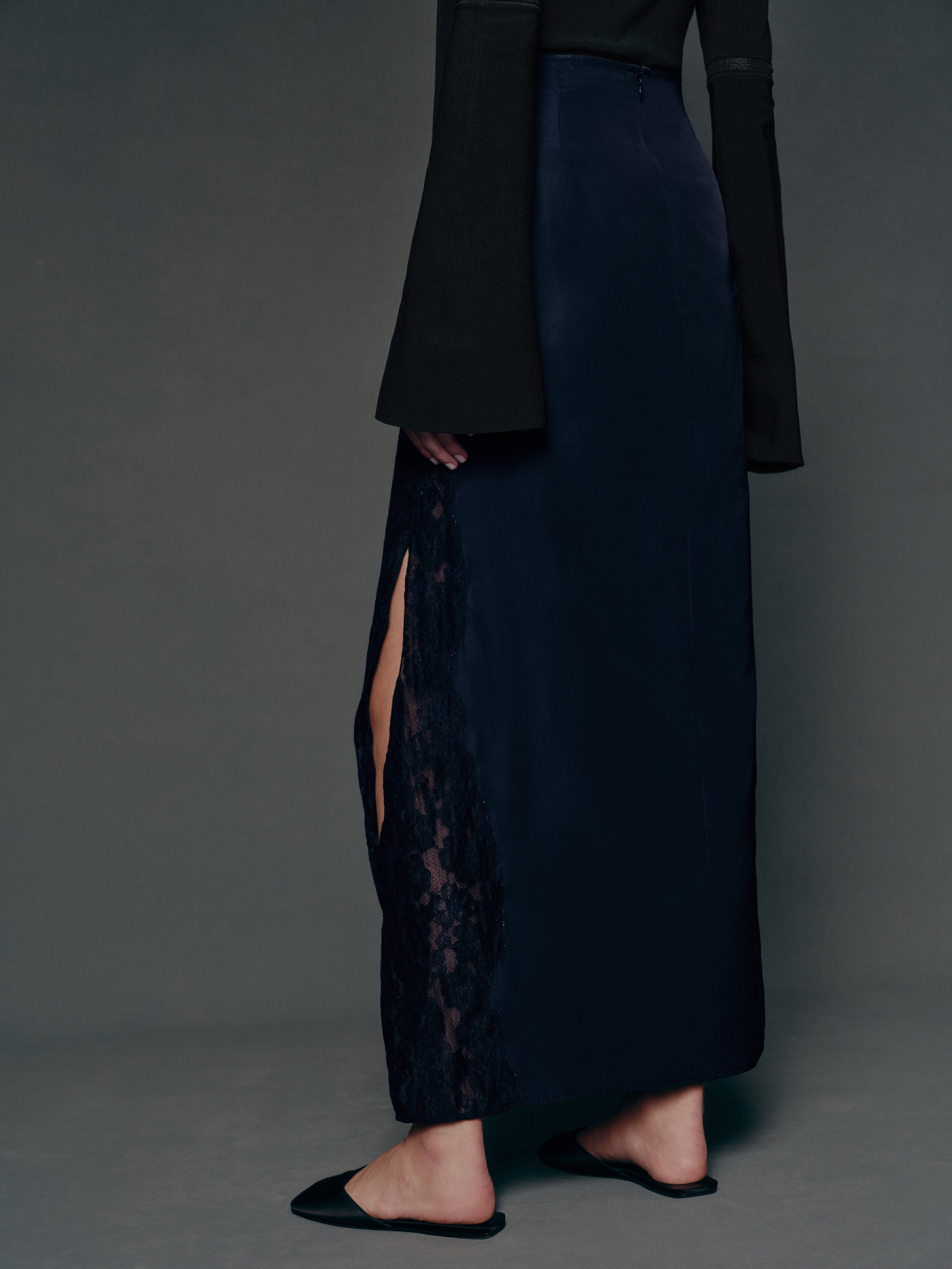 Wear the skirt. Shop the Noah Skirt from Reformation, a maxi-length skirt with a side slit and lace detailing.