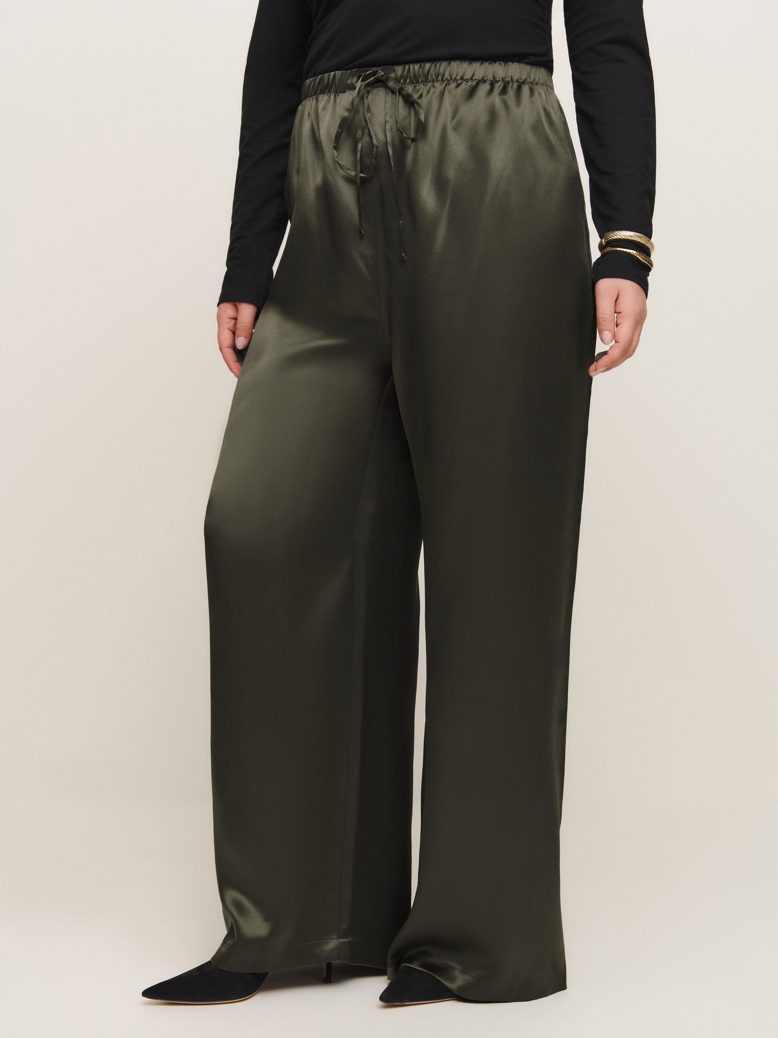 New silky. Shop the Olina Silk Pant ES from Reformation, fitted in the waist with a relaxed leg and adjustable drawstring waist.