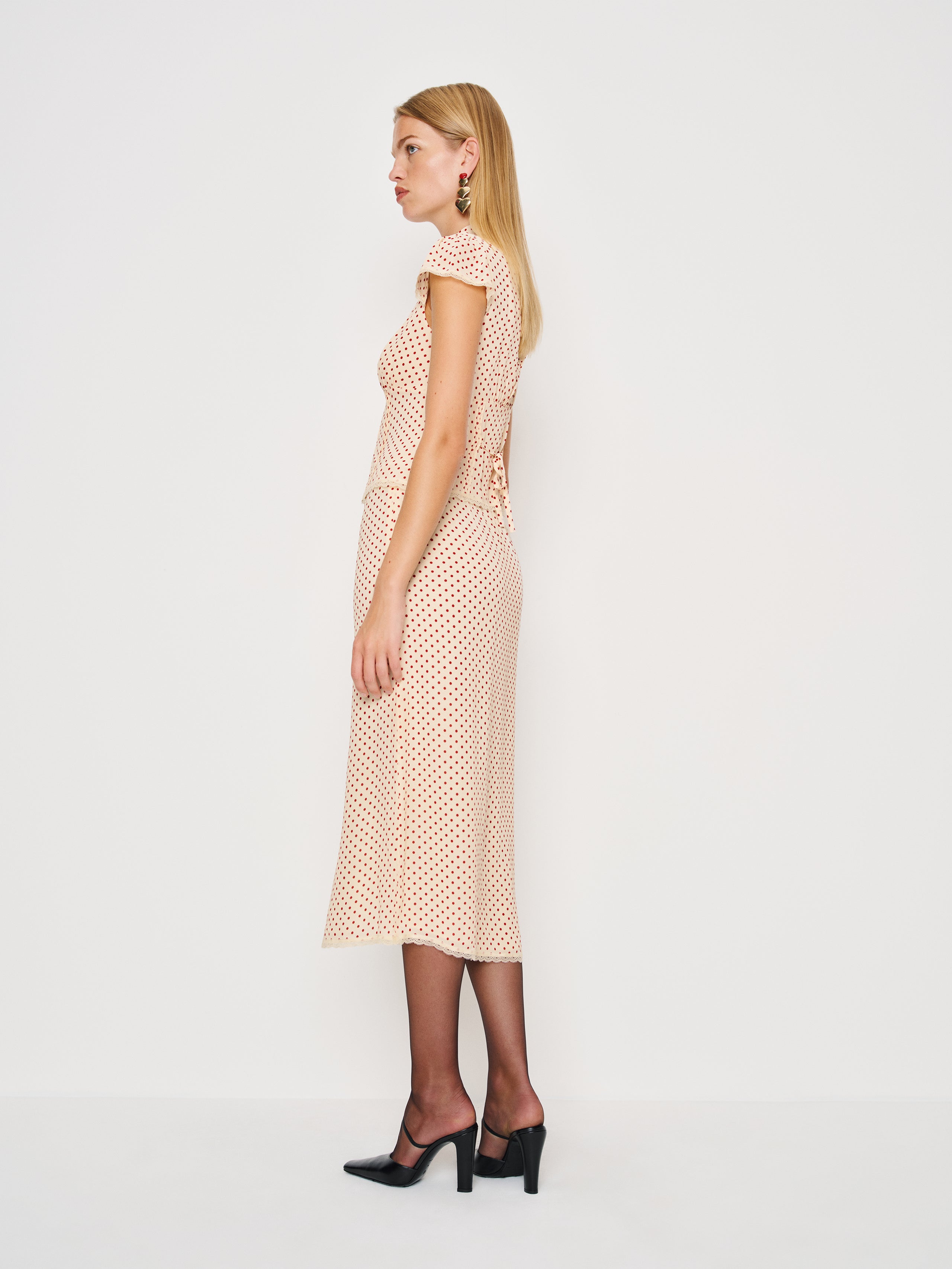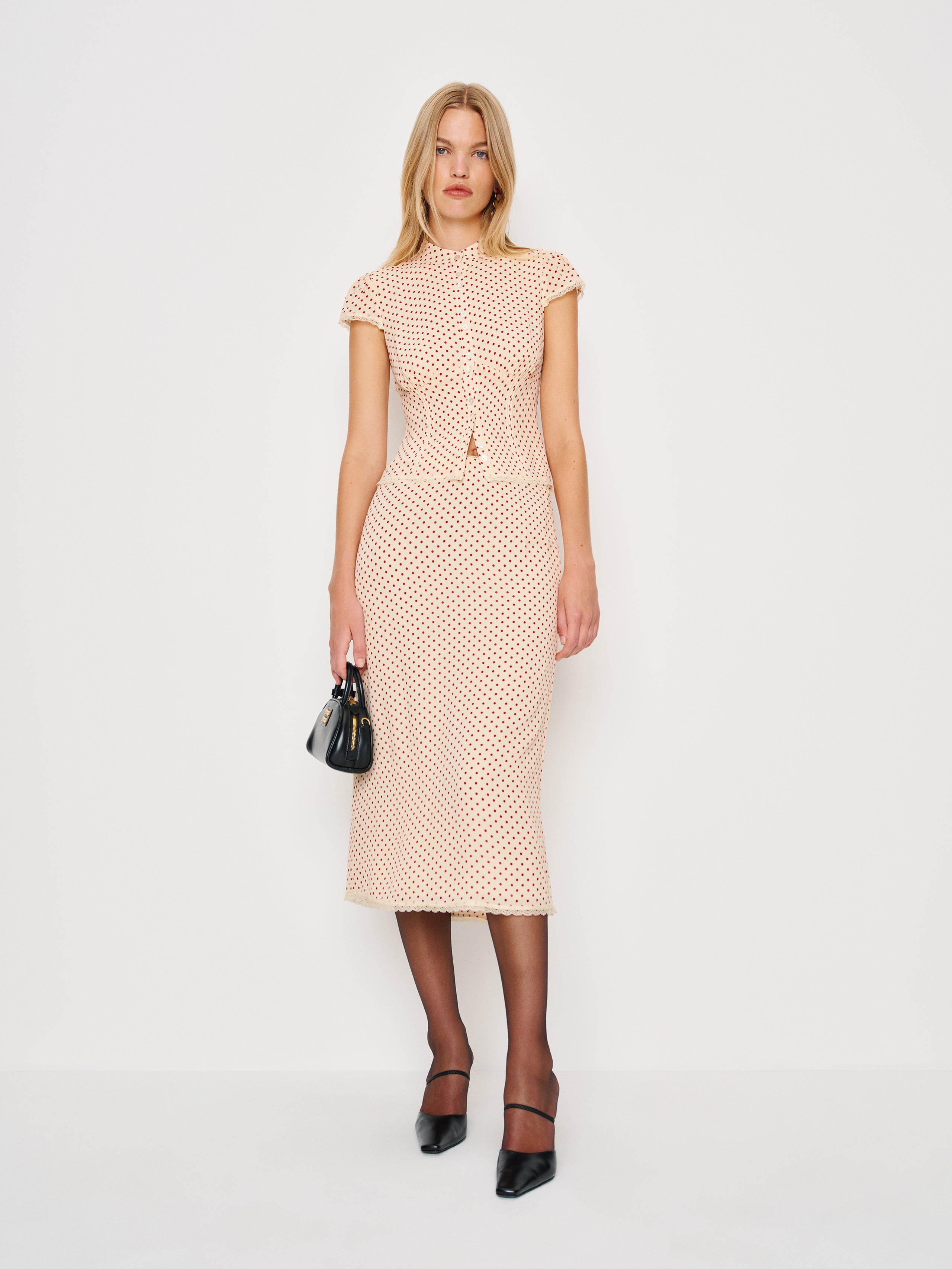 Who, me. Shop the Opal Two Piece from Reformation, a short-sleeved top with a mock neck, button front, and a tie detail in the back with a matching midi skirt.