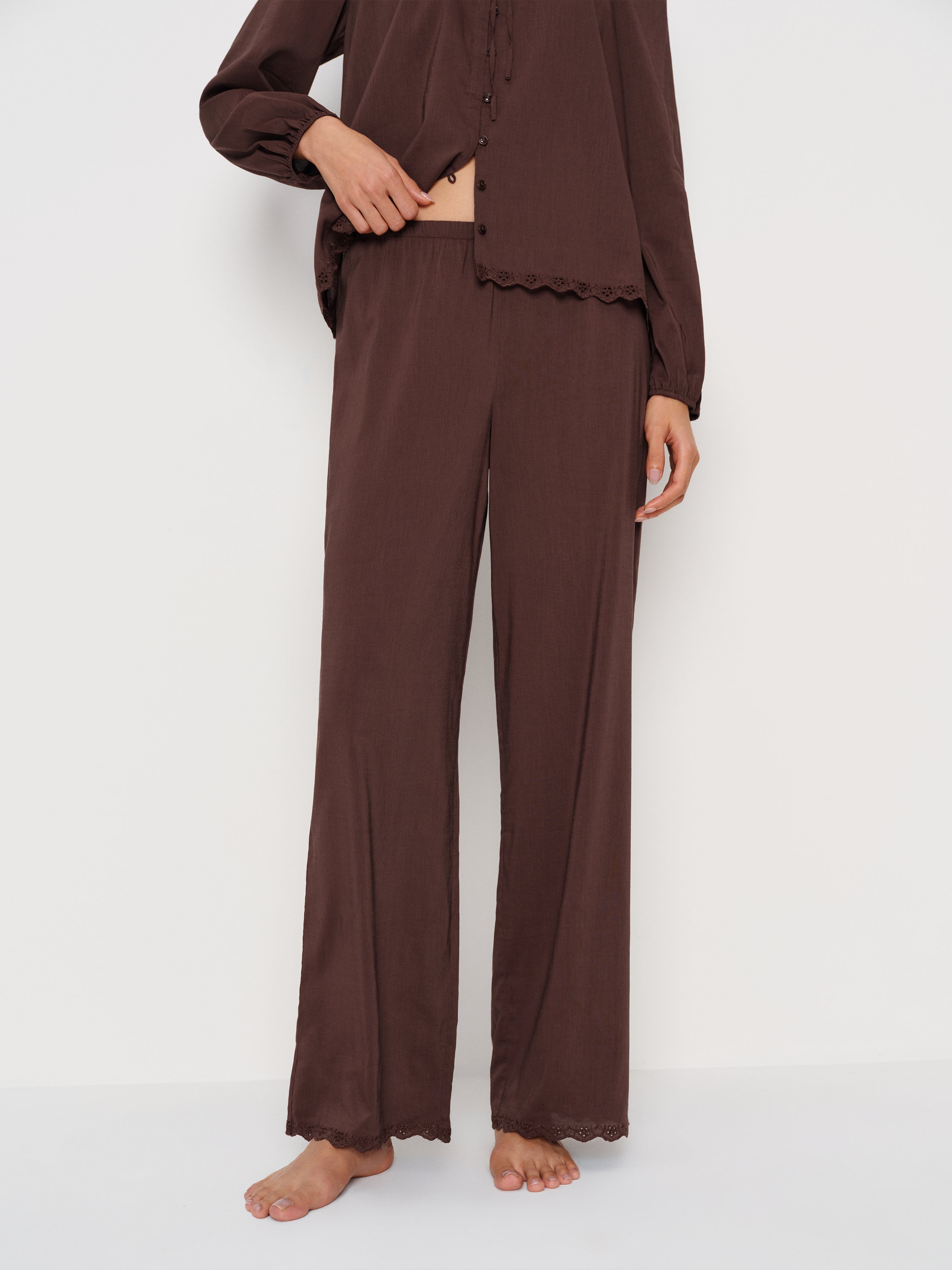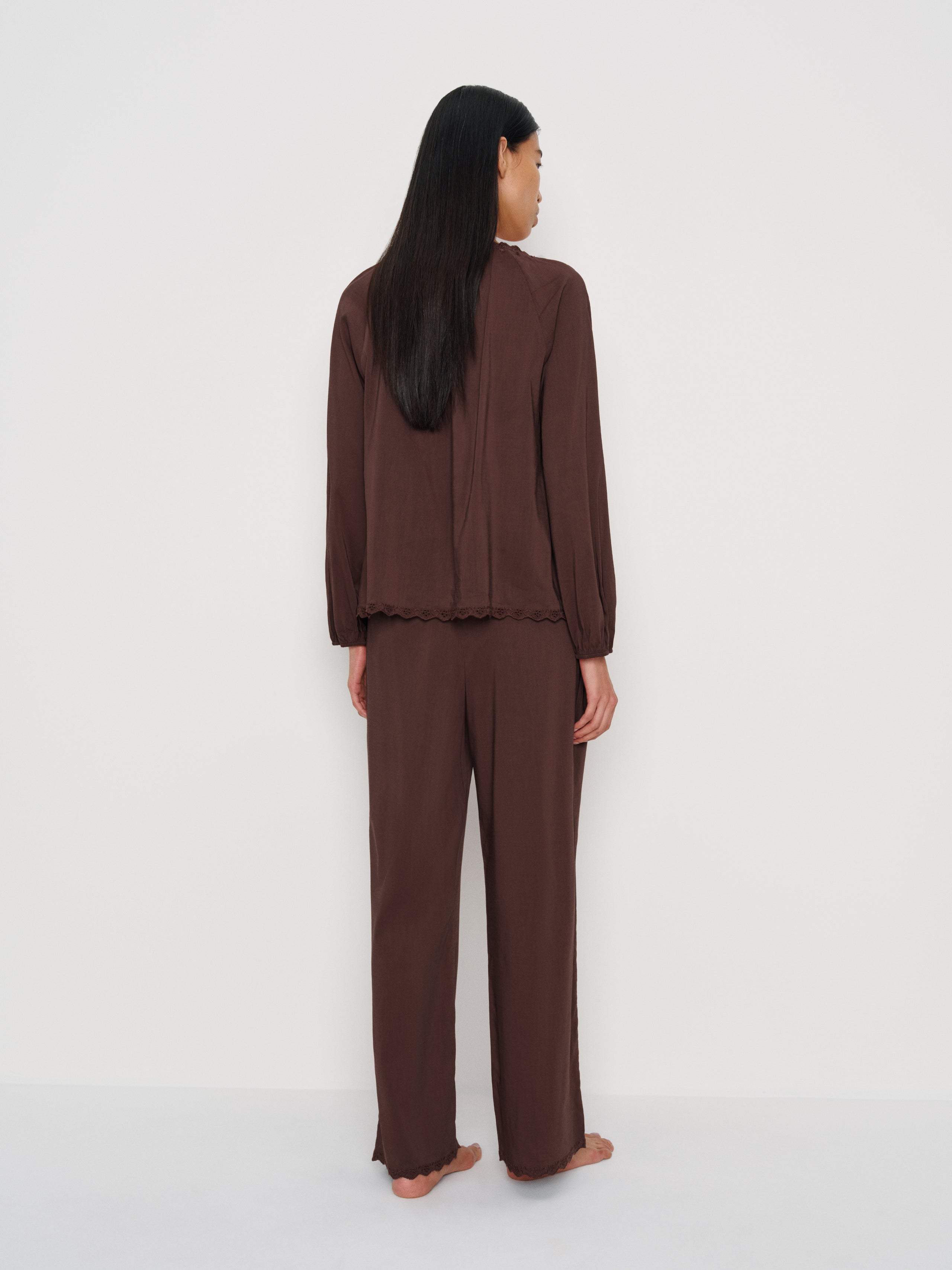 Sweet dreams. Shop the Paloma Pajama Set from Reformation, a pajama set with a long-sleeved top with lace detailing and matching pants.