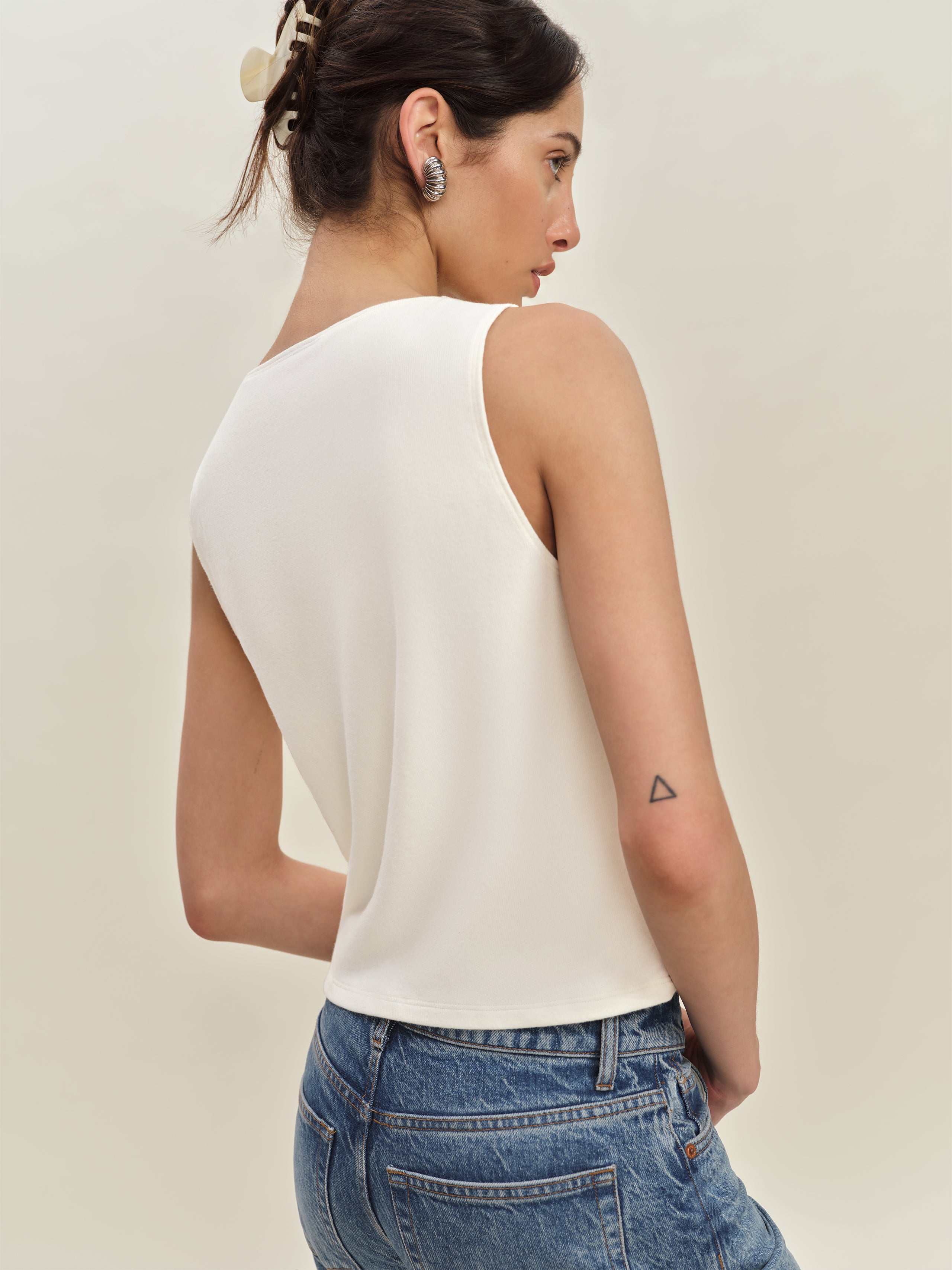 Up top. Shop the Pears Knit Top from Reformation, a sleeveless knit top with a high neckline.