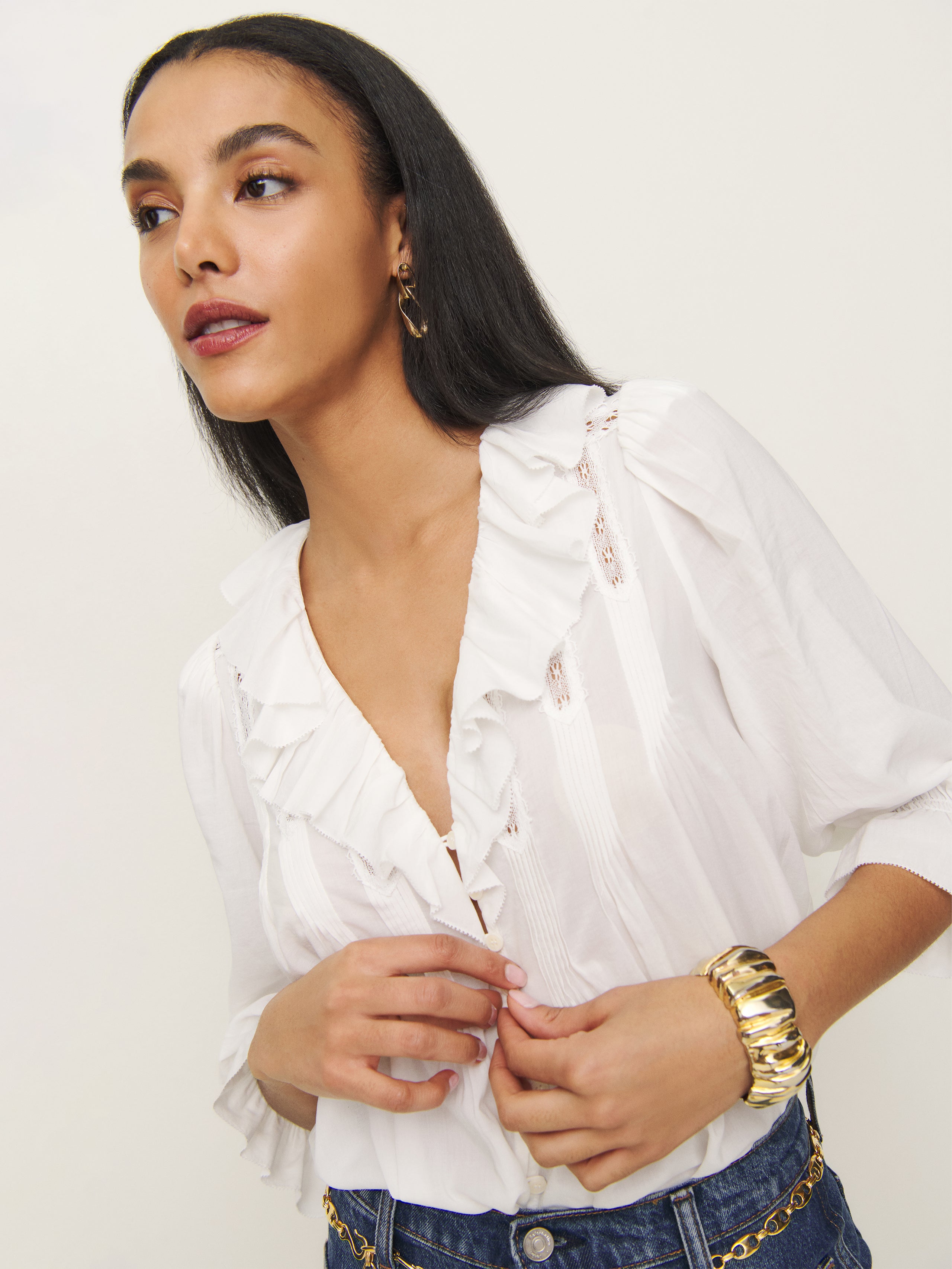 Up top. Shop the Perry Top from Reformation, a 3/4 length sleeve top with a v-neckline, adjustable buttons down the front, and ruffle detailing at the neckline.