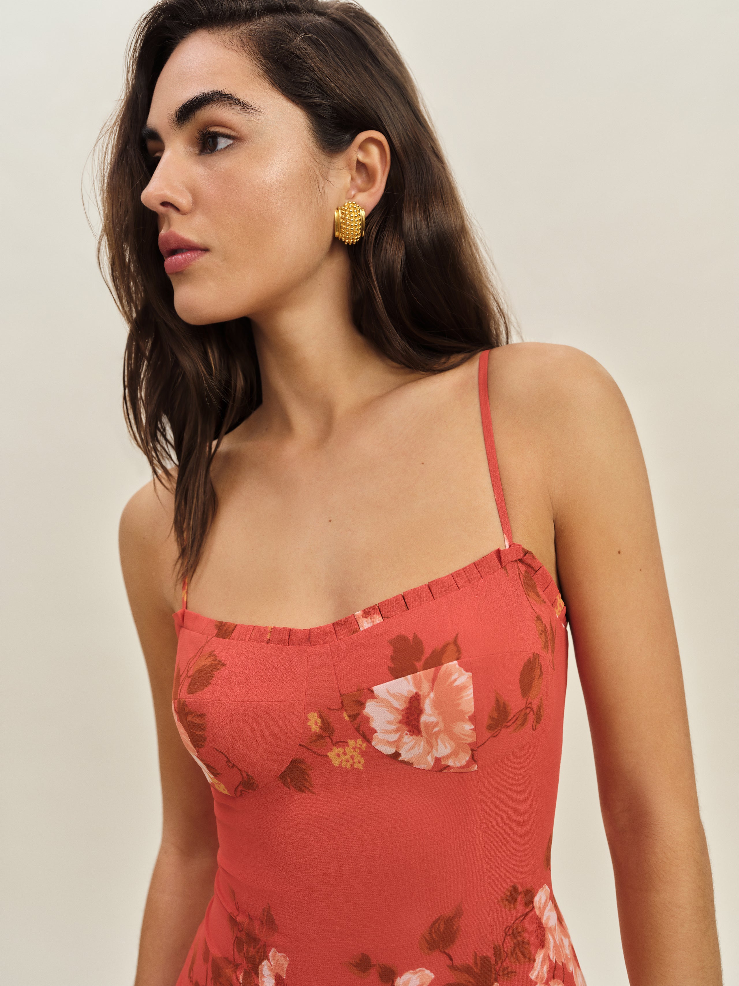 How dreamy. Shop the Petites Aiko Dress from Reformation, a midi-length dress with a sweetheart neckline, ruffling...