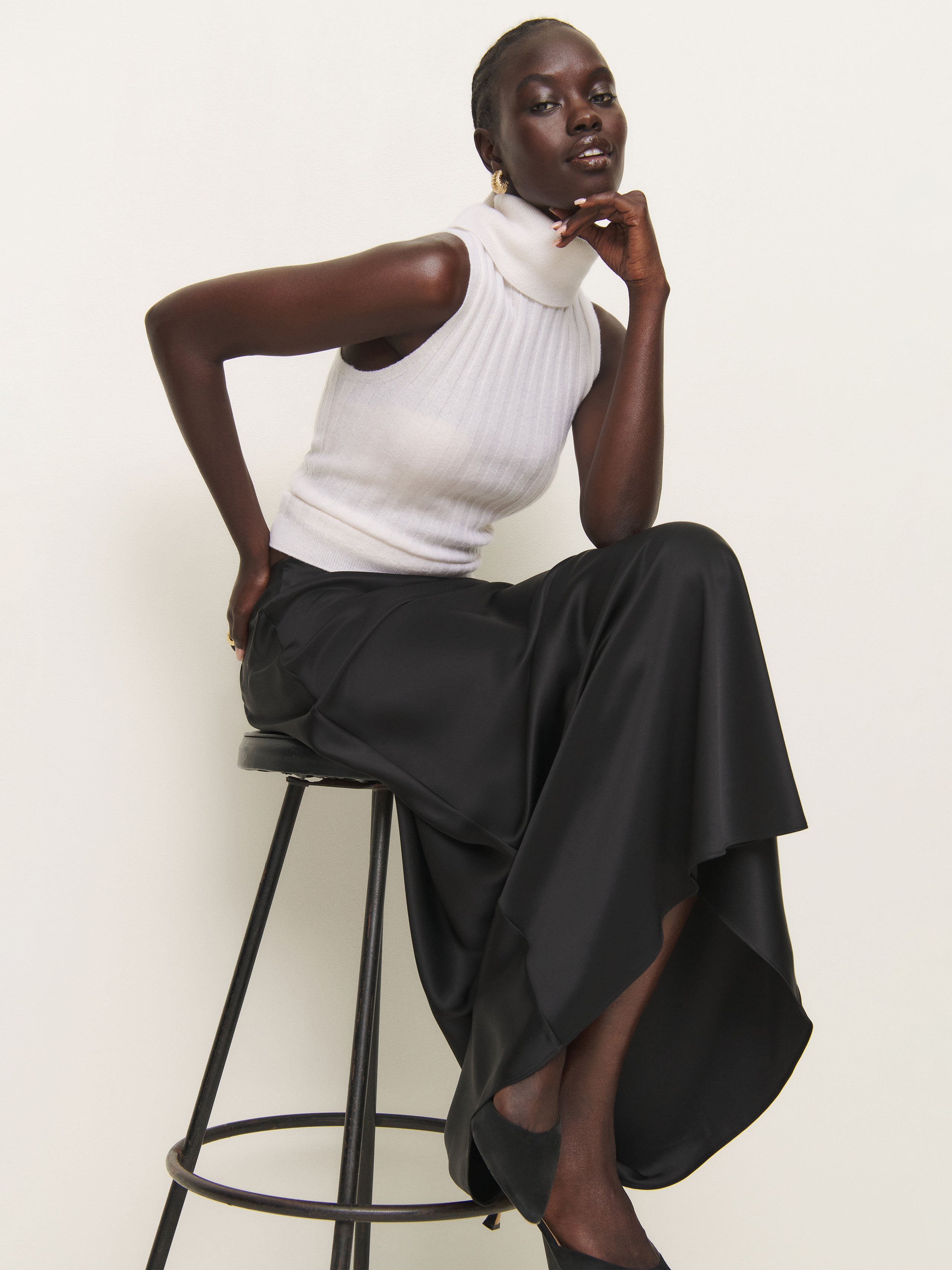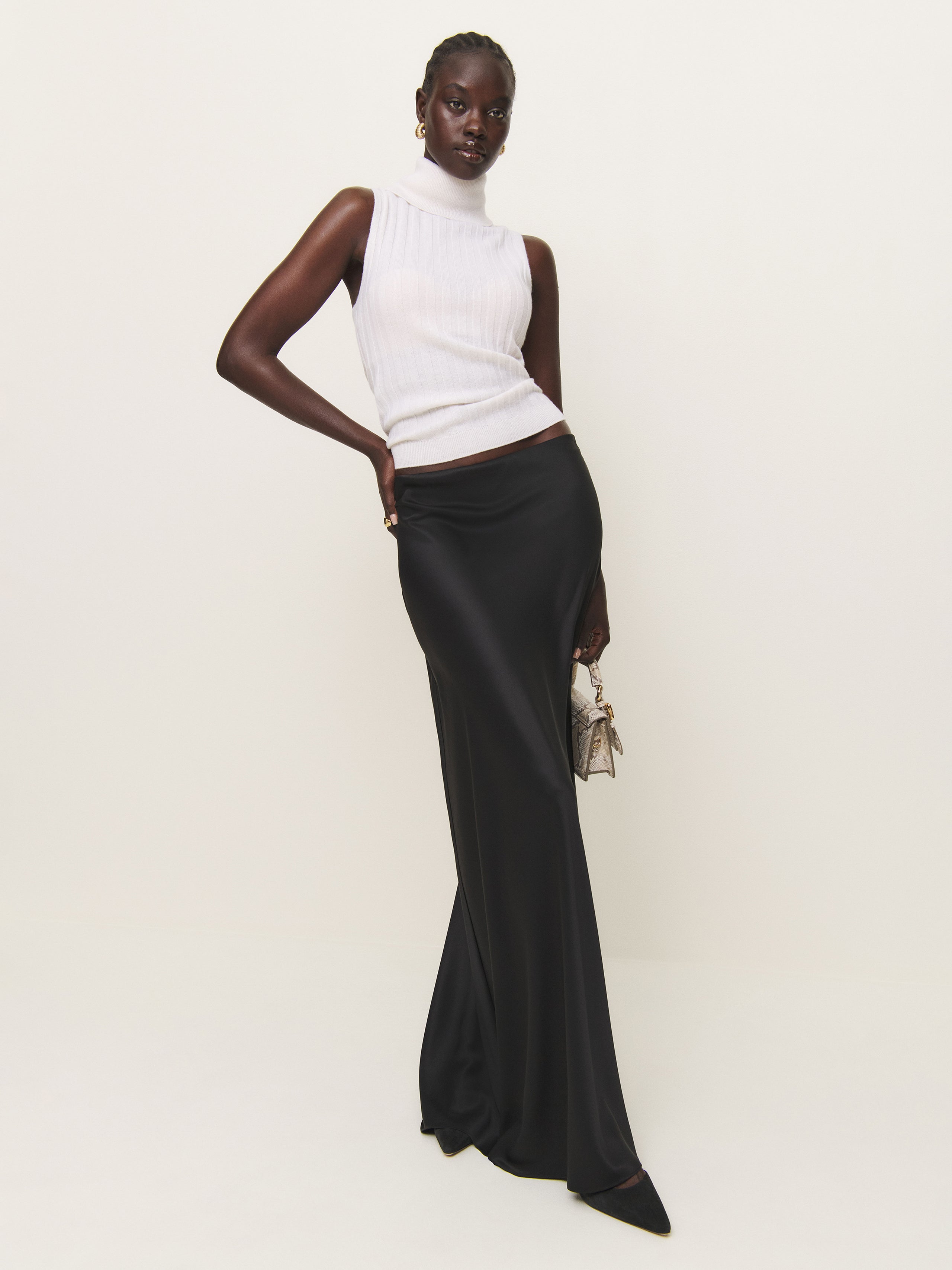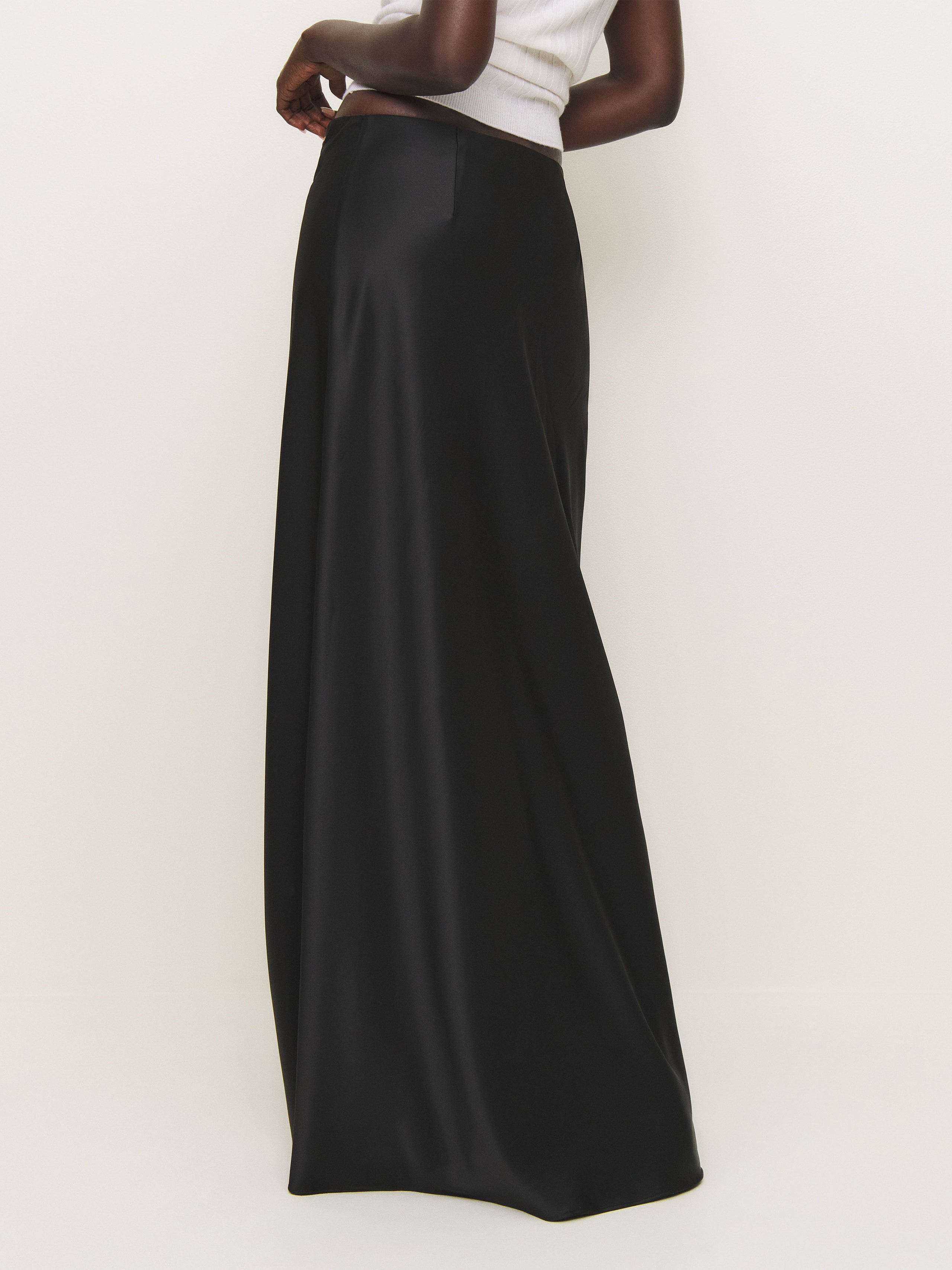 Let your skirt do the talking. Shop the Petites Bella Satin Skirt from Reformation, a bias cut maxi skirt with an elasticated waist.
