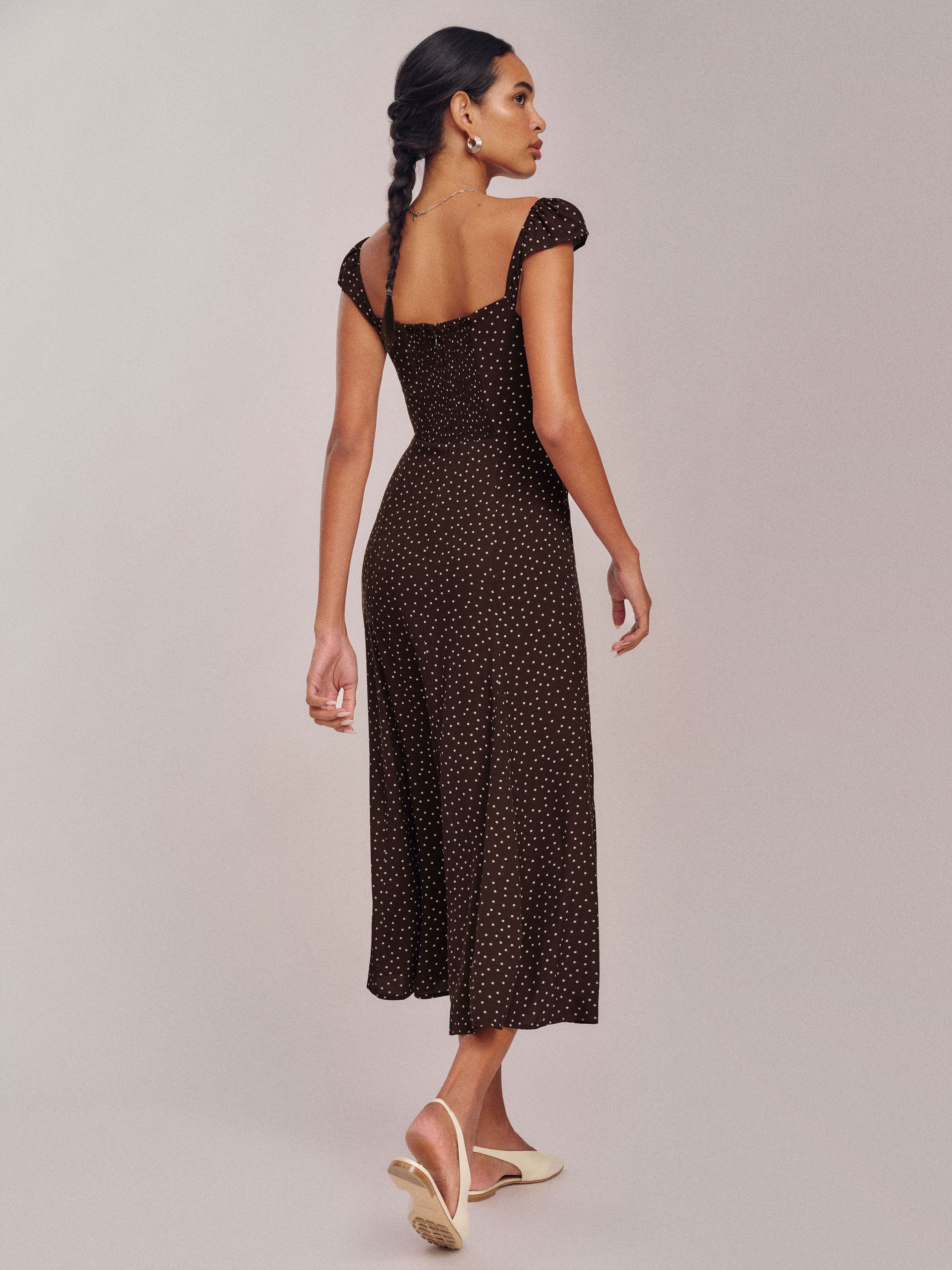 Wear the dress. Shop the Petites Bryson Dress from Reformation, a midi dress with short, cap sleeves, a sweetheart neckline, and back smocking.
