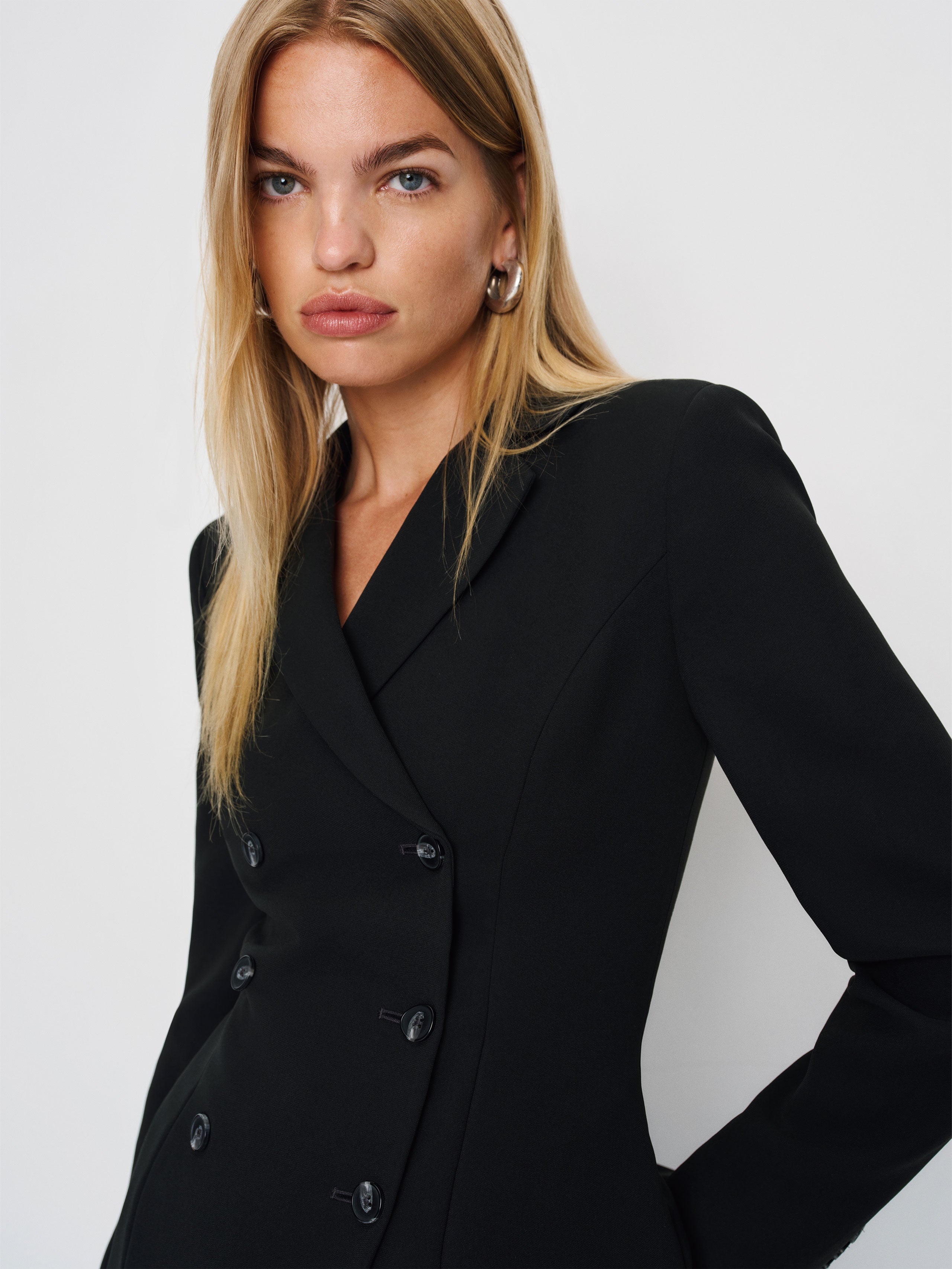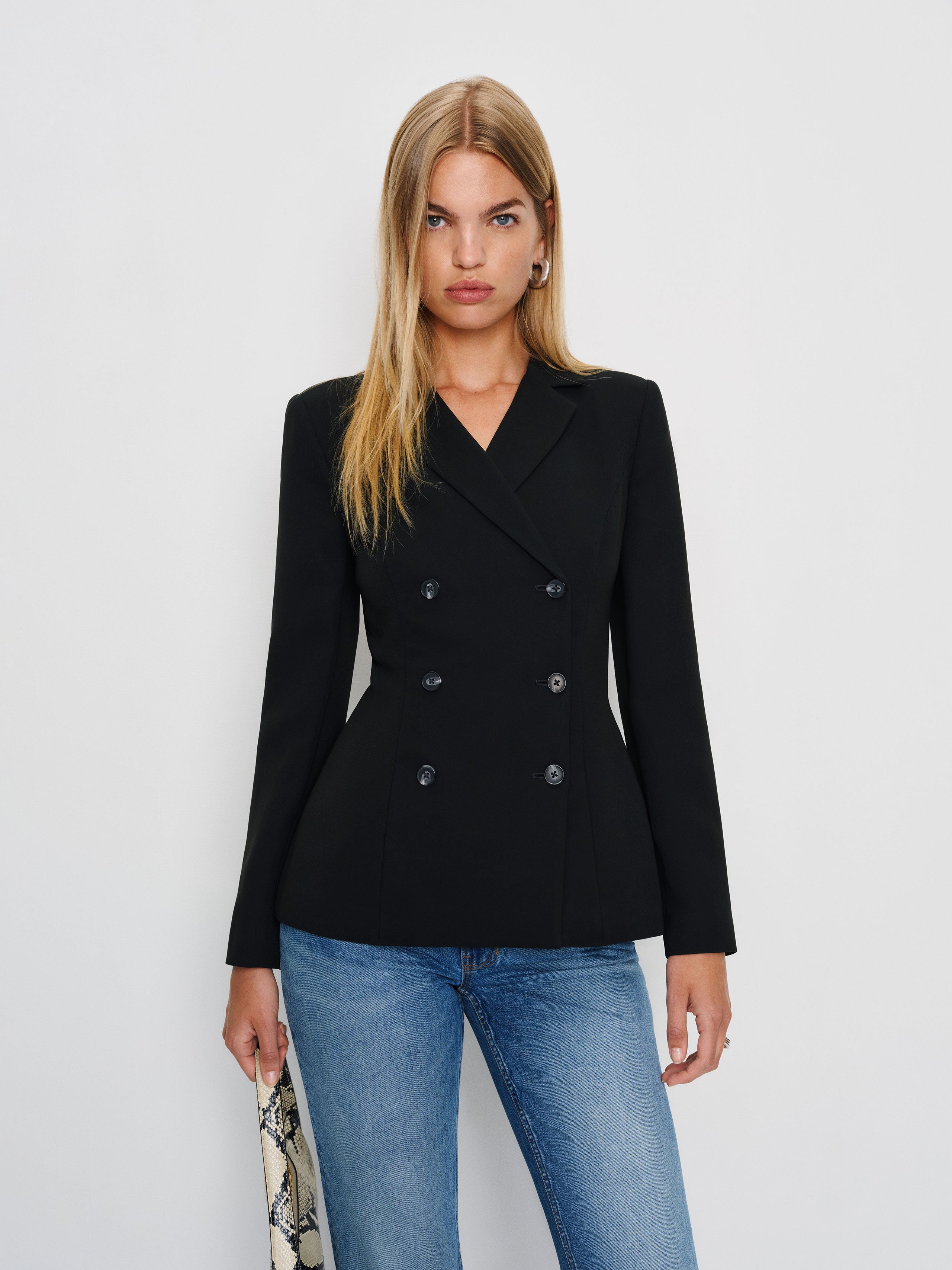 What do we have here? Shop the Petites Caden Blazer from Reformation, a long-sleeved blazer with a collared neckline and double breasted buttons.