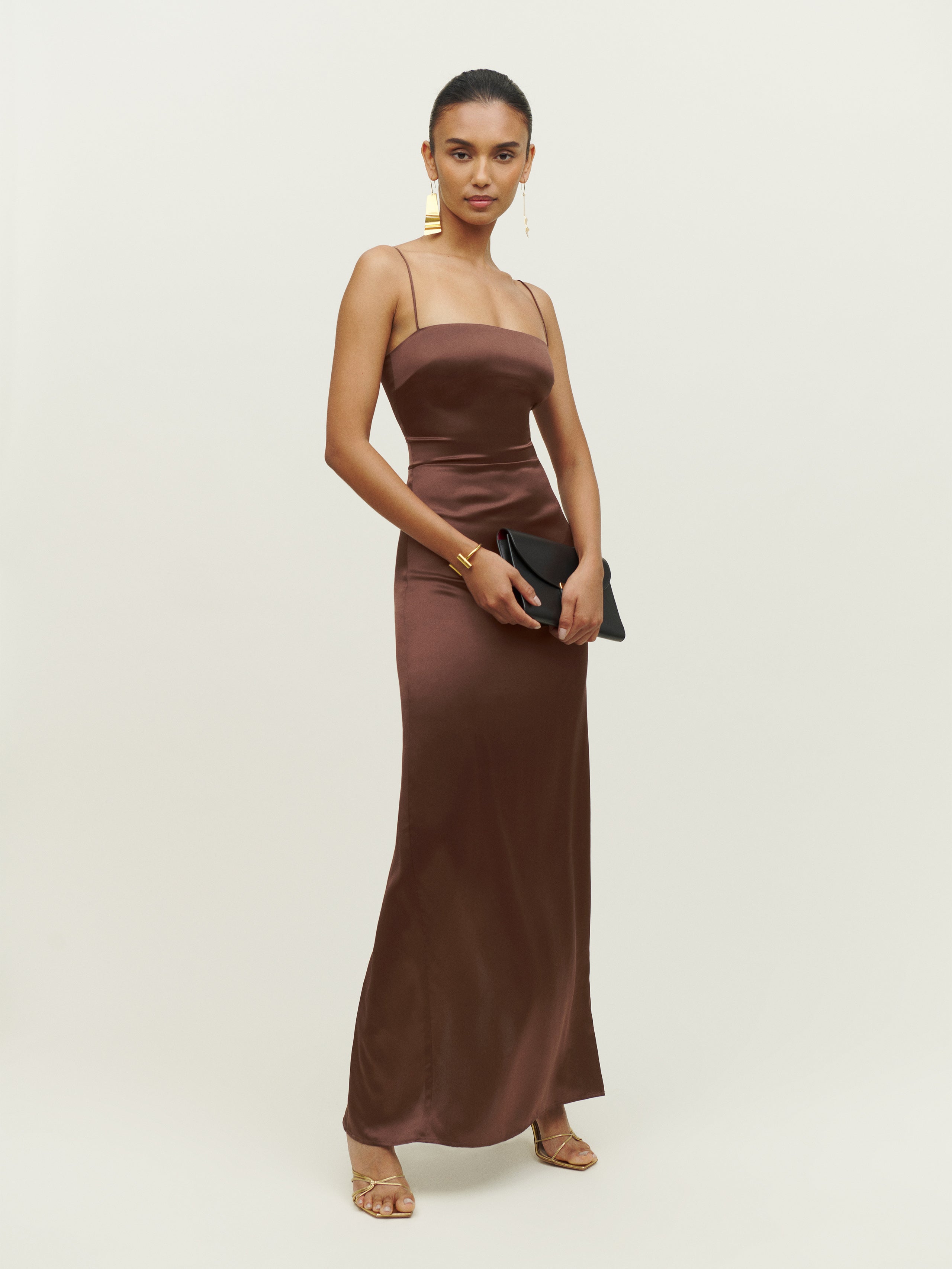 Slinky. Shop the Petites Frankie Silk Dress from Reformation, is a slim fitting, midi dress with a...