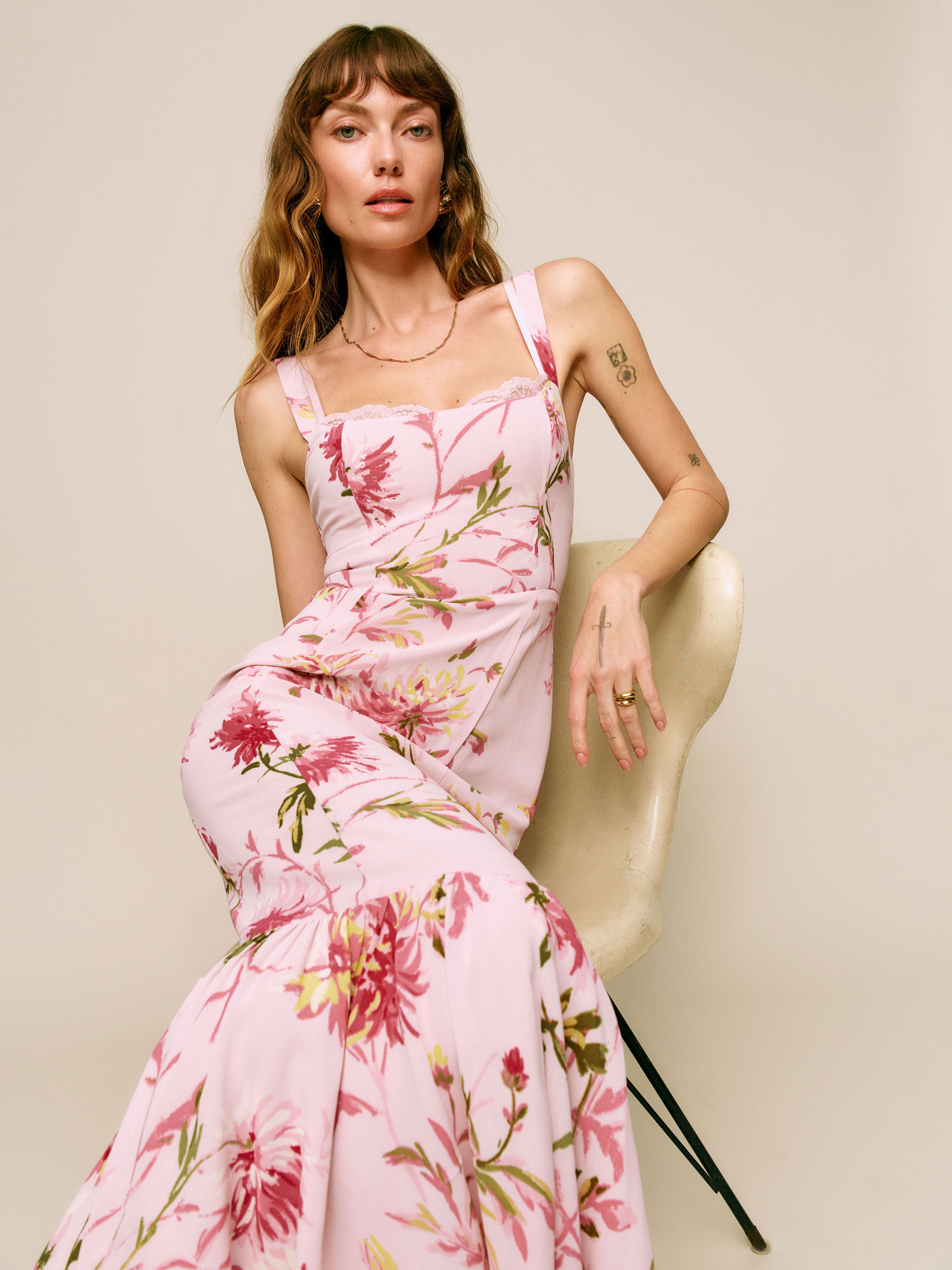 Romance for one. Shop the Petites Irisa Dress from Reformation, a midi dress with a sweetheart neckline, ruffled hem, and lace detailing.