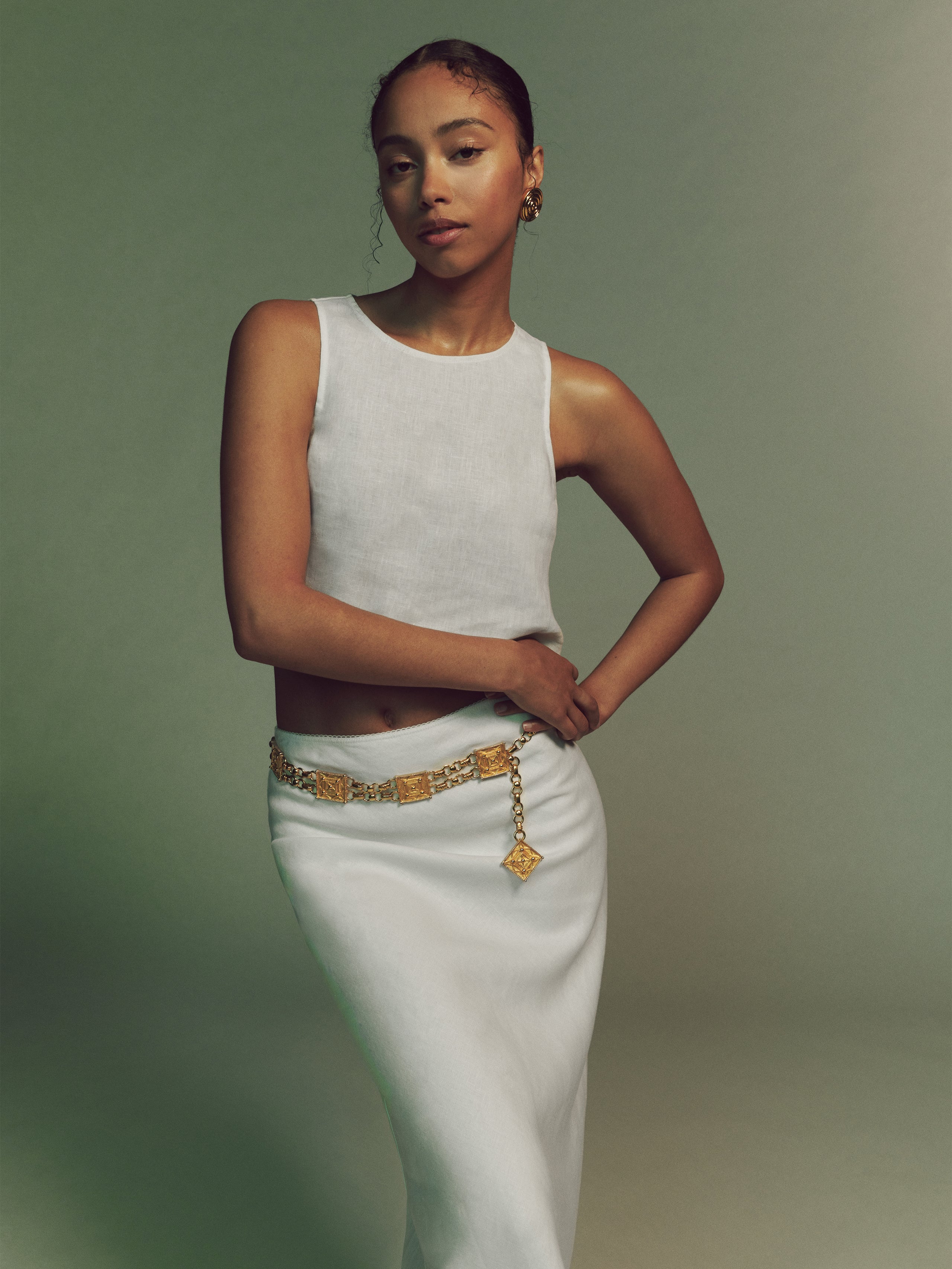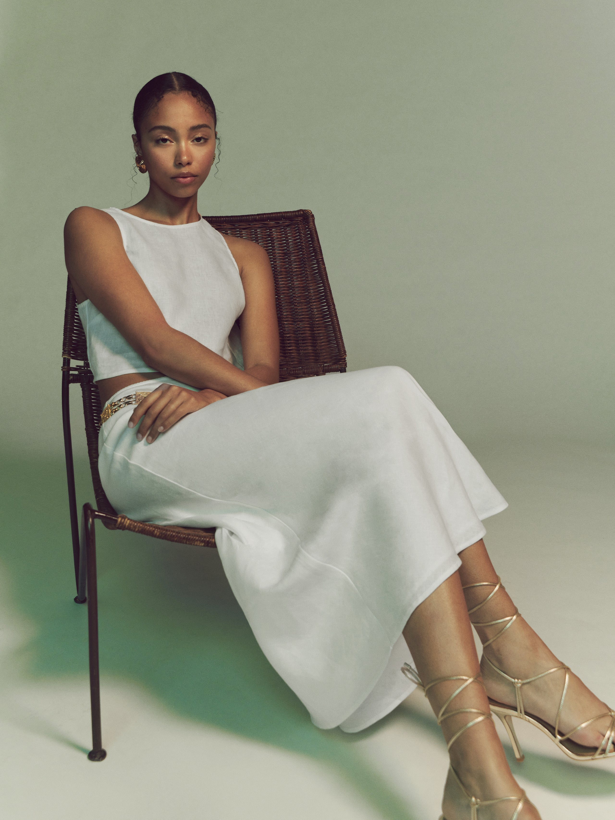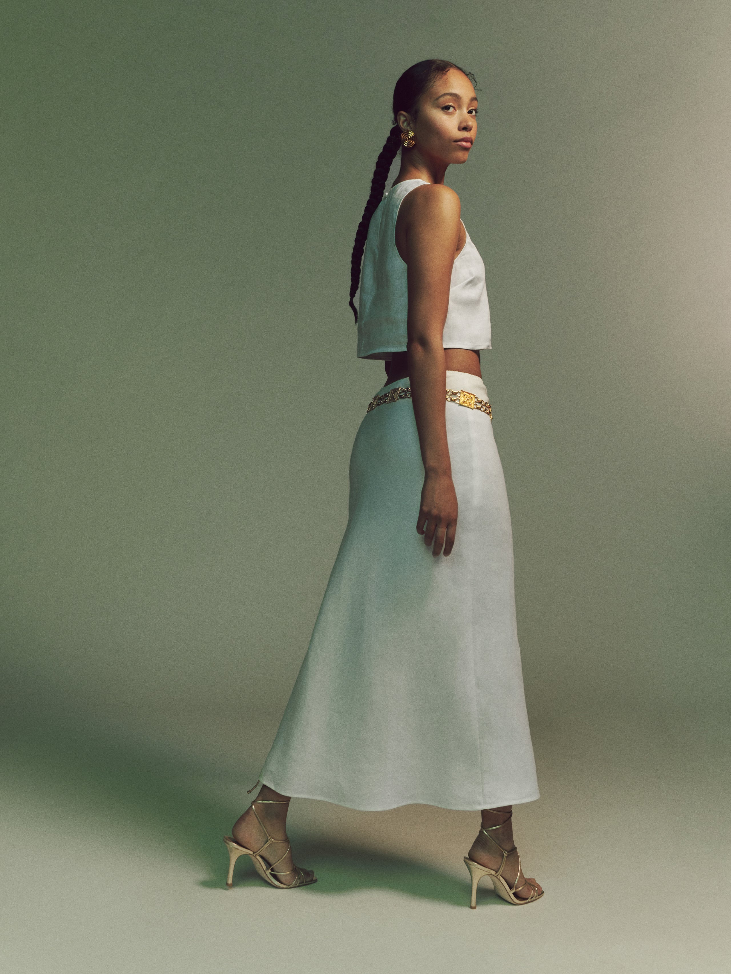 Let your skirt do the talking. Shop the Layla Linen Skirt from Reformation, a bias cut, midi...