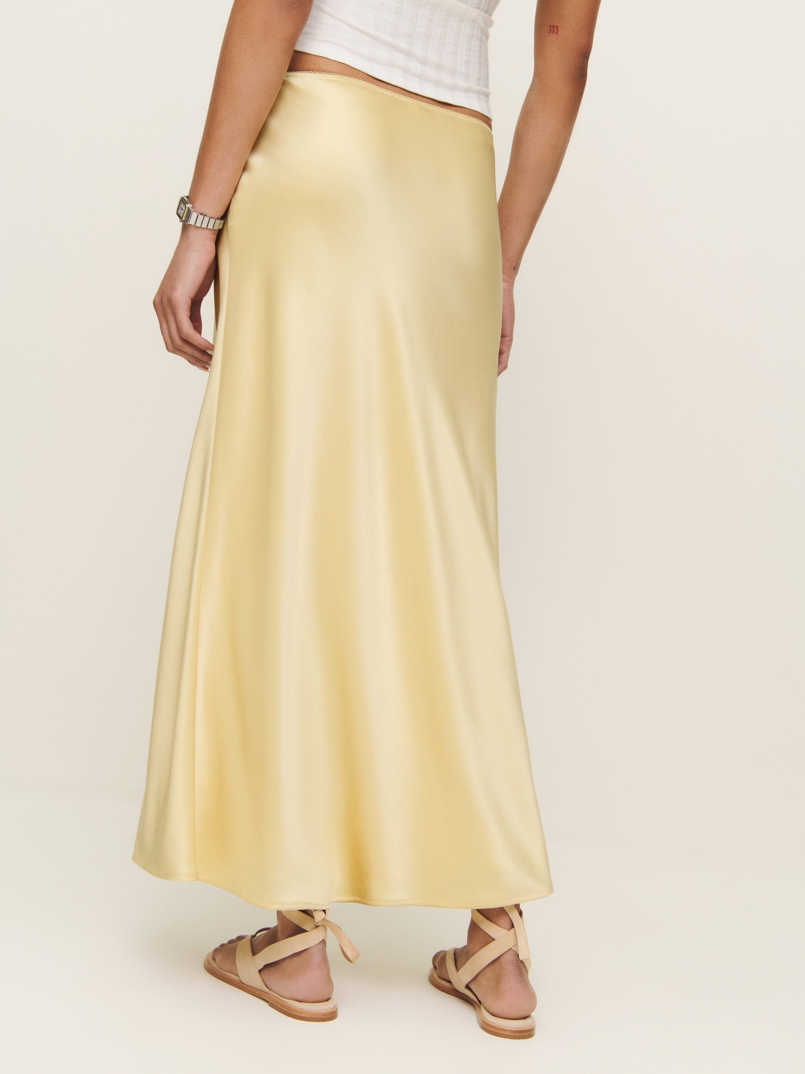 Wear the skirt. Shop the Petites Layla Satin Skirt from Reformation, a bias cut midi skirt with an elasticated waist that can be worn high or low rise.