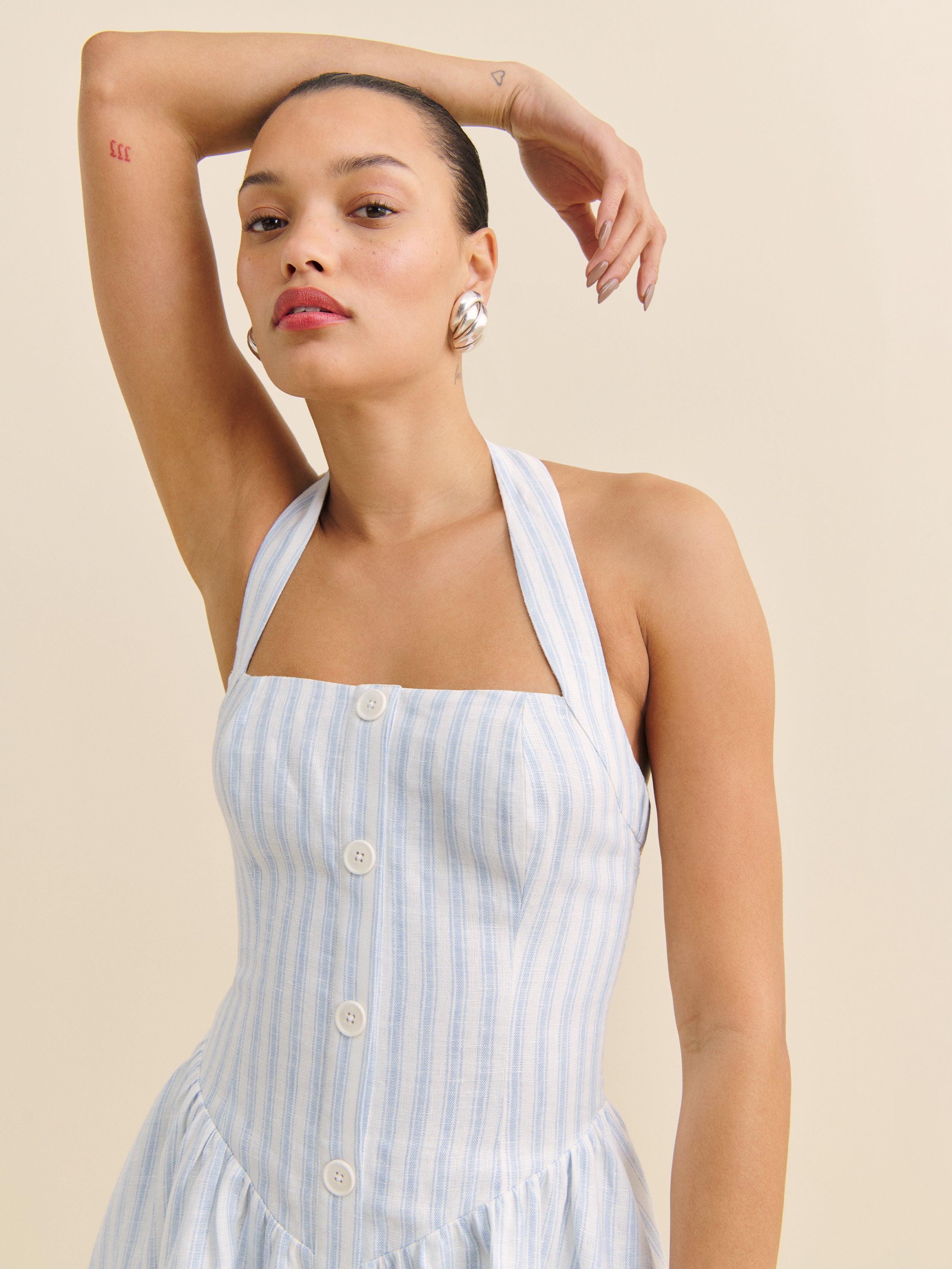 Easy little mini. Shop the Petites Mariela Linen Dress from Reformation, a sleeveless mini dress with a square halter neckline, drop waist, and button front.