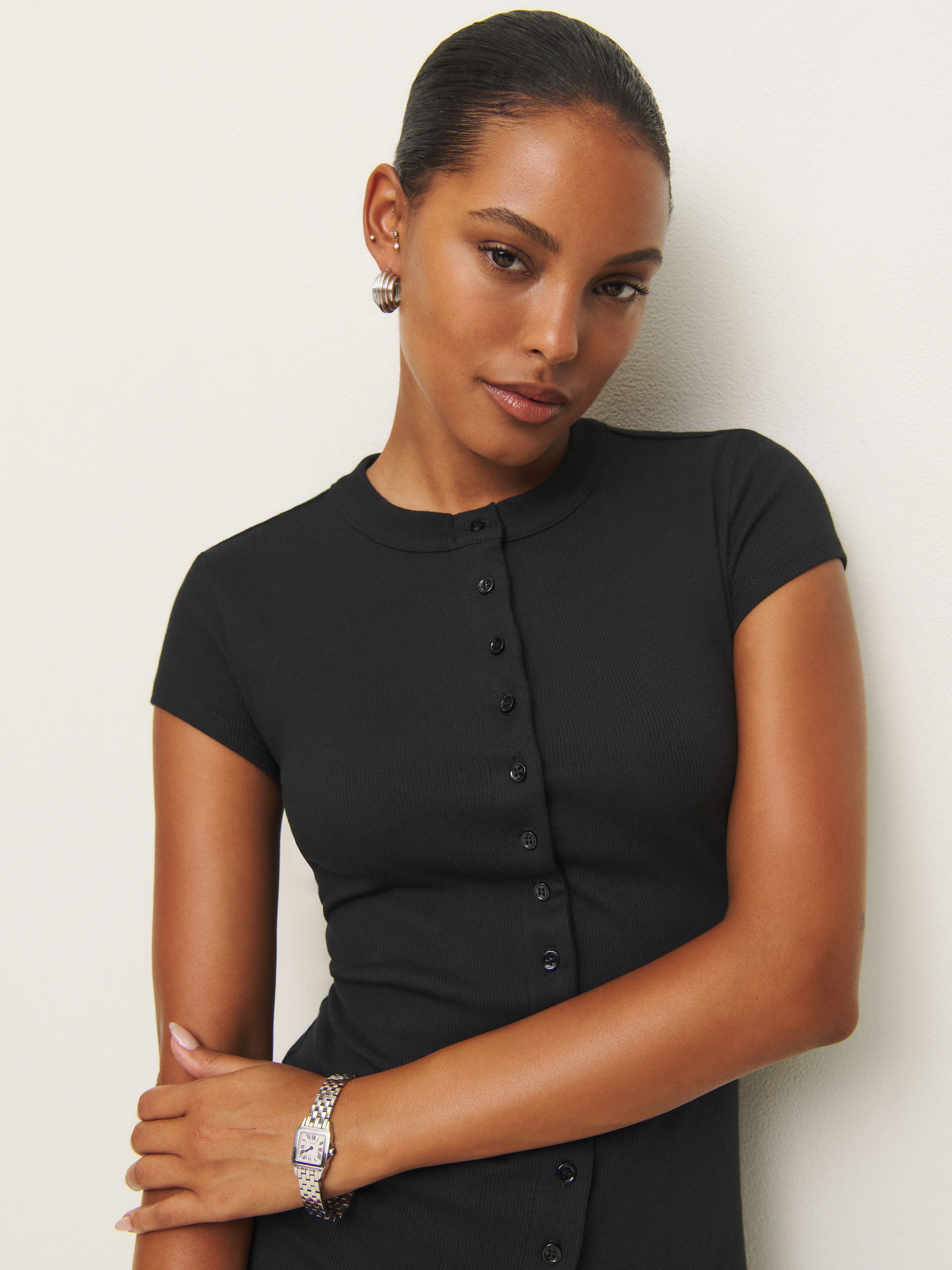 Easy little mini. Shop the Raelynn Knit Dress from Reformation, a fitted mini dress with short sleeves and a button front.