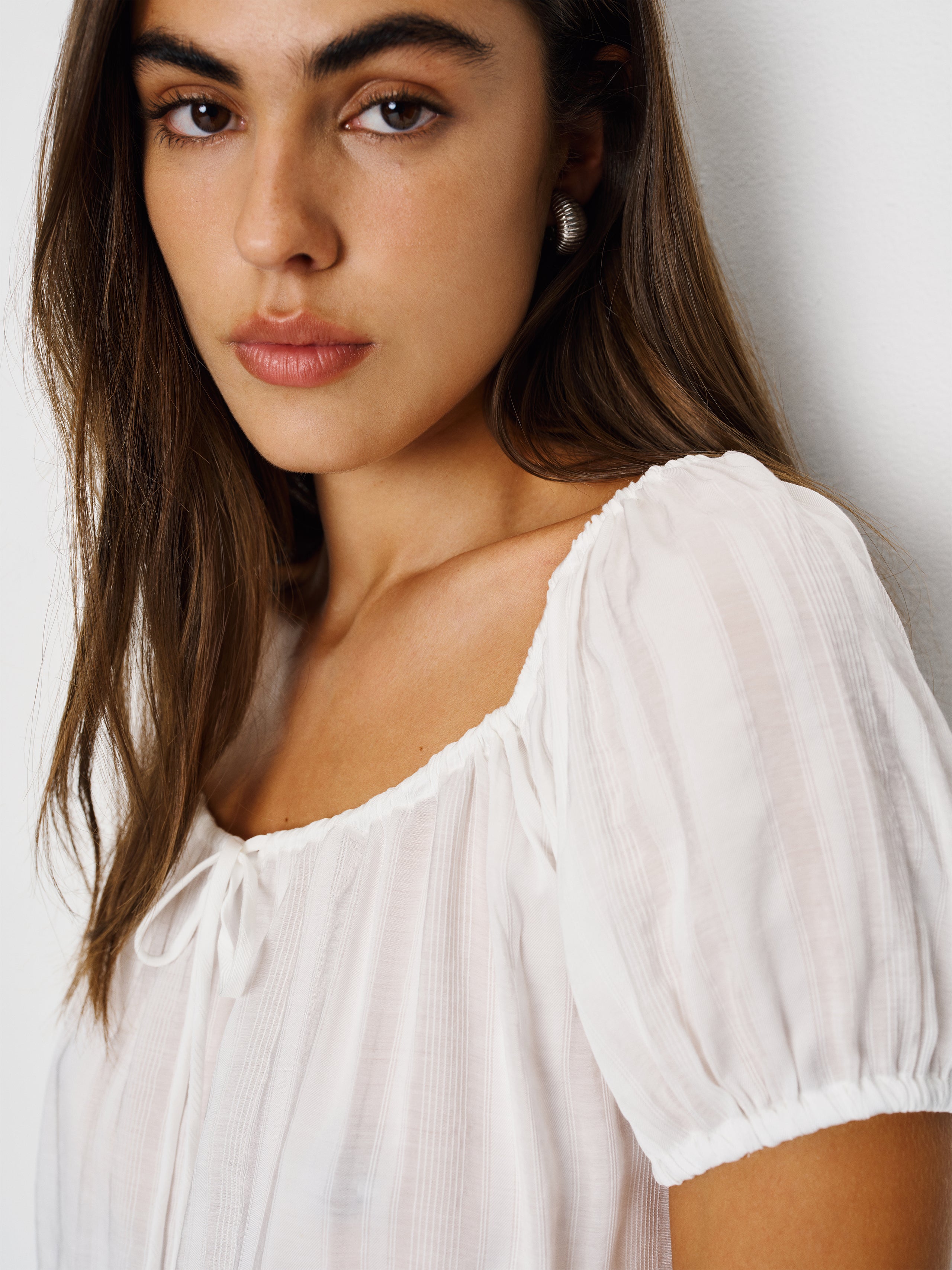 Detail oriented. Shop the Rhia Top from Reformation, a short-sleeved top with puff sleeves, a scoop neckline with a bow detail, and a scalloped lace hem.
