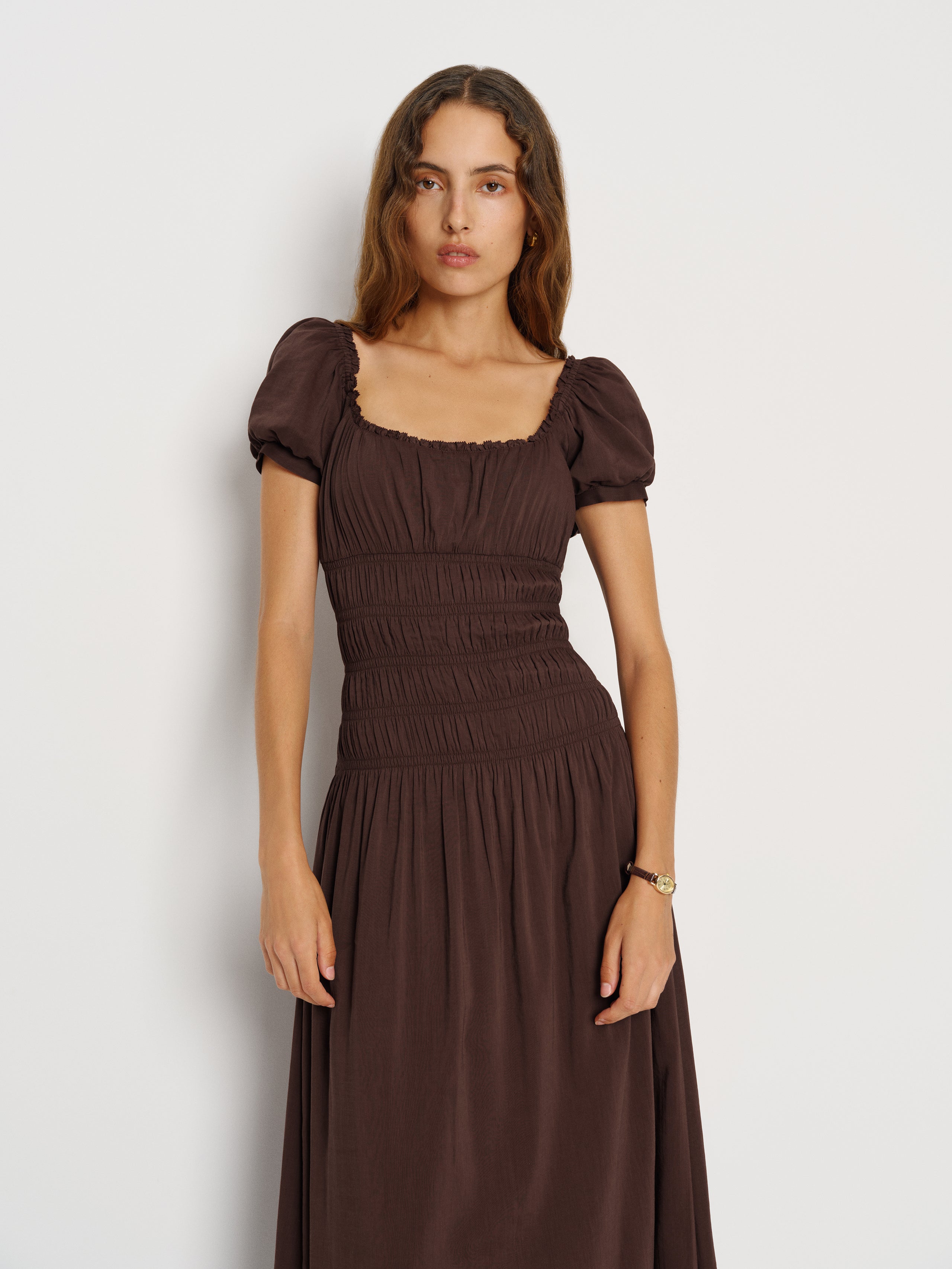 Romance for one. Shop the Riva Dress from Reformation, a short-sleeved midi dress with a scoop neckline and full bodice smocking. Will go anywhere with you.