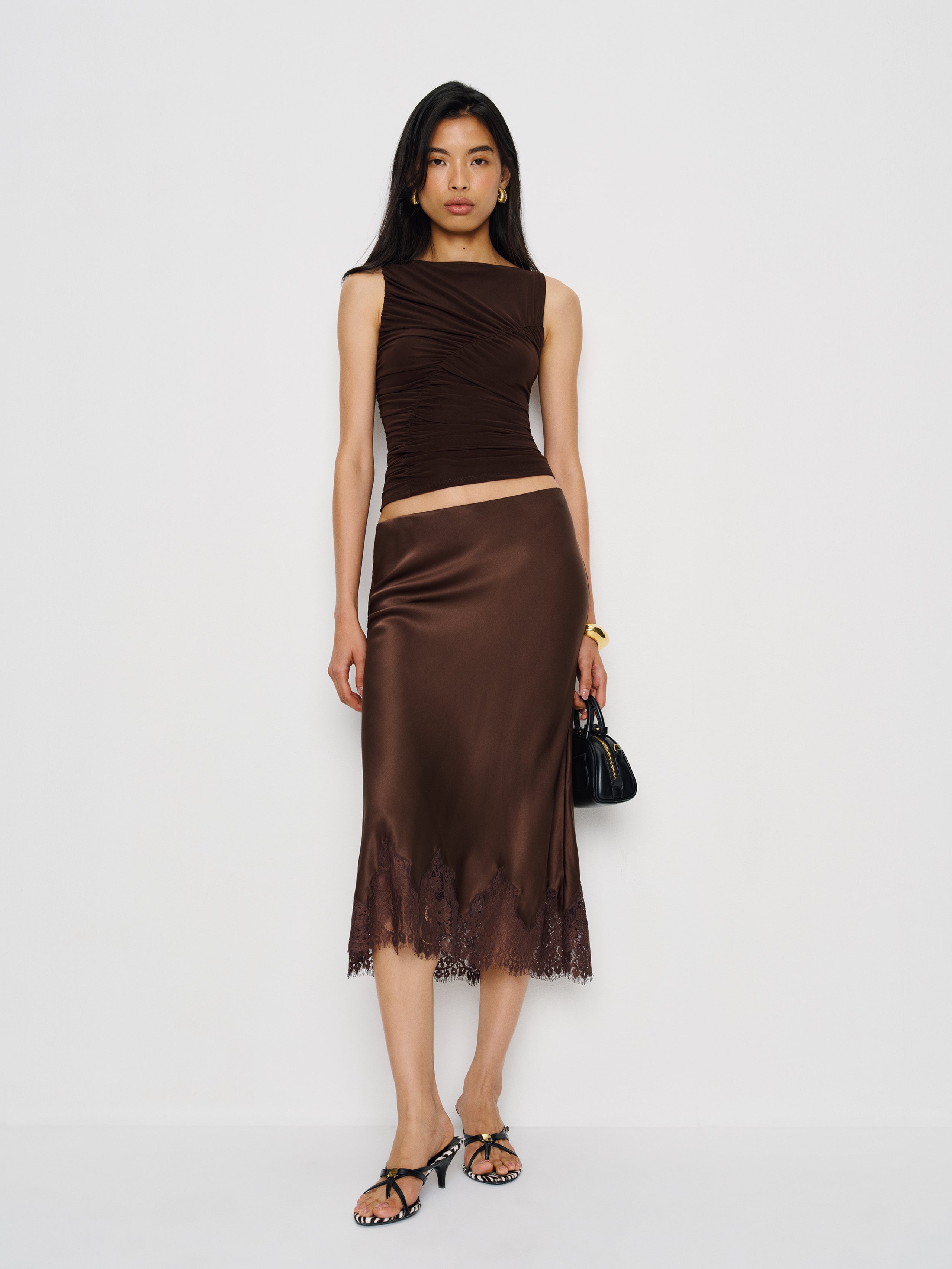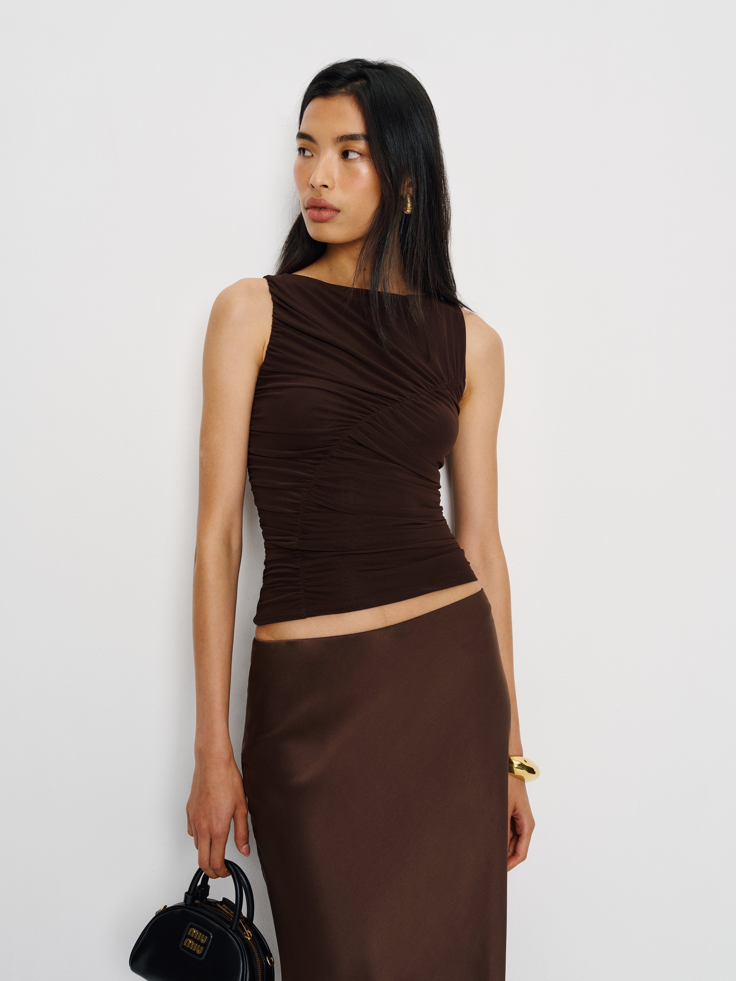You must be new. Shop the Rosie Knit Top from Reformation, a sleeveless top with a boat neckline, a bias stitch, and ruching throughout.
