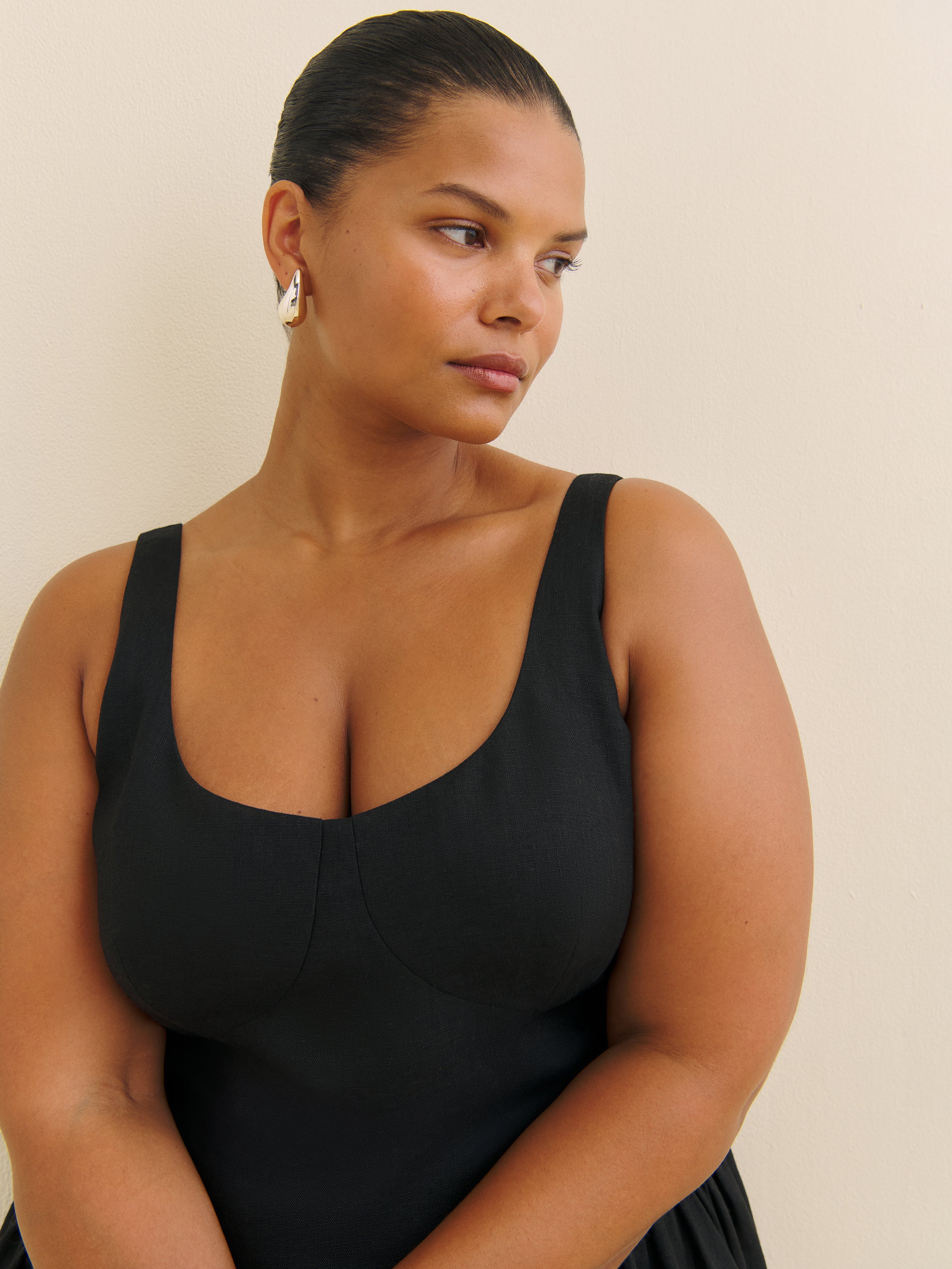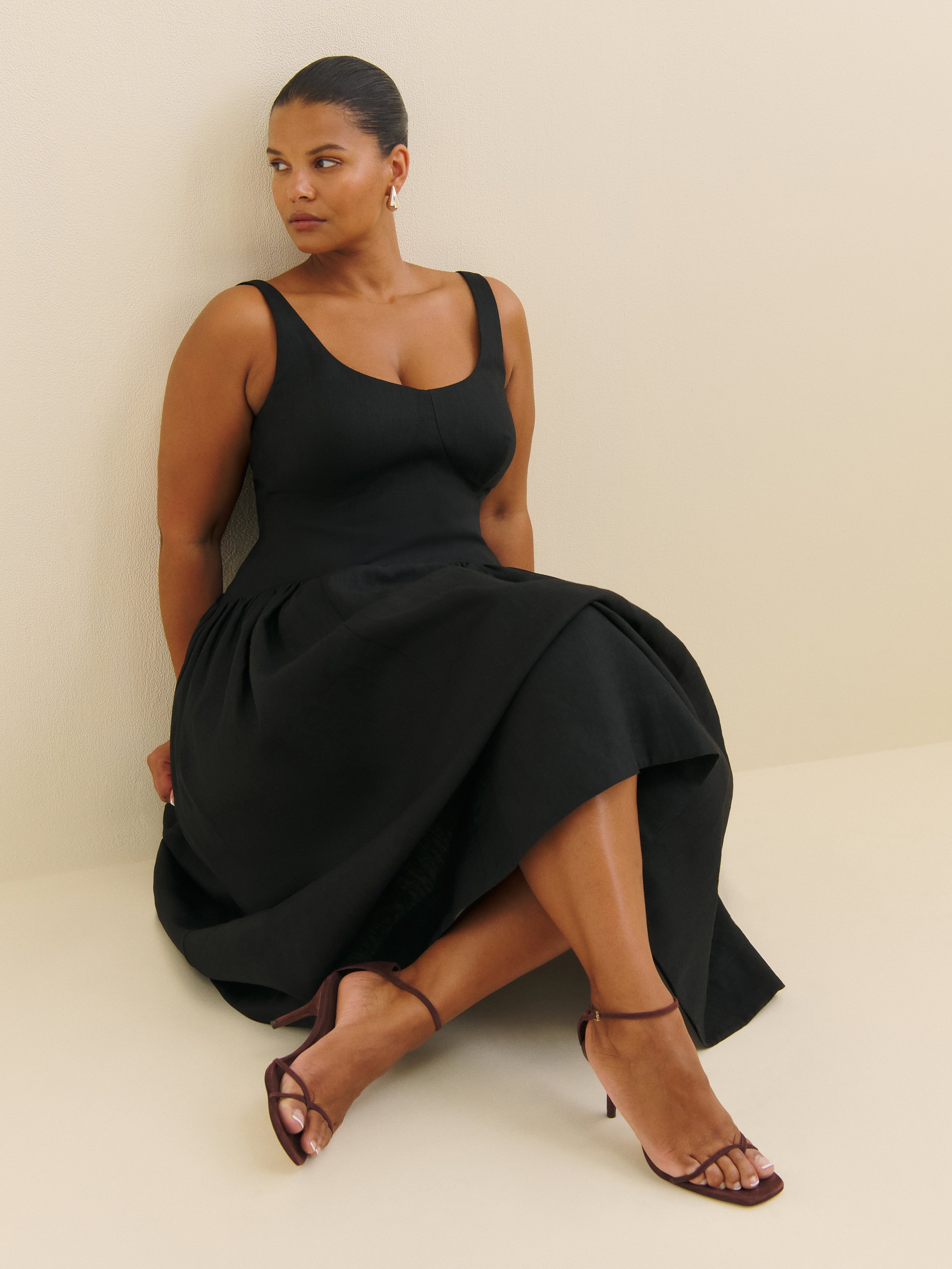 Easy breezy. Shop the Roslyn Linen Dress ES from Reformation, a sleeveless midi dress with a drop waist, bust cup seams, and pleating at the skirt.