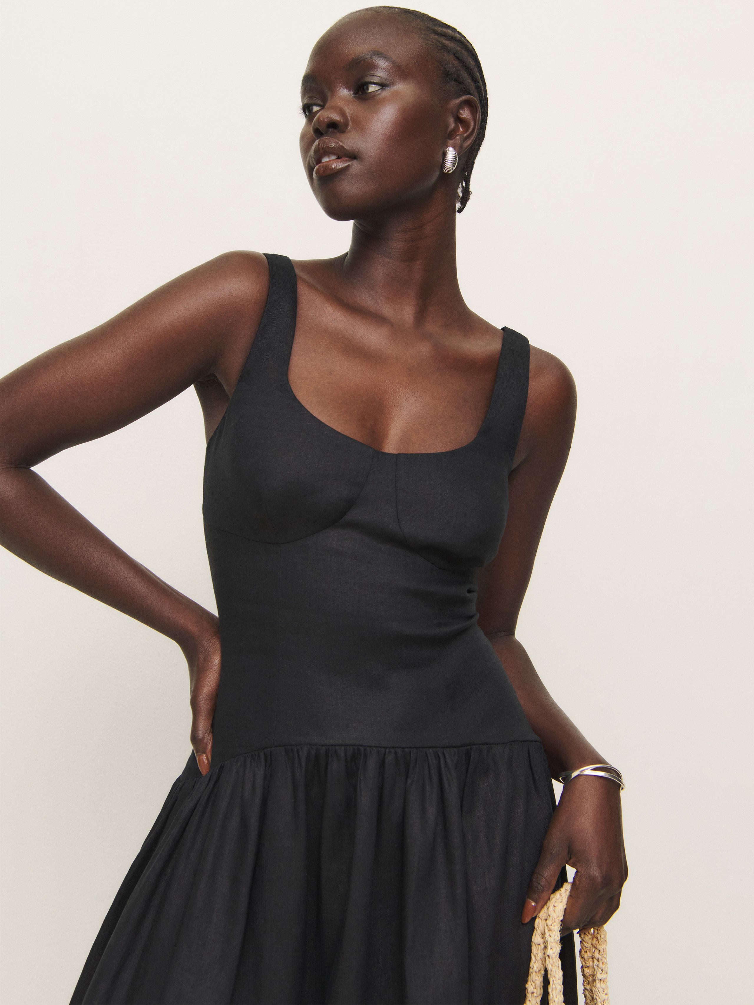 Easy breezy. Shop the Roslyn Linen Dress from Reformation, a sleeveless midi dress with a drop waist, bust cup seams, and pleating at the skirt.