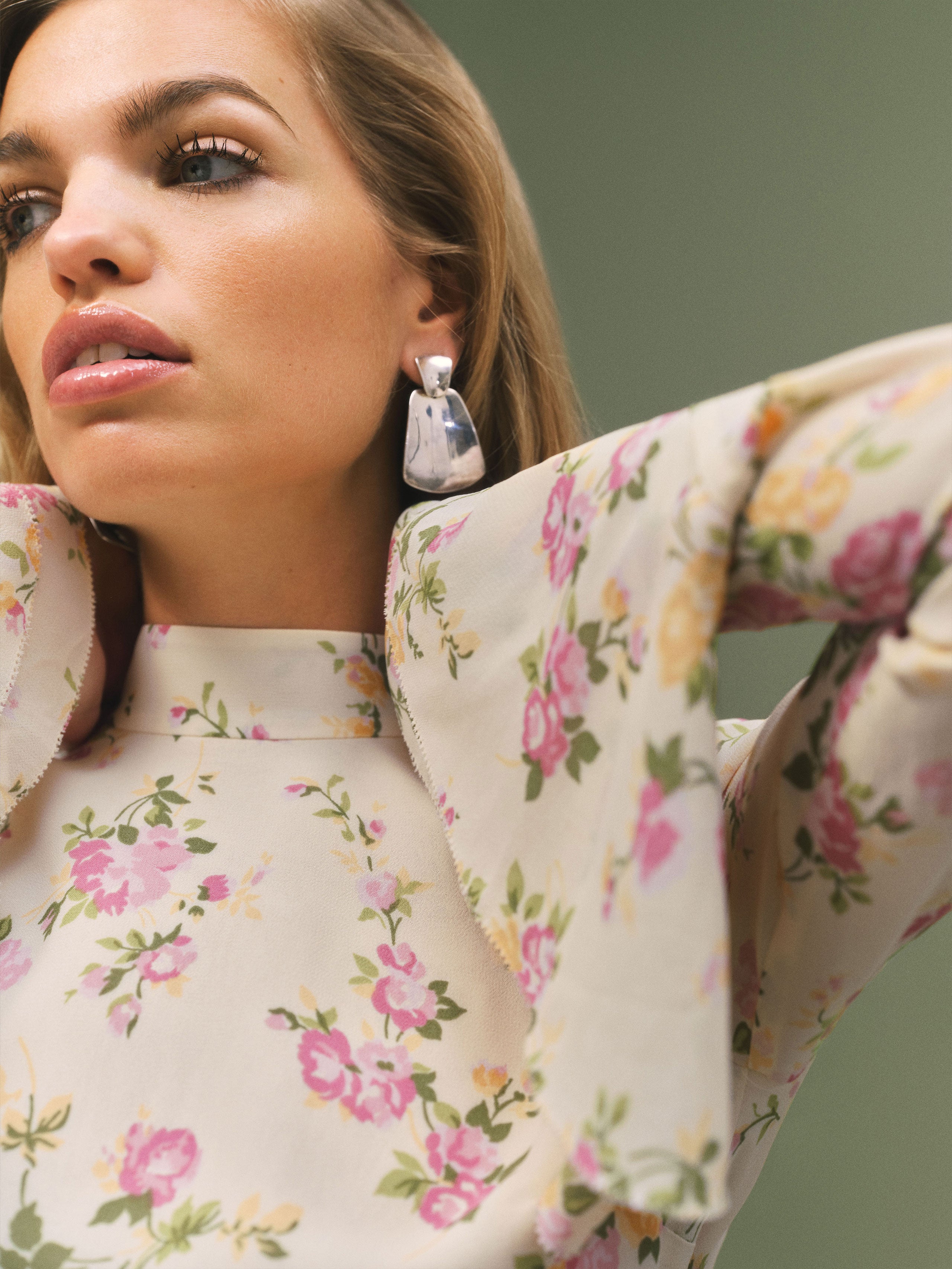 Up top. Shop the Roxana Top from Reformation, a long sleeve top with a mock neckline, flutter sleeves, and an open back.