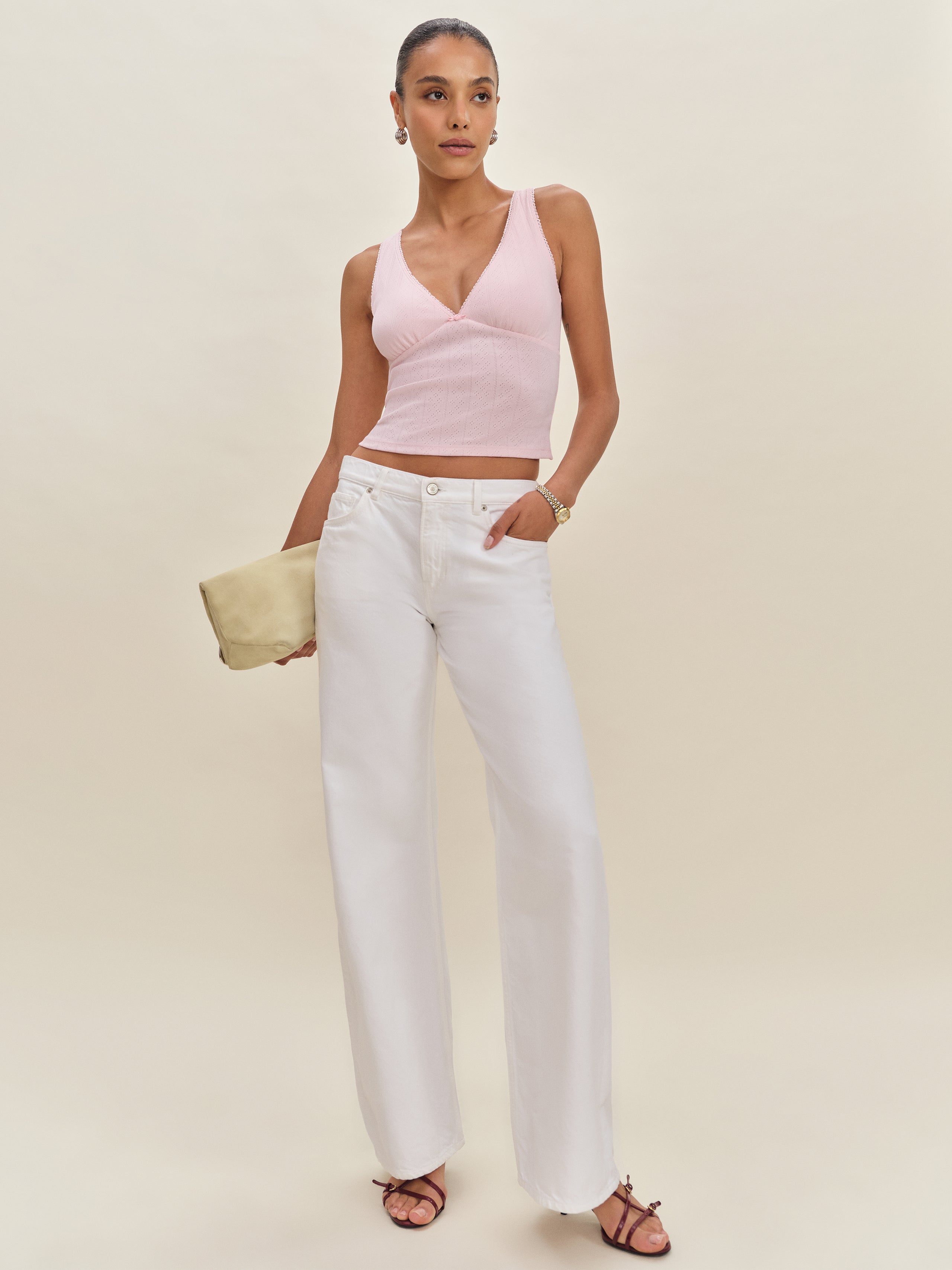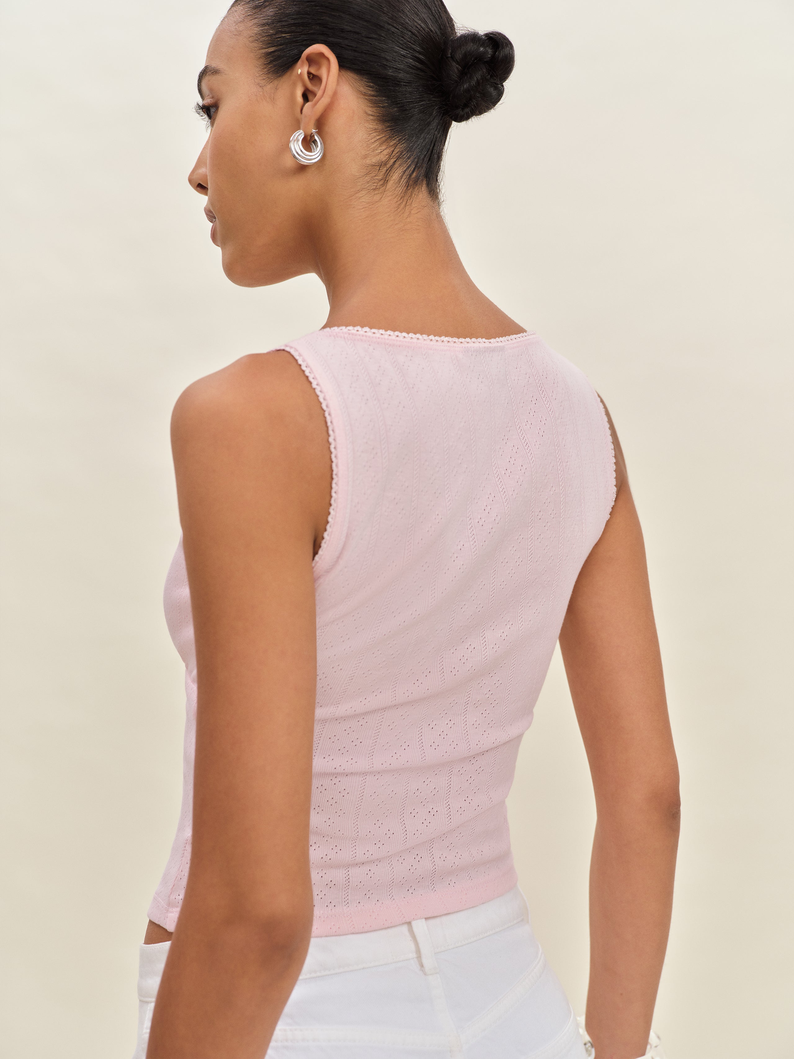 Up top. Shop the Rue Pointelle Knit Top from Reformation, a sleeveless knit tank with a v-neckline, scalloped trim, and bow detailing at the neck.