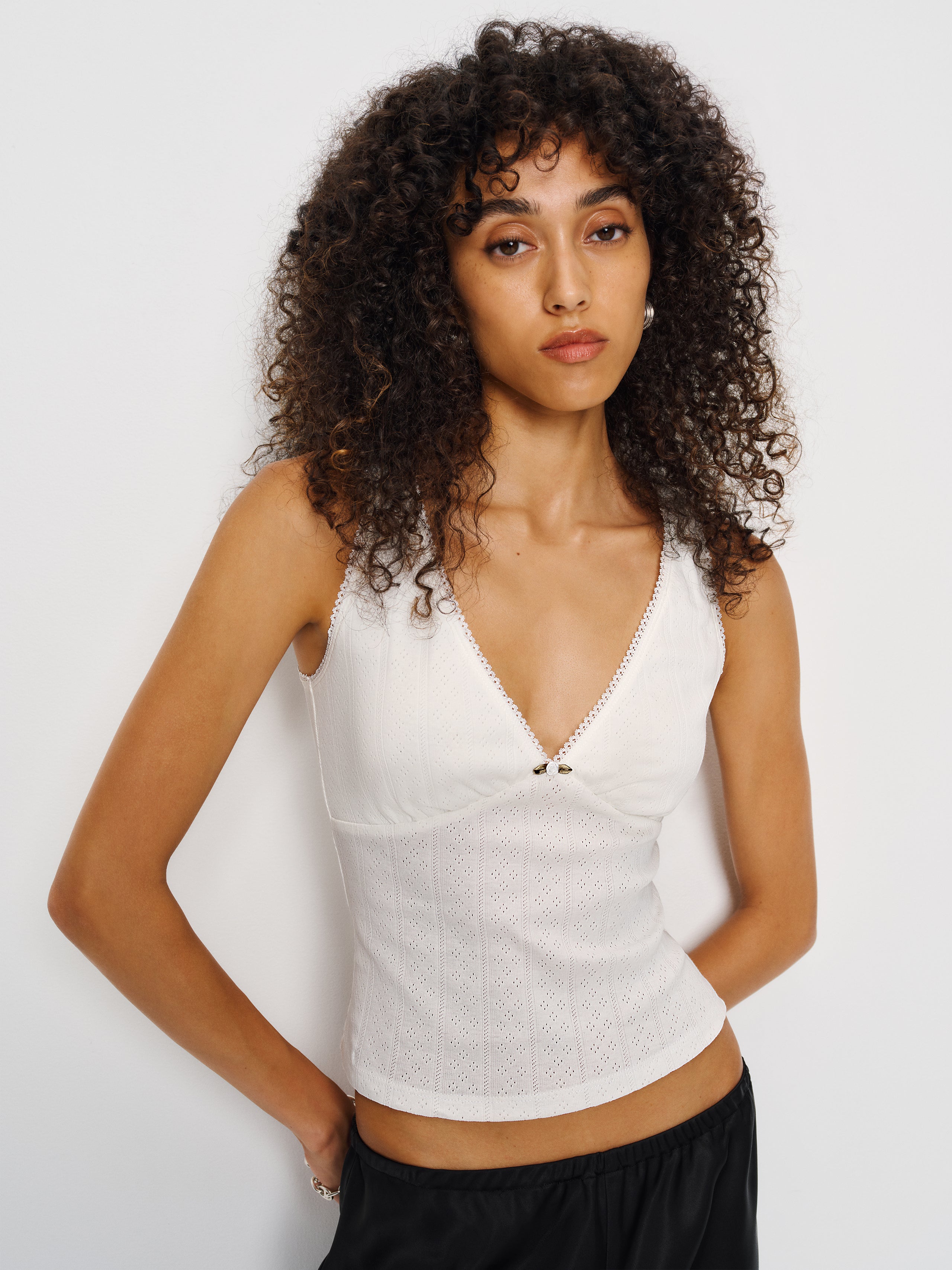 Up top. Shop the Rue Pointelle Knit Top from Reformation, a sleeveless knit tank with a v-neckline,...