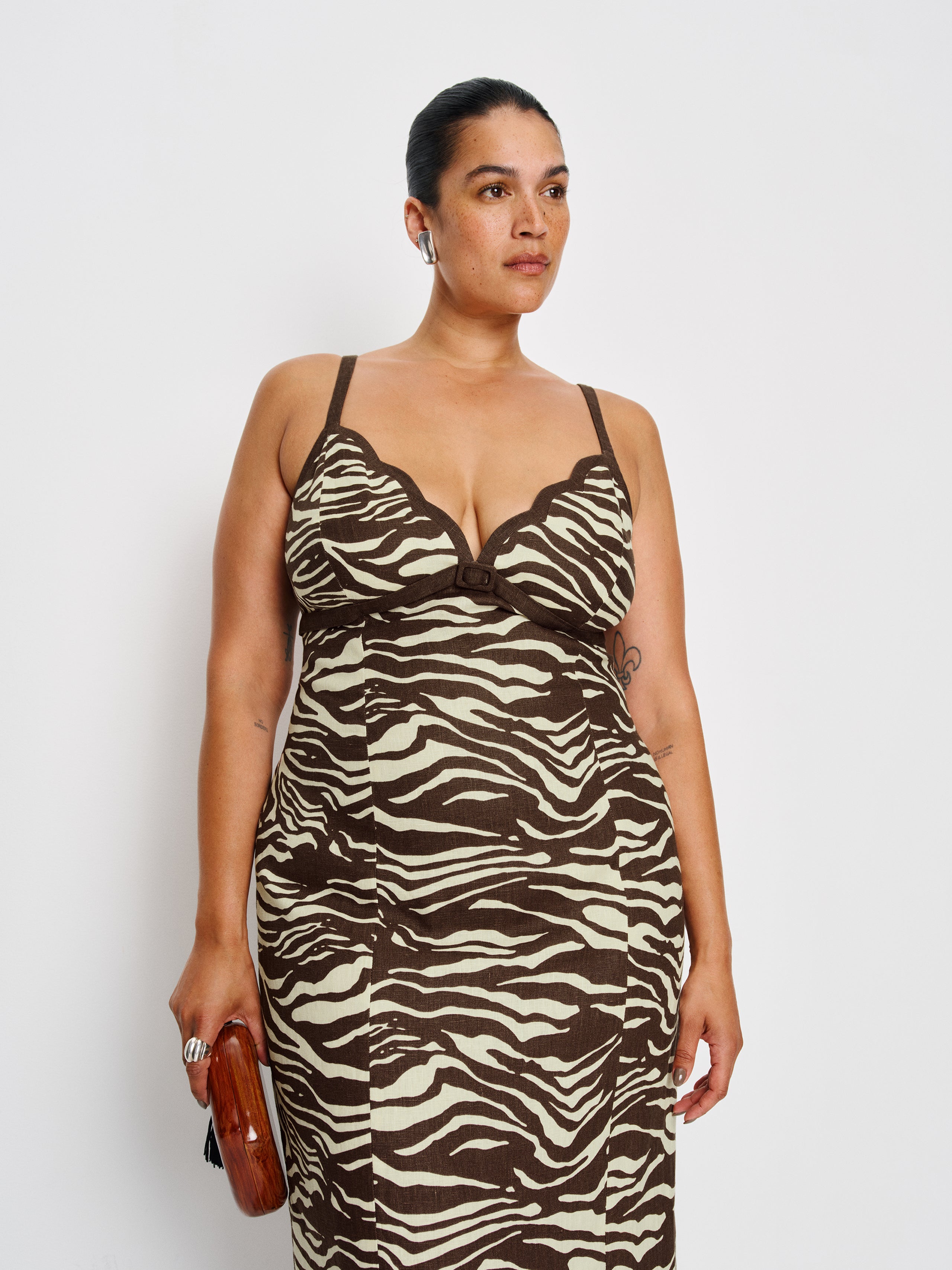 Sorry to all your other dresses. Shop the Sara Linen Dress ES from Reformation, a sleeveless midi dress with scalloped trim and contrast stitching.