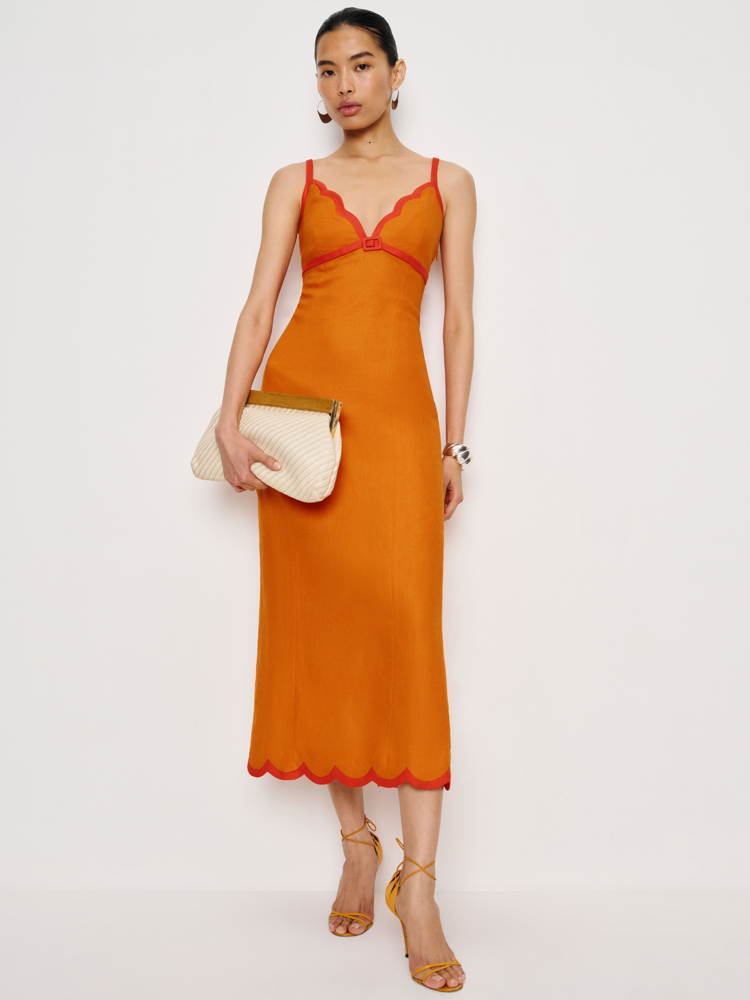 Sorry to all your other dresses. Shop the Sara Linen Dress from Reformation, a sleeveless midi dress with scalloped trim and contrast stitching.