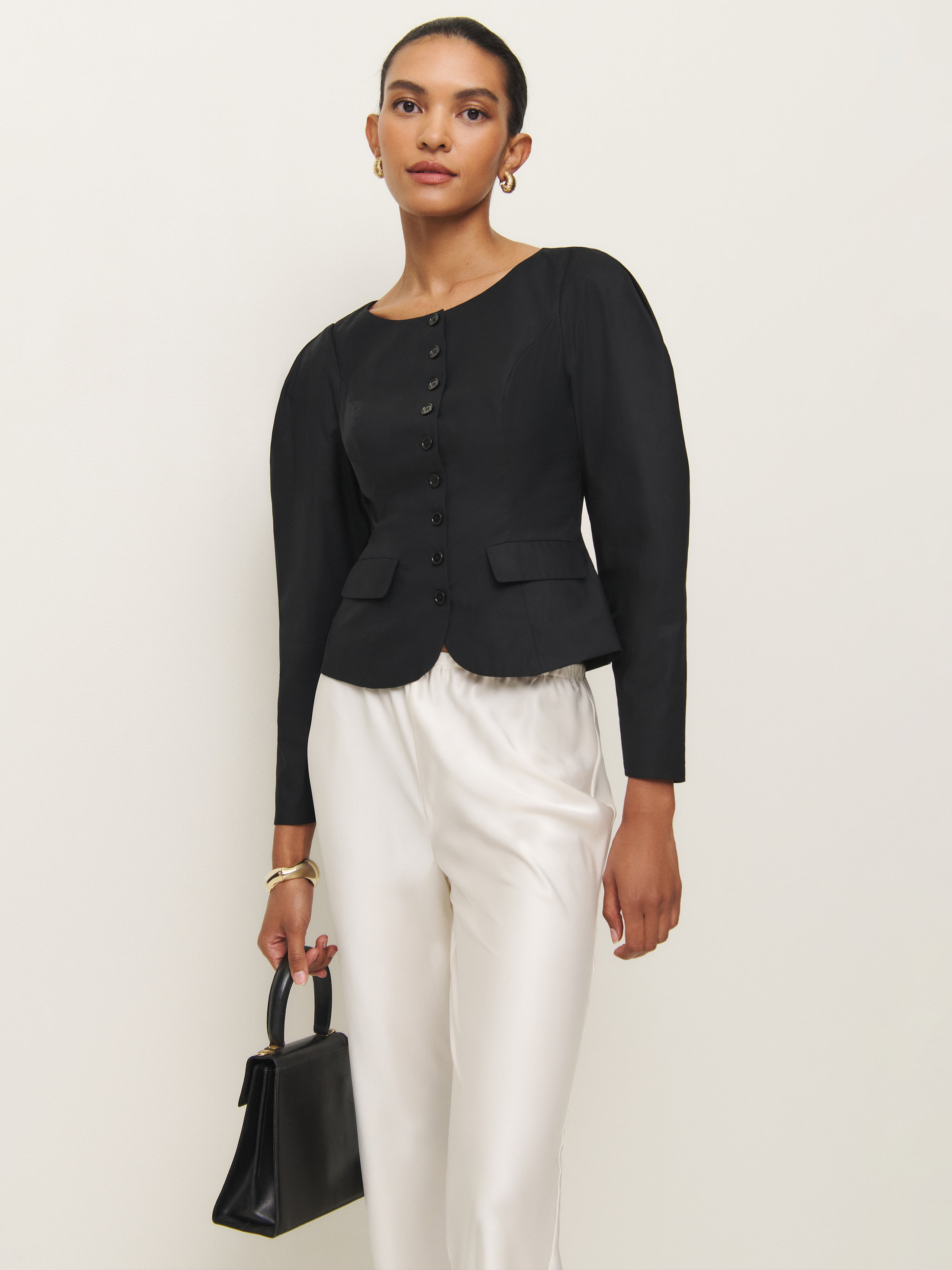 Buttoned up. Shop the Sarai Top from Reformation, a long-sleeve top with a high scoop neckline, button front, and puff sleeves.