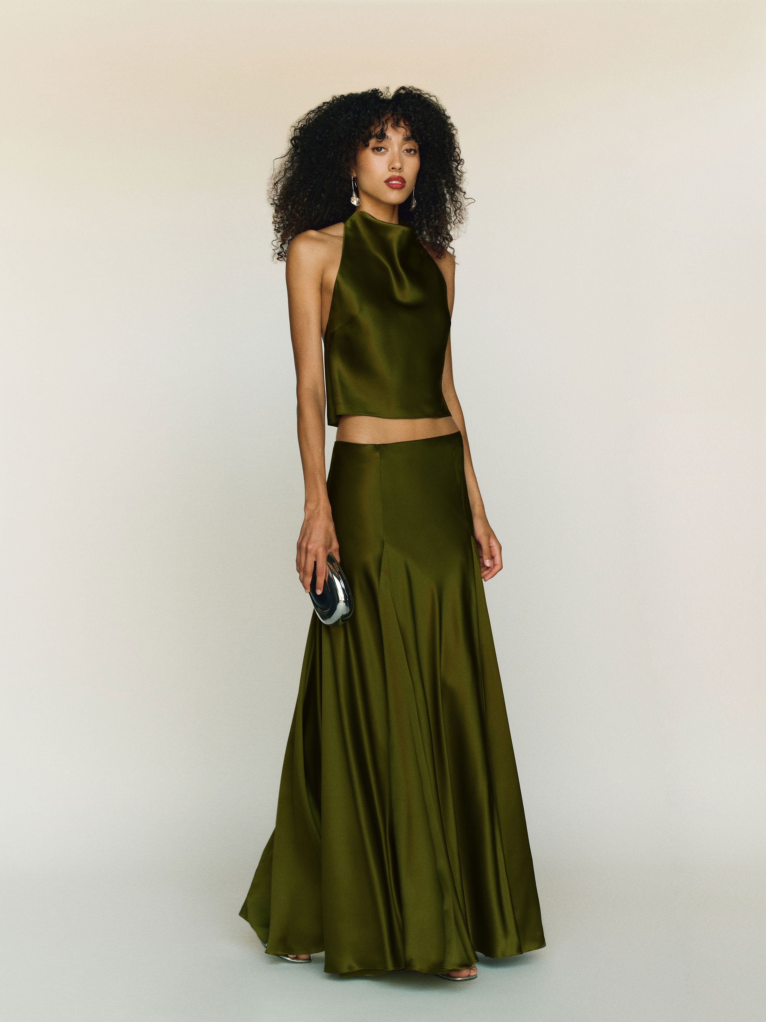 Shop the Sera Silk Two Piece from Reformation, a two piece set with a sleeveless cowl neck...