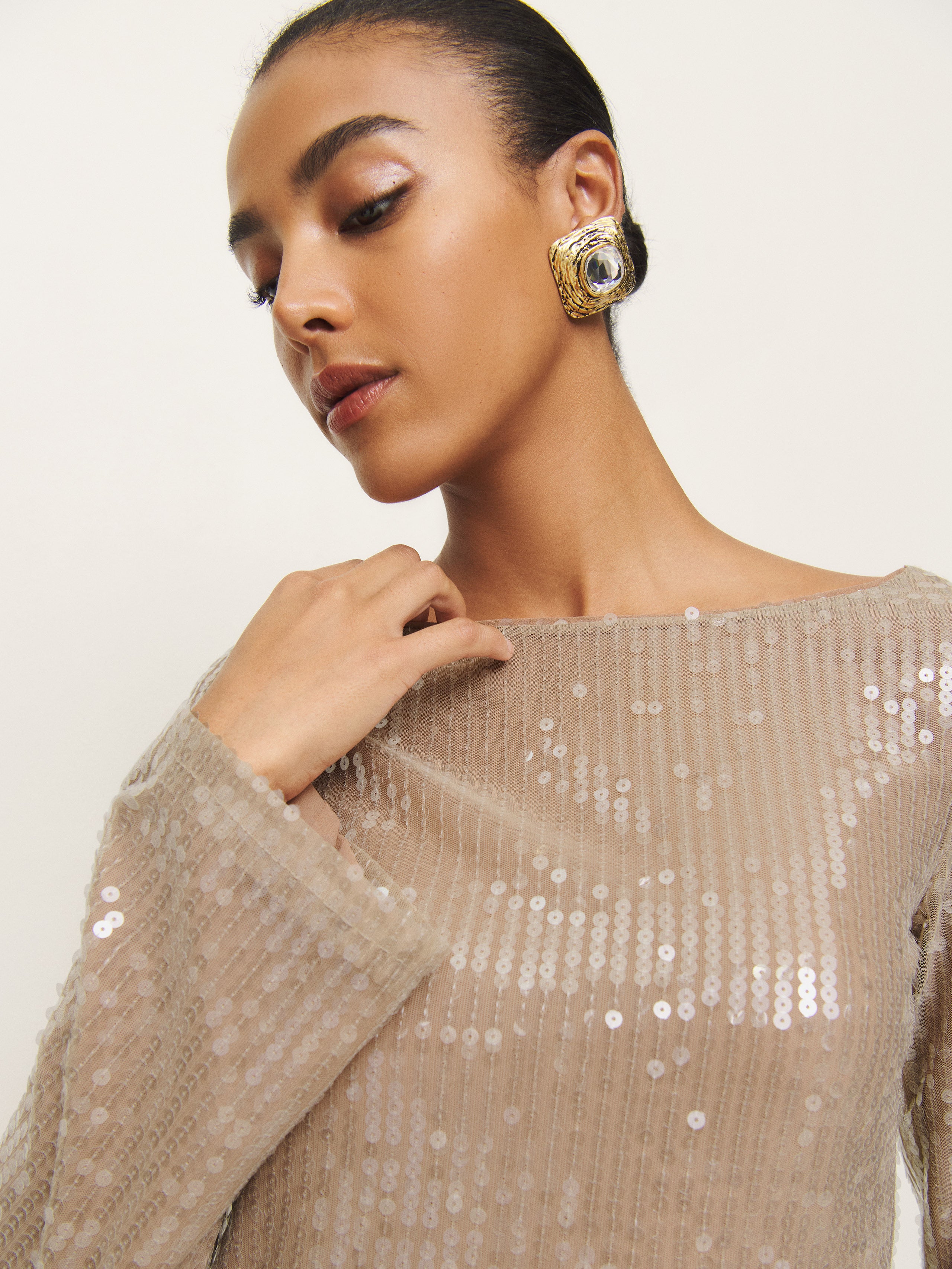 Wear me. Shop the Sereia Dress from Reformation, a long-sleeved mini dress with a high boat neckline and open back.