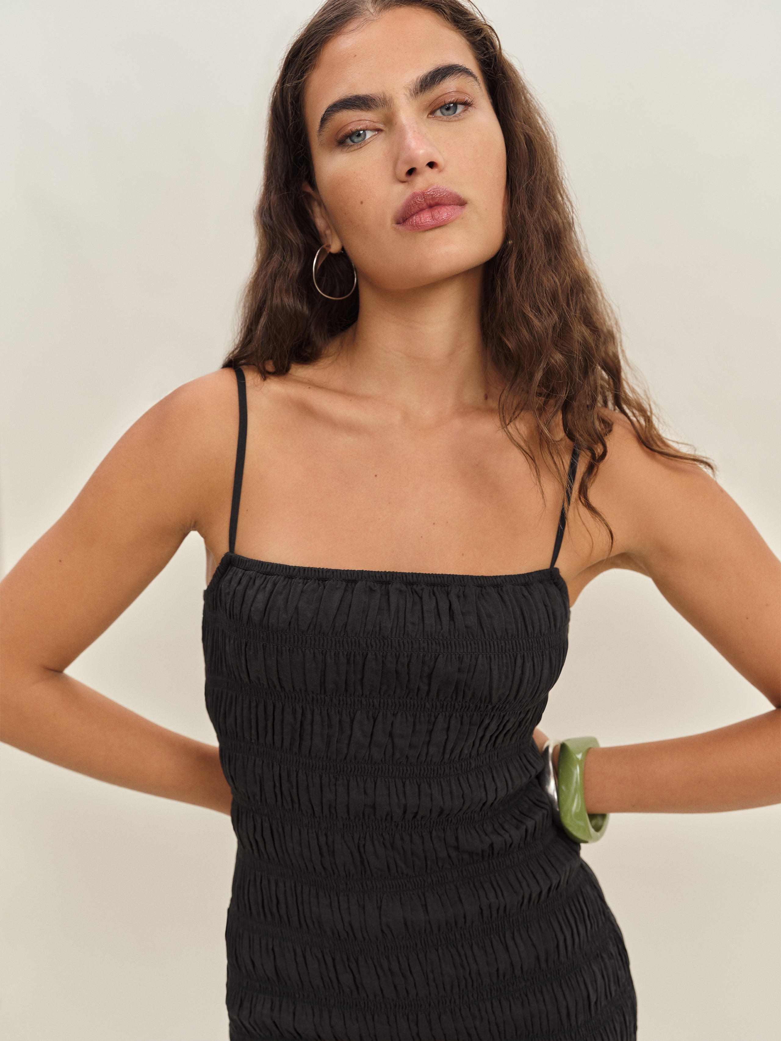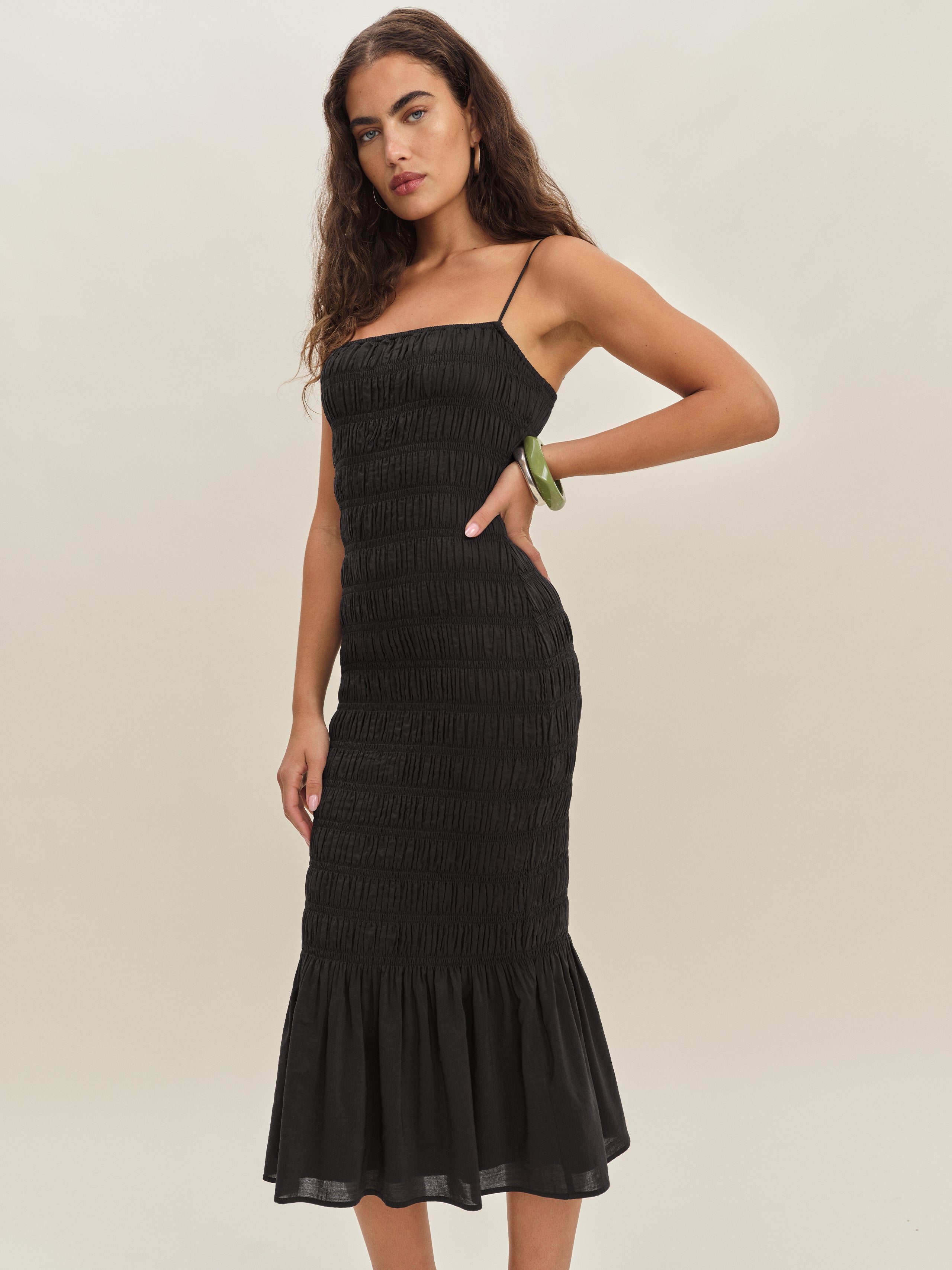 Shop the Seren Dress from Reformation, a sleeveless midi dress with a square neckline, shirring throughout, and a ruffle hem.