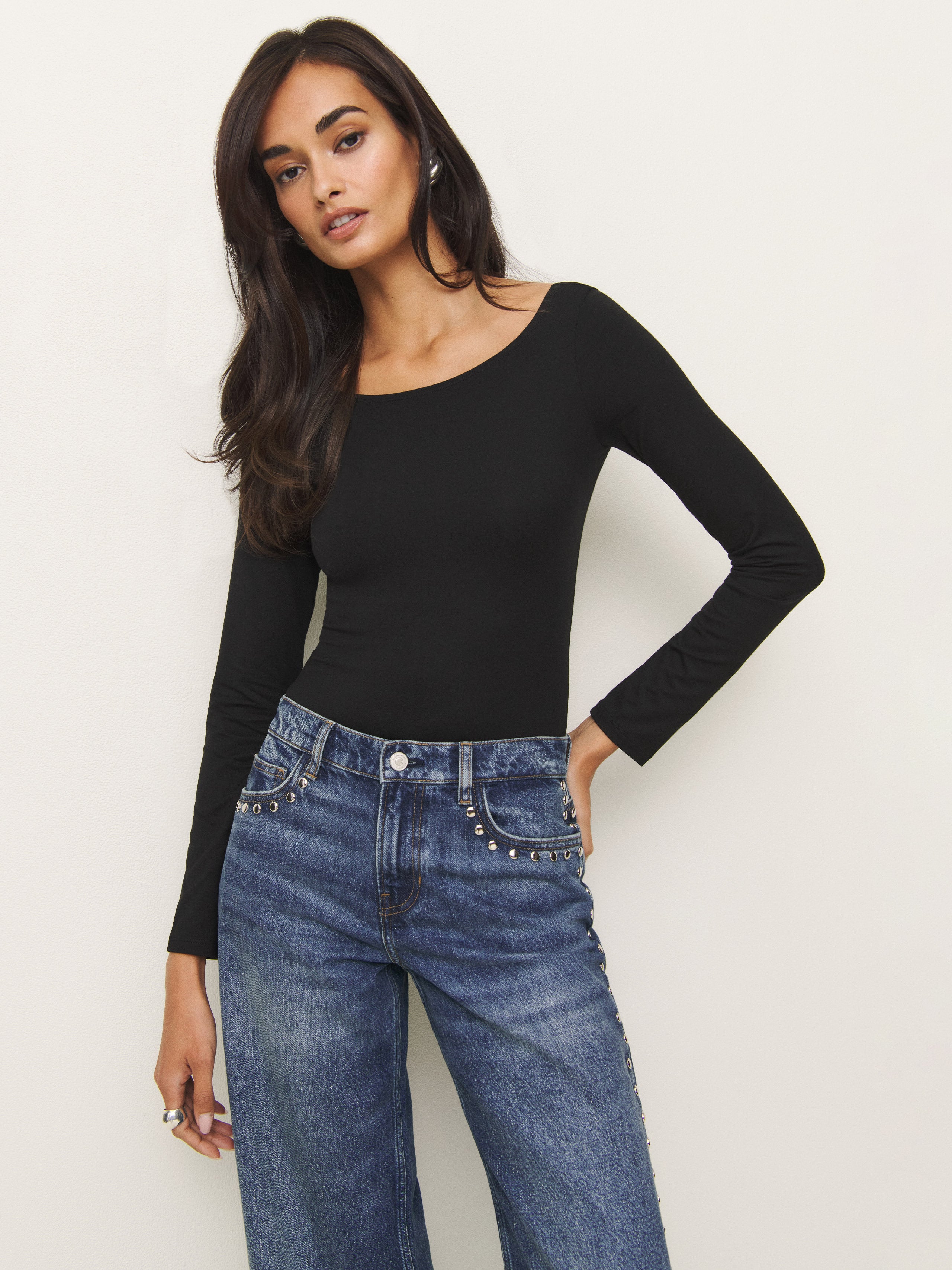Soft and stretchy. Shop the Serene Knit Bodysuit from Reformation, a long-sleeved bodysuit with a boat neckline.