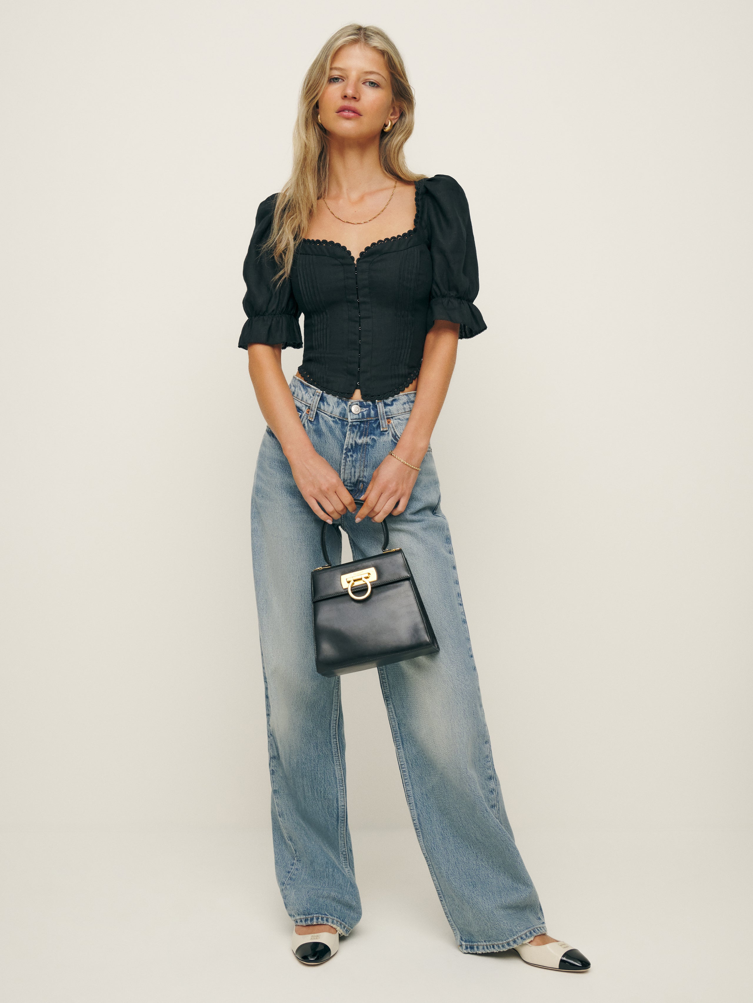 Up top. Shop the Simmie Linen Top from Reformation, a fitted top with puff sleeves, a sweetheart neckline, and embroidered details along the neckline and hem.