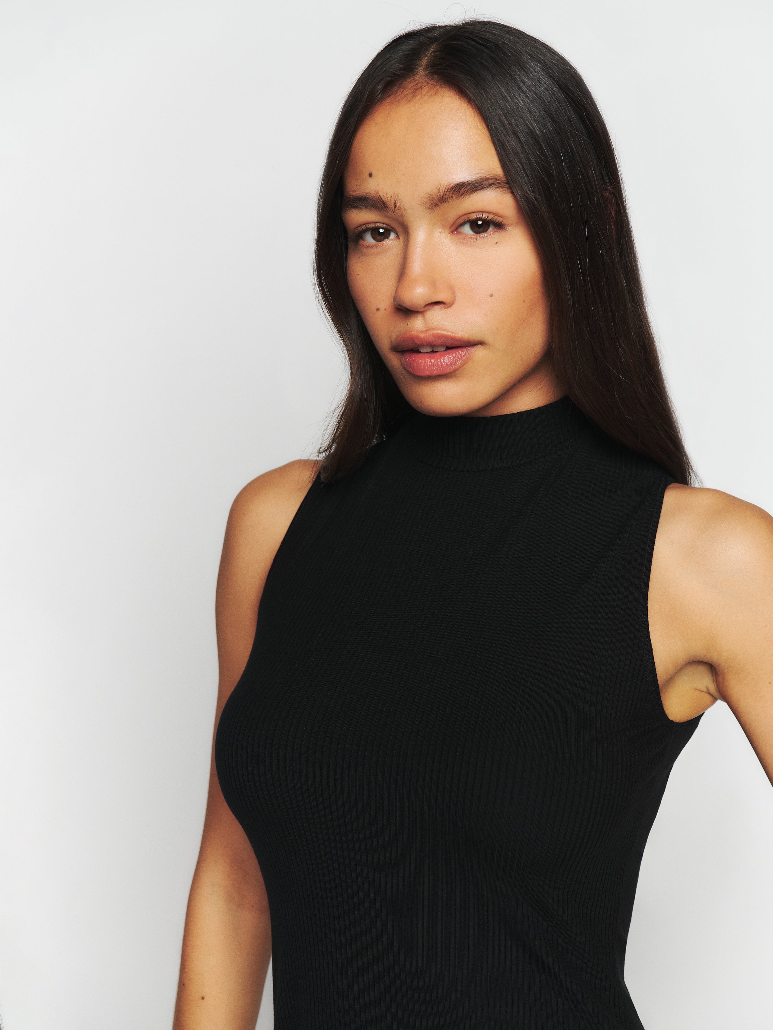 Throw on and go. Shop the Skylar Knit Dress from Reformation, a sleeveless, mini dress with a mock neckline, side slit and bodycon silhouette.