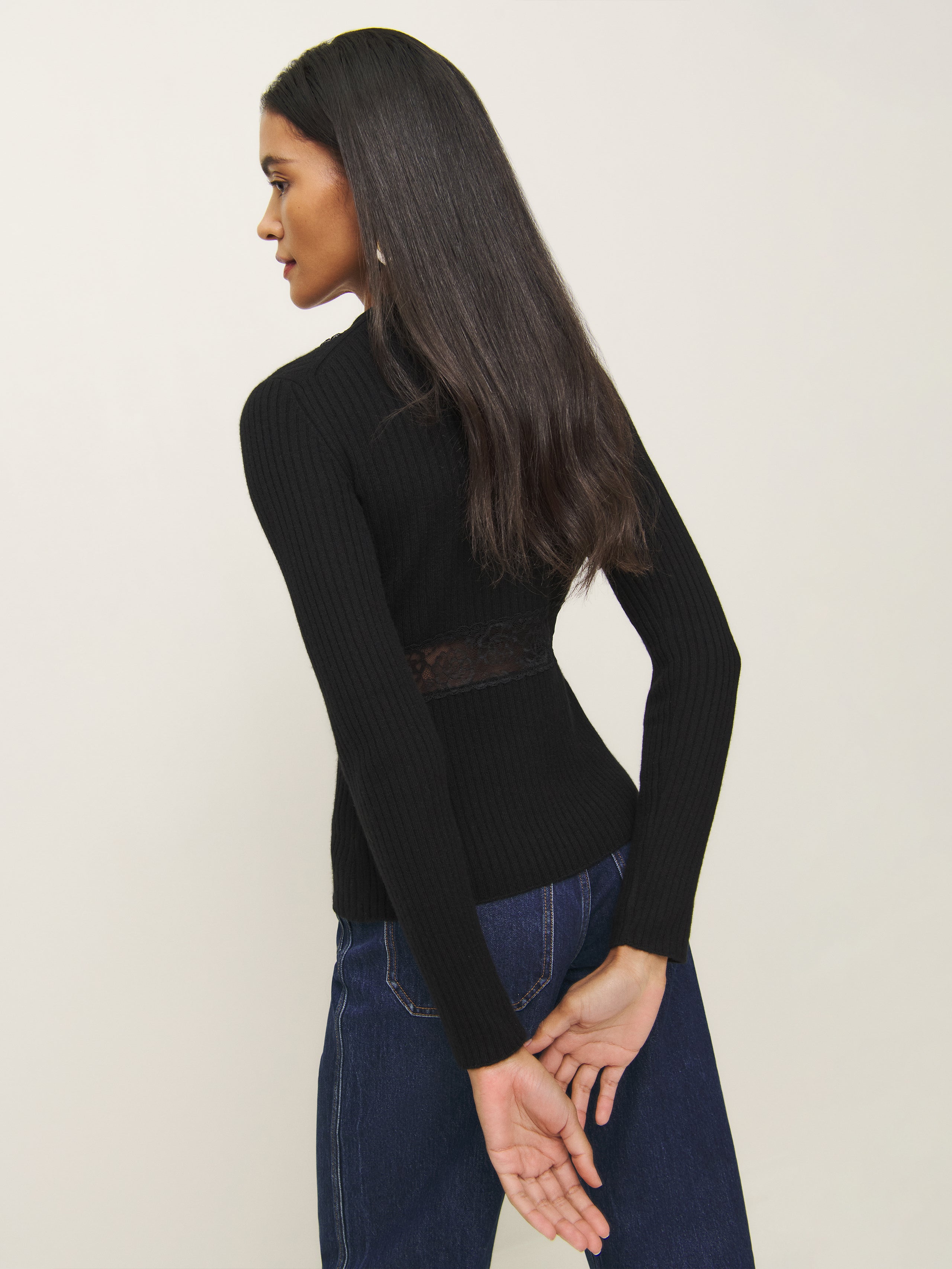 Up top. Shop the Sunnvia Lace Cashmere Cardigan from Reformation, a slim-fitting cardigan with a deep v-neckline, button front, split hem, and lace detailing.