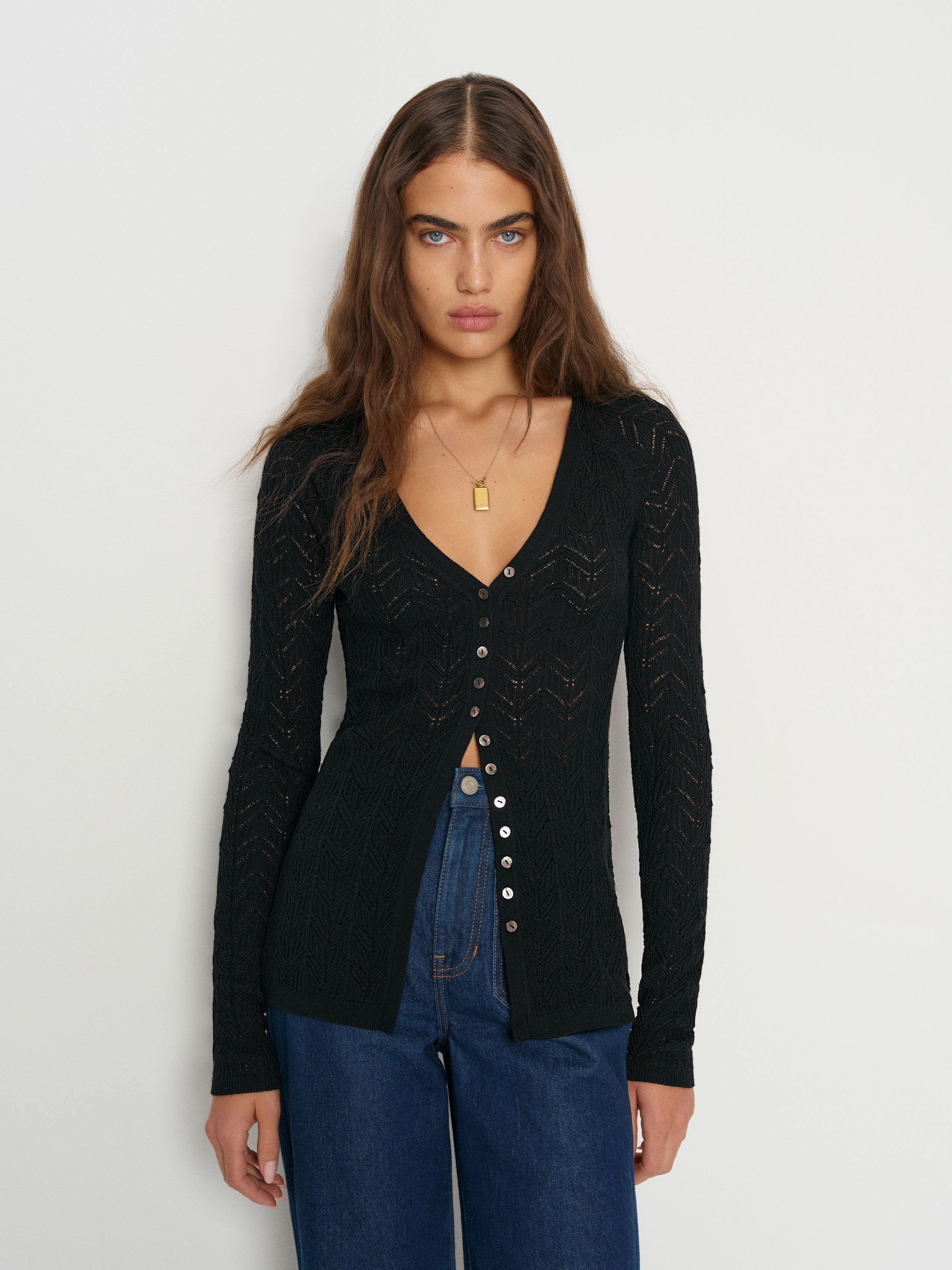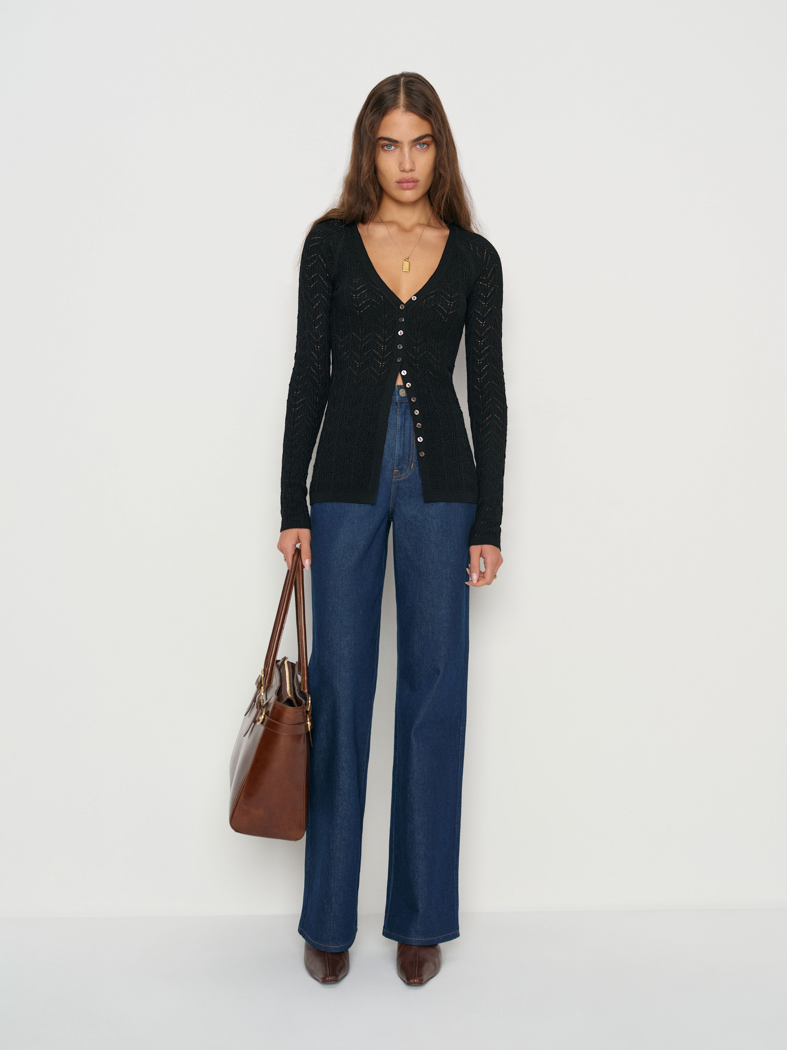 Easy little knit. Shop the Sutton Regenerative Merino Open Knit Sweater from Reformation, a long-sleeved open-knit sweater...