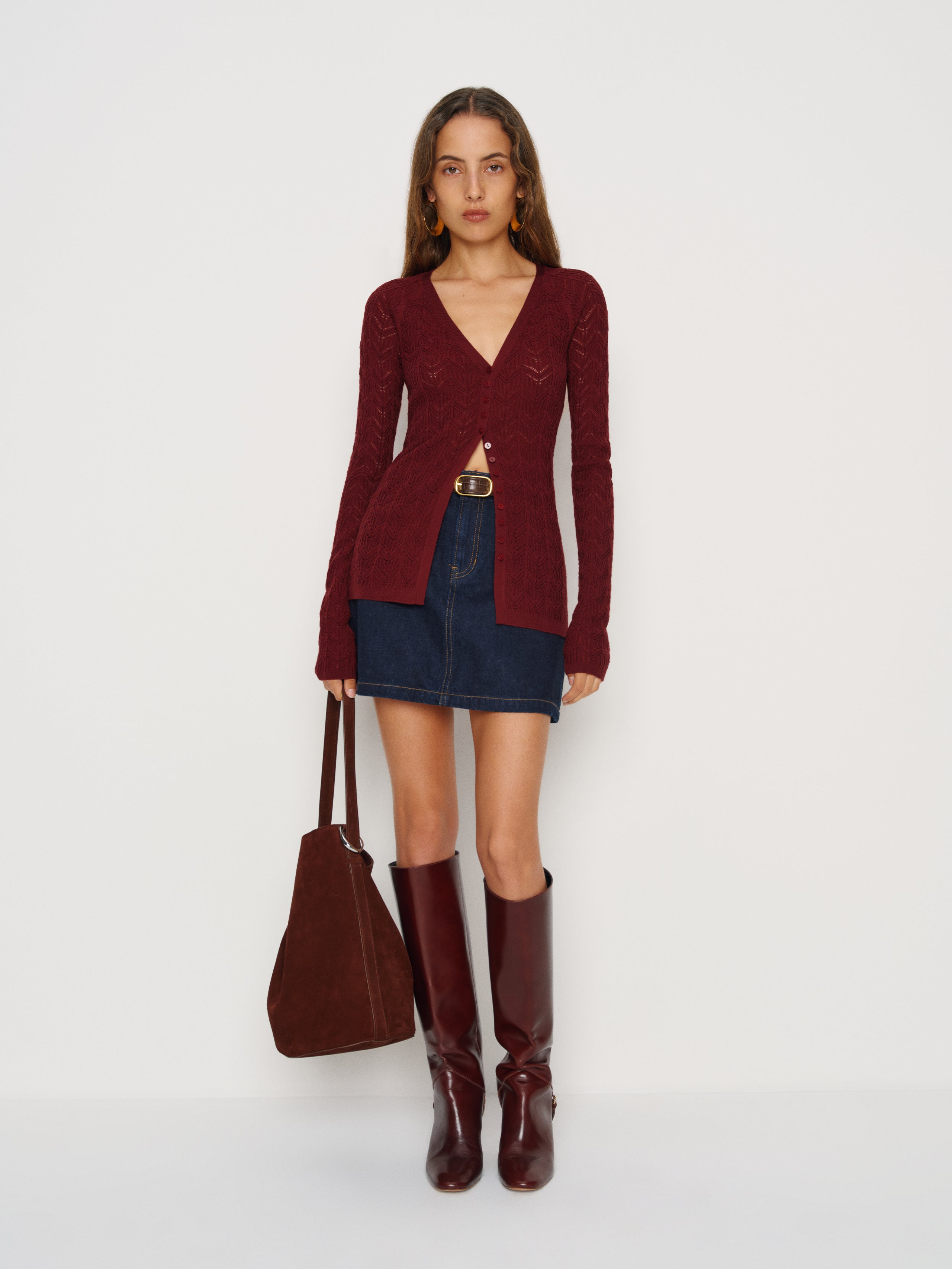 Easy little knit. Shop the Sutton Regenerative Merino Open Knit Sweater from Reformation, a long-sleeved open-knit sweater with a V-neckline and button front.